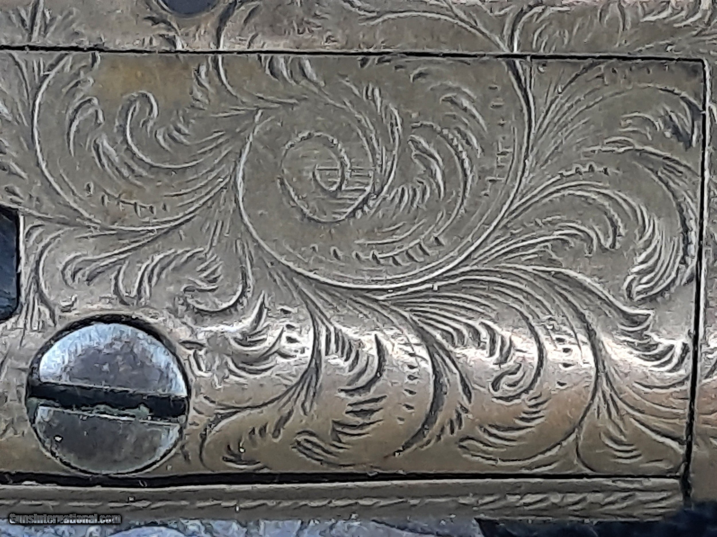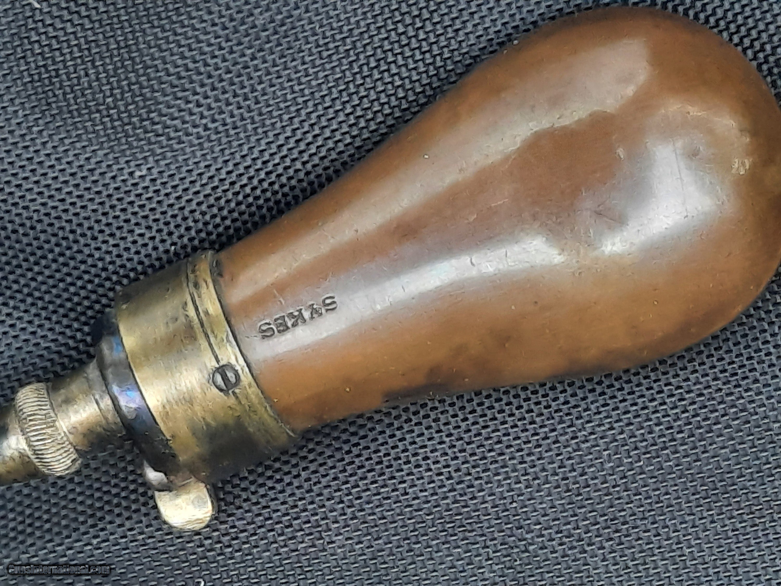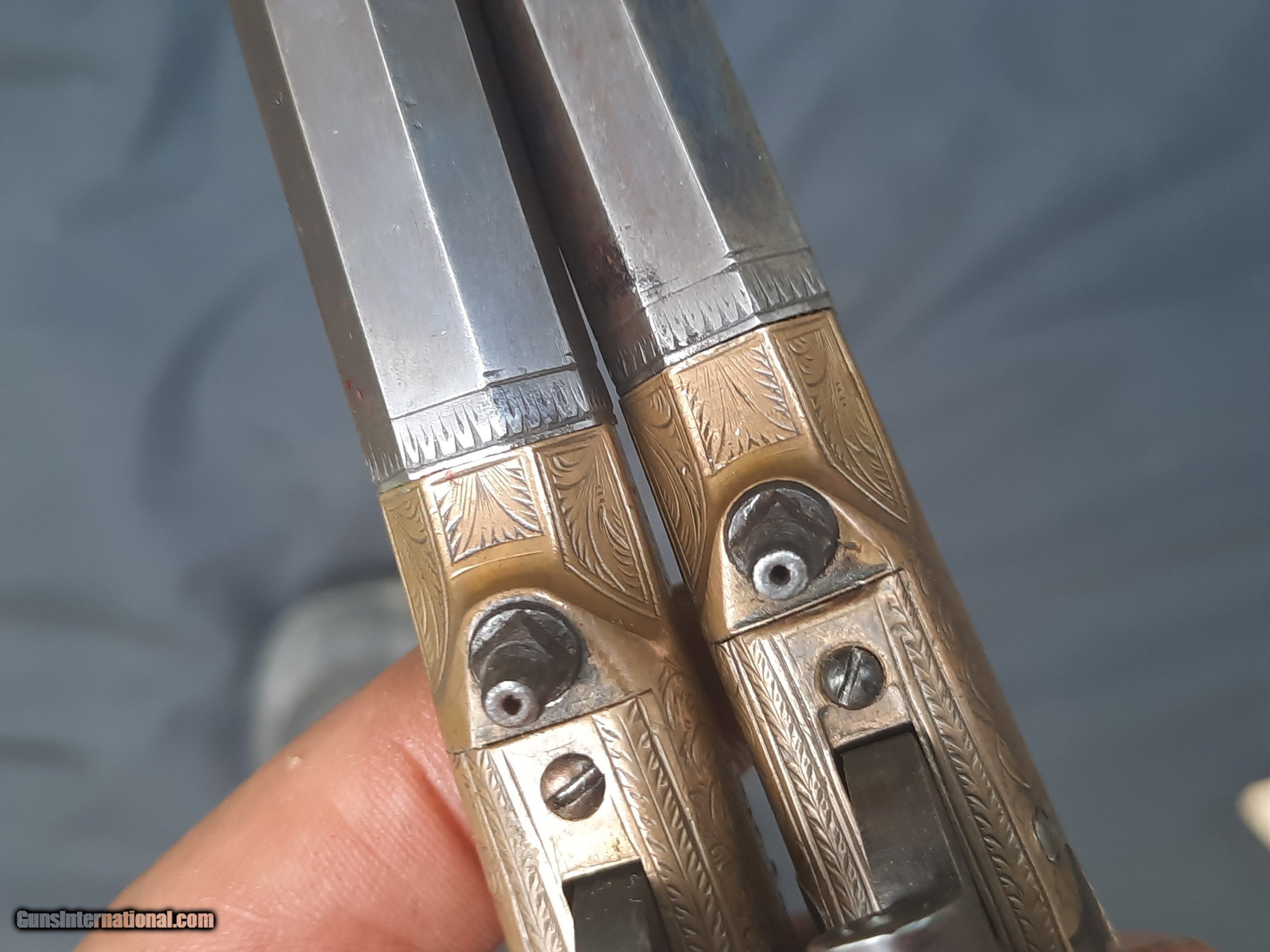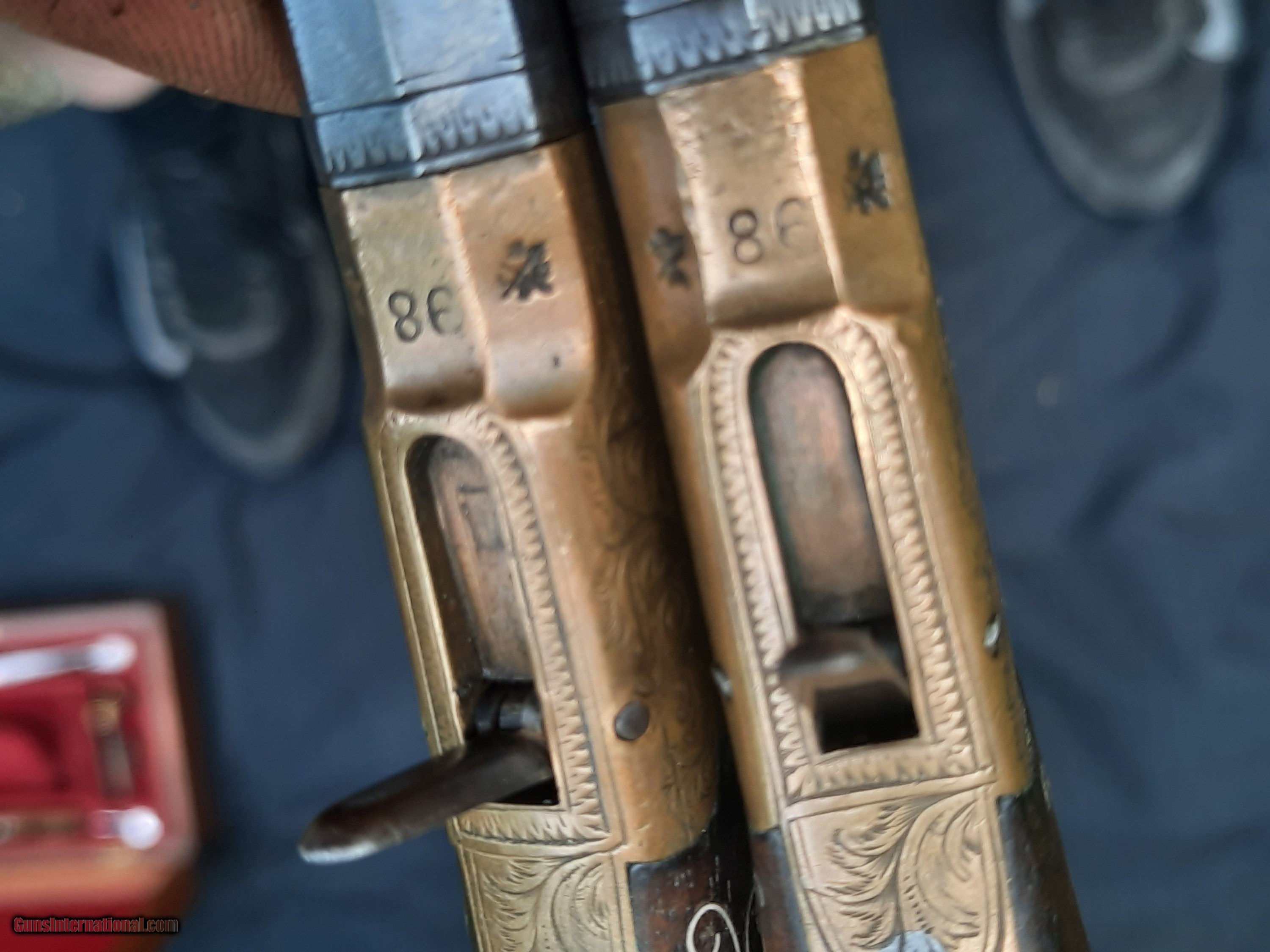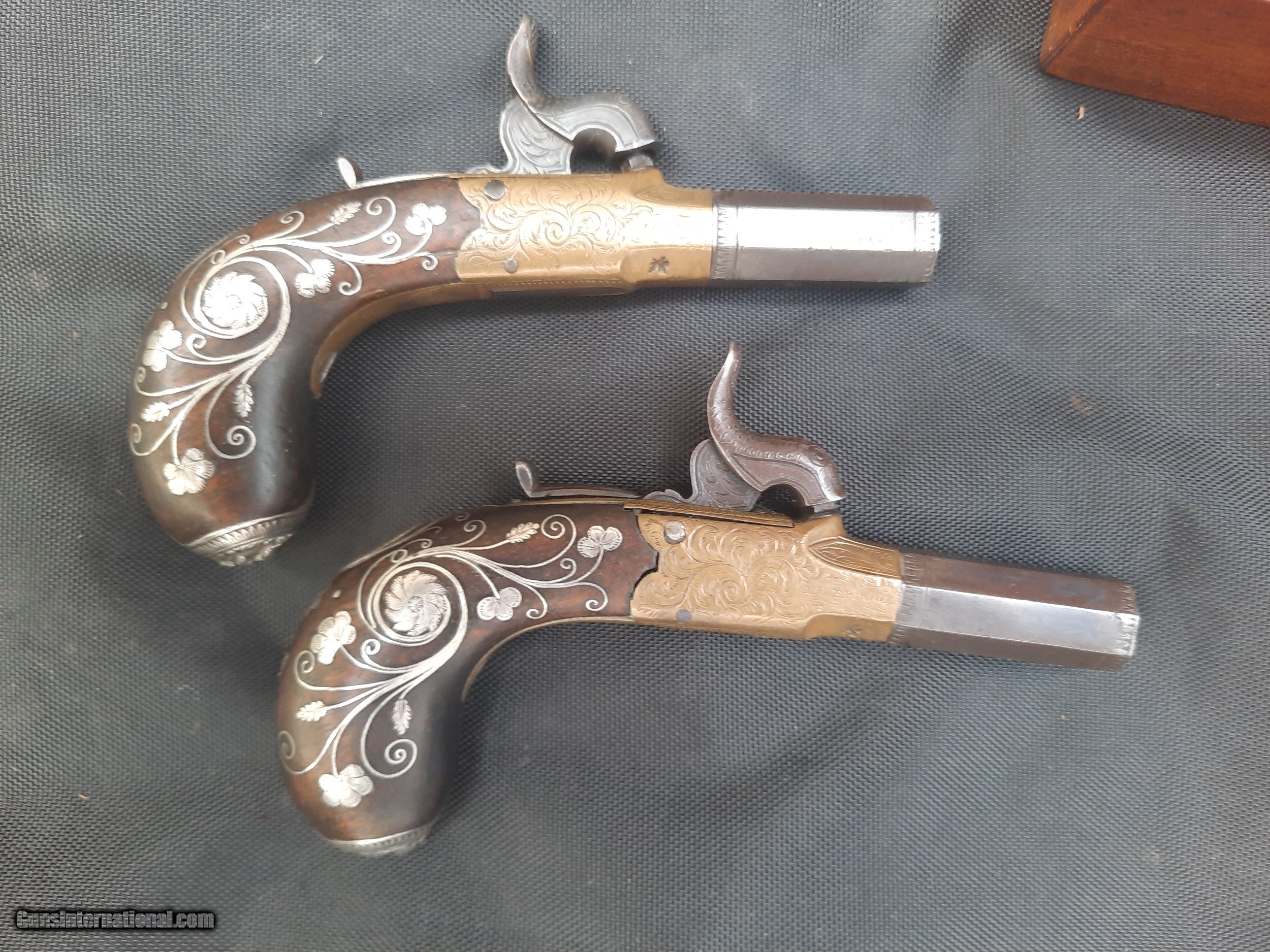 Description: I have e a beautiful original cased set of percussion pistols made by Richardson Liverpool about 1845.The matched pair have ornate silver wire inlay that is 100 percent intact.The pistols have a detailed sterling silver lion's head butt caps.The brass frames are finely engraved and the the makers name and city engraved into them.The octagon barrels unscrew with finger pressure and about 44 cal.The actions on both pistols work perfect very crisp. The trigger snaps down when in full cock position.The original case comes with the following accessories A very well made copper powder flask stamped SYKES,a dual purpose barrel wrench and mold,cap tin by R D WALKERS a brass cleaning rod with two attachments and the proper key to the case.A very attractive pair of pistols complete and all original.Shipping will be $45.00 in the lower 48 States actual cost everywhere else SOLD Antique: Yes |