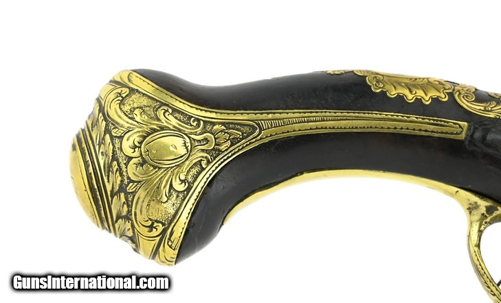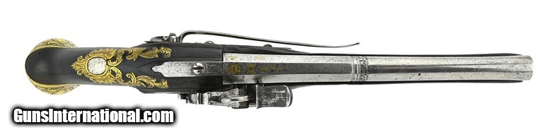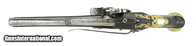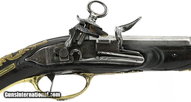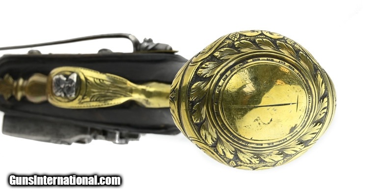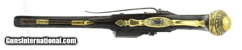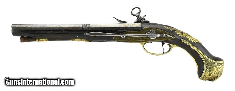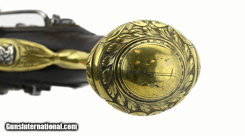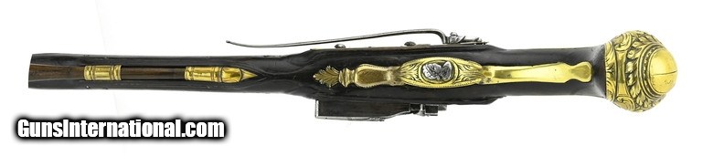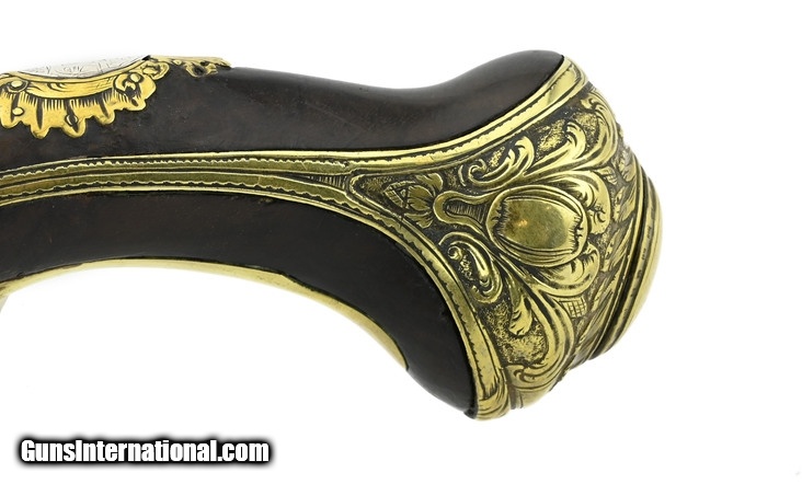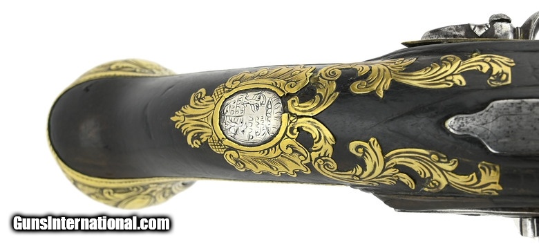 Description: Spanish Pair of Miguelet Lock Pistols by Canivell. Listed as working in Spain in 1720. Fine pair with 10” two stage barrels (Octagon to round, engraved at the transition) Barrels are inlaid with Canivells maker sinks and Spanish Icons in Brass. The Locks, plates cock and frizzens are engraved in floral motifs as are the brass mounts. The trigger guard bows are silver inlaid with busts of the owner of the pistols as are the side plates. Each pistol has a silver roundel with an engraving of the owner’s family crest. The pistols are 16 ½” overall length. Both pistols have belt hooks at side plates. The actions both function perfectly. These are handsome pistols. SOLD Antique: Yes |