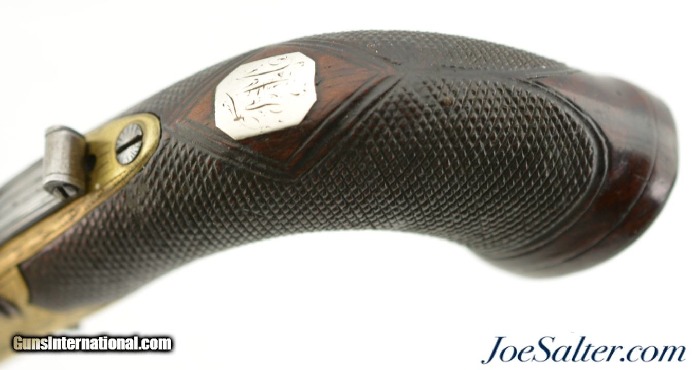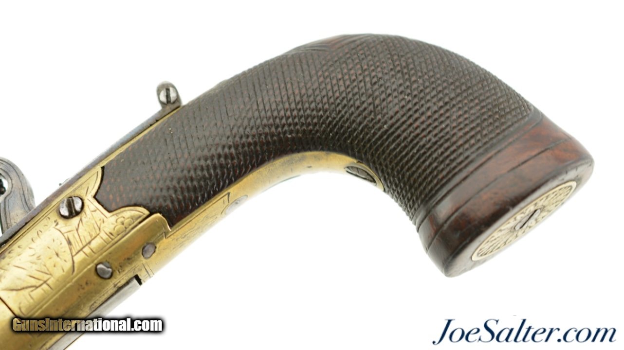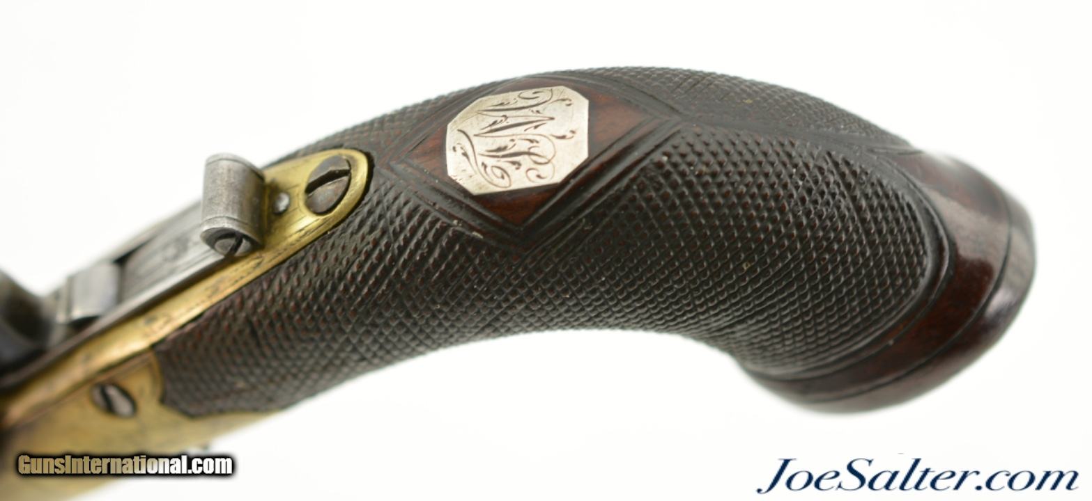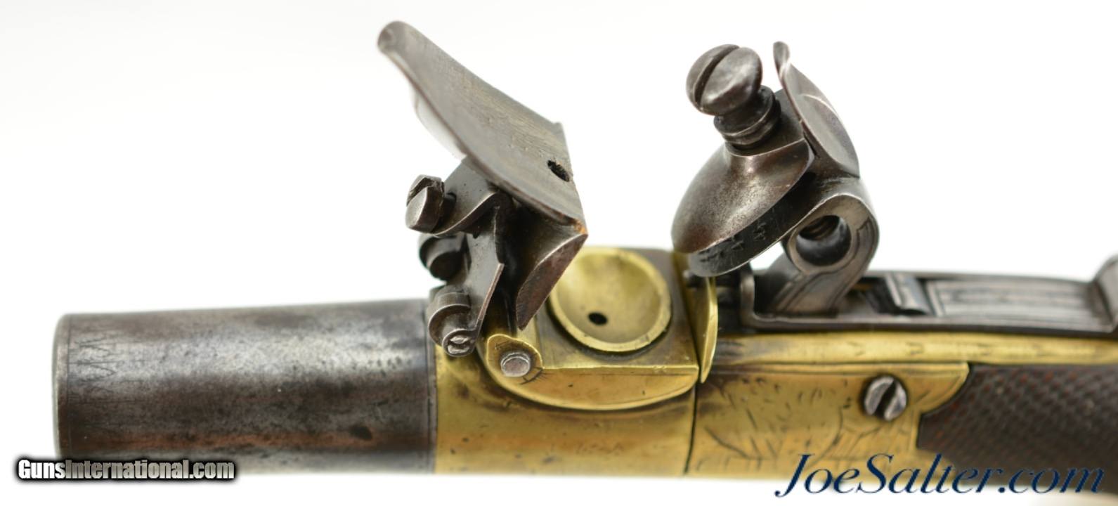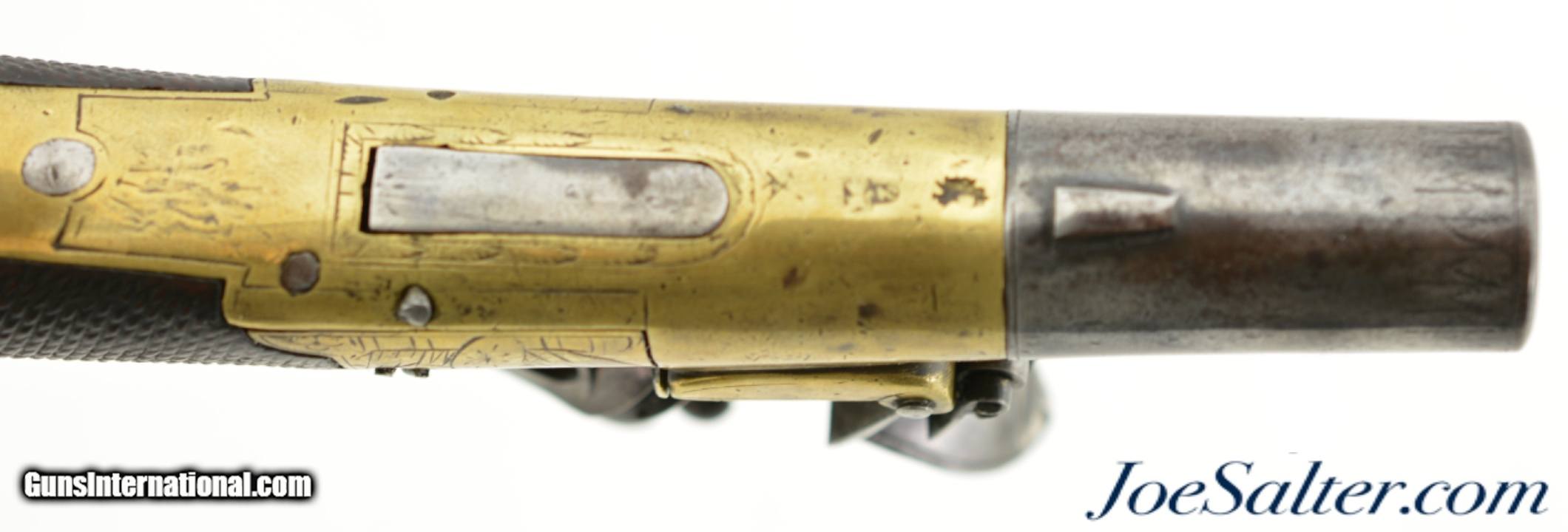 Description: NSN, .50 Caliber, 1 1/2" barrels with very good bores. These are well-made guns, dating from ca. 1790 & 1810, that have a mottled gray patina on the barrels, and a bright yellow patina on the brass frames. The frames retain the remnants of martial panoply engraving on both sides, with faint, partially legible "LONDON" markings on the right, and illegible maker or retailer markings on the left (possibly "BALK" but no London maker with that name is listed). The central cocks have traces of original blue still visible along the sides of the necks, and a dark gray-brown patina on the balance. The flared butt walnut grips have engraved caps and fine checkering with some flattened areas scattered about. The octagonal escutcheons are engraved with owner’s initials: "TM." The locks are fully functional, as are the sliding safeties. This is a very nice pair of London pocket pistols, and are in very good-near fine condition overall. Antique SOLD Antique: Yes |