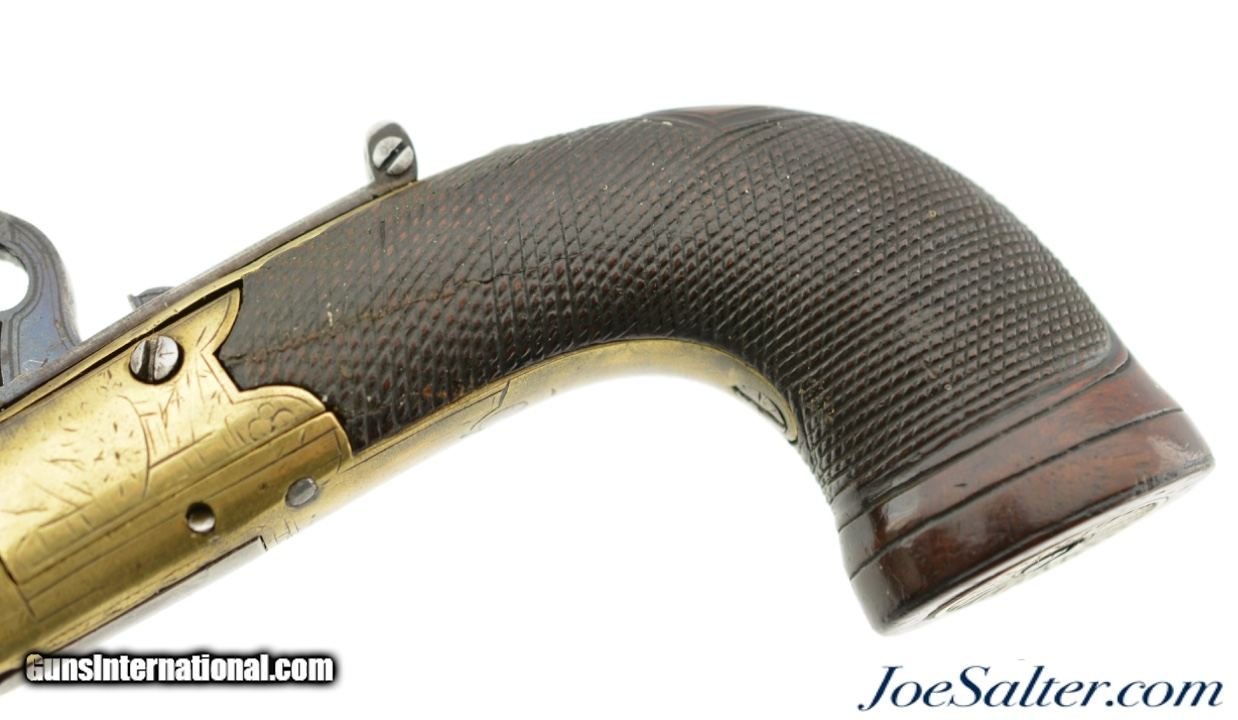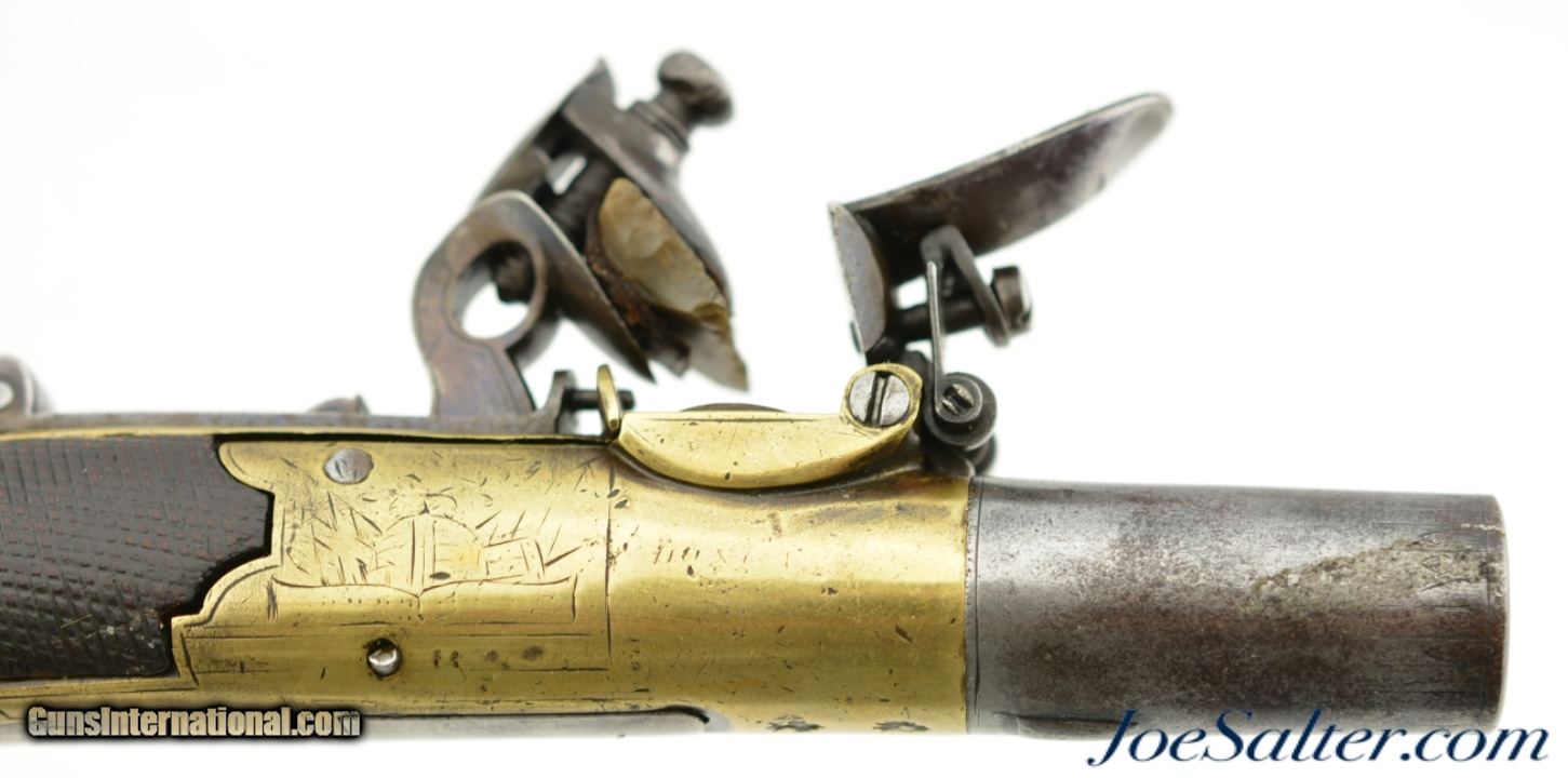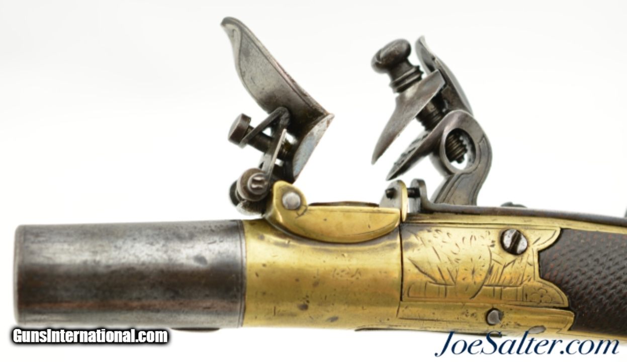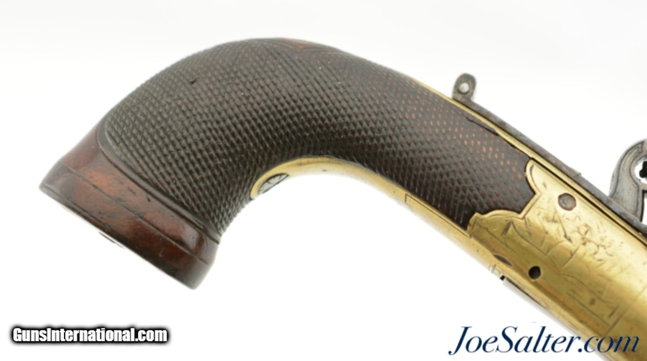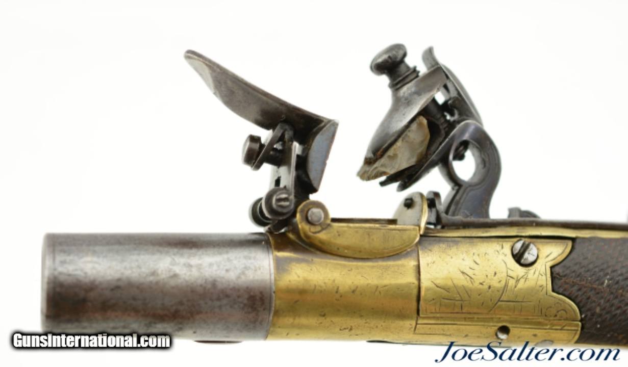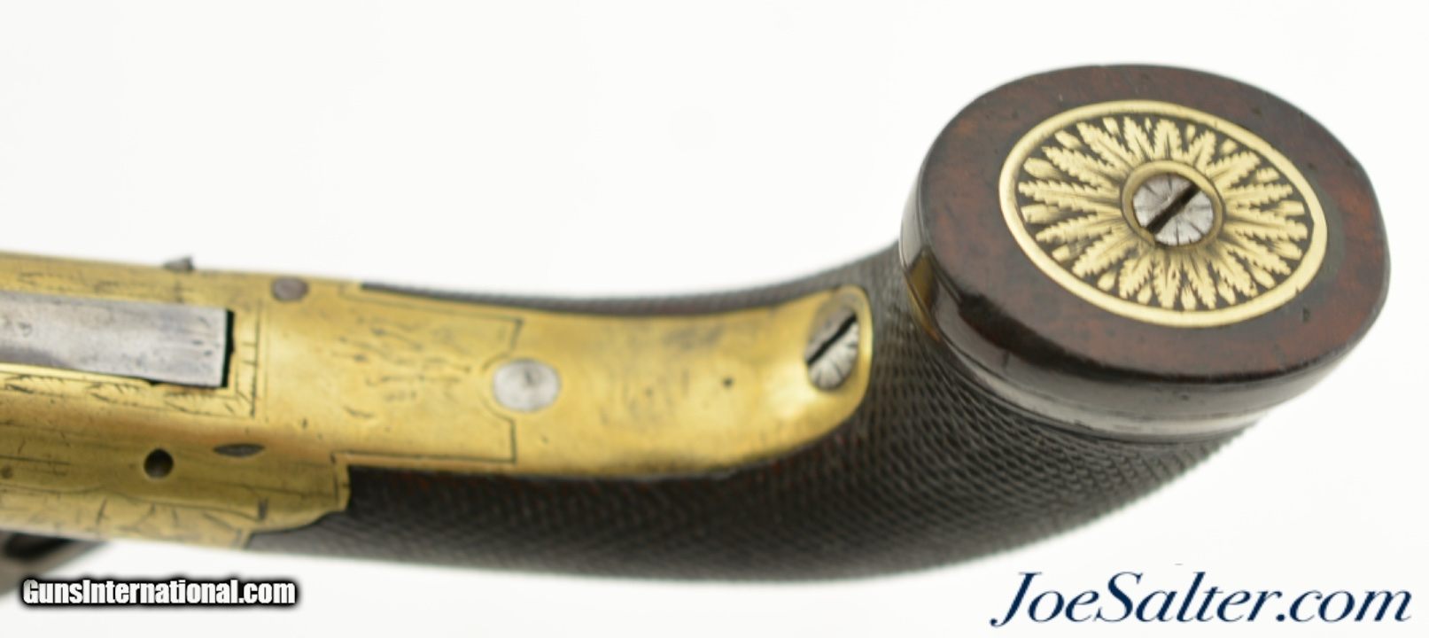 Description: NSN, .50 Caliber, 1 1/2" barrels with very good bores. These are well-made guns, dating from ca. 1790 & 1810, that have a mottled gray patina on the barrels, and a bright yellow patina on the brass frames. The frames retain the remnants of martial panoply engraving on both sides, with faint, partially legible "LONDON" markings on the right, and illegible maker or retailer markings on the left (possibly "BALK" but no London maker with that name is listed). The central cocks have traces of original blue still visible along the sides of the necks, and a dark gray-brown patina on the balance. The flared butt walnut grips have engraved caps and fine checkering with some flattened areas scattered about. The octagonal escutcheons are engraved with owner’s initials: "TM." The locks are fully functional, as are the sliding safeties. This is a very nice pair of London pocket pistols, and are in very good-near fine condition overall. Antique SOLD Antique: Yes |