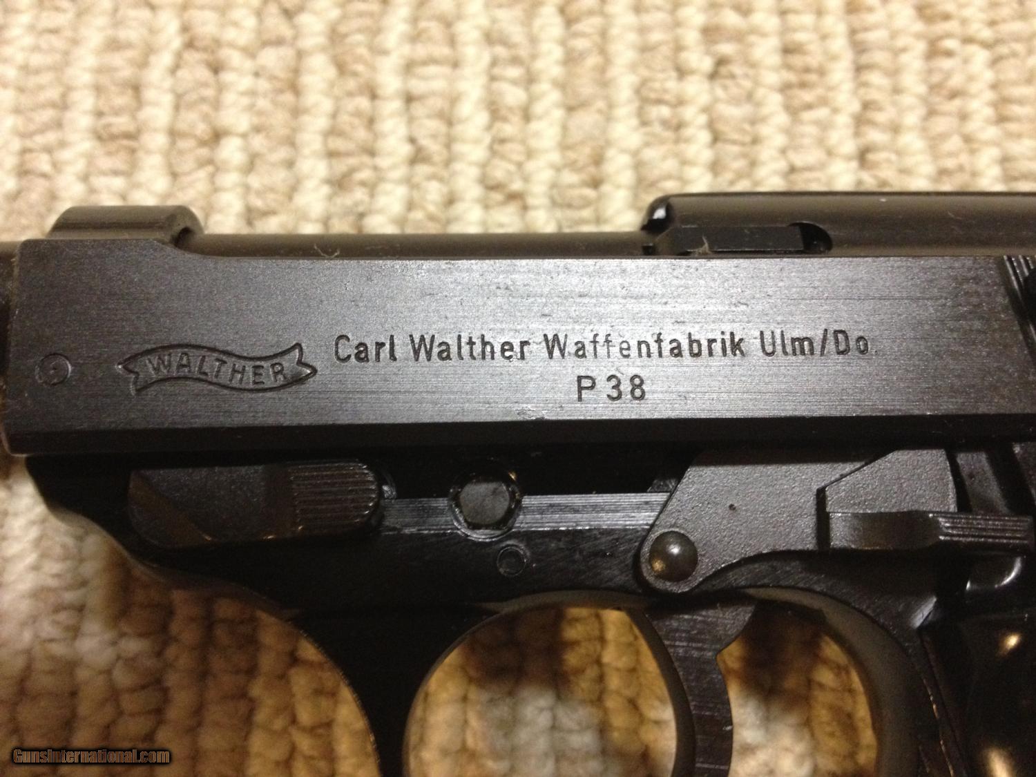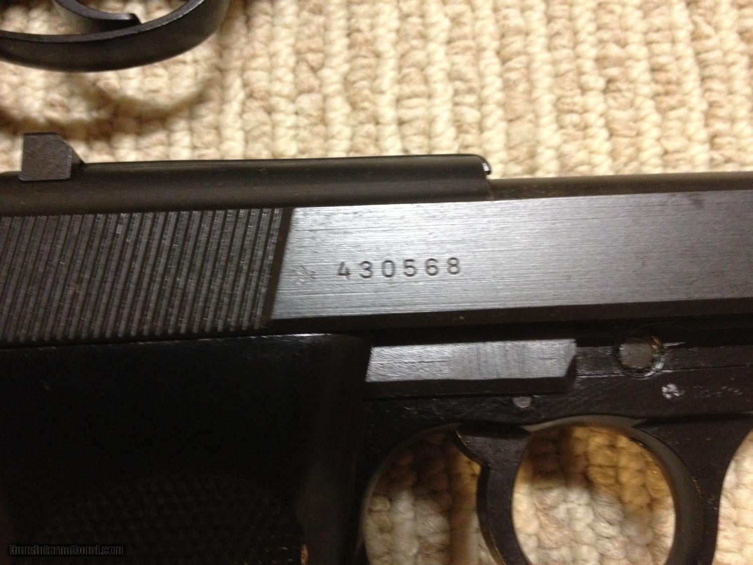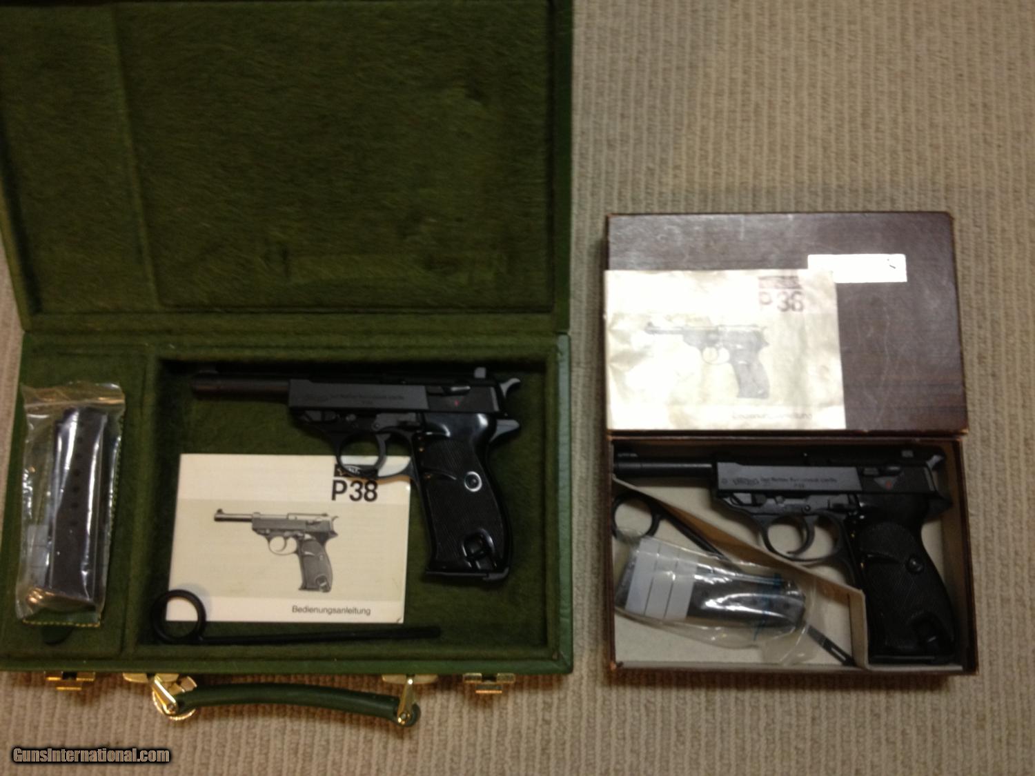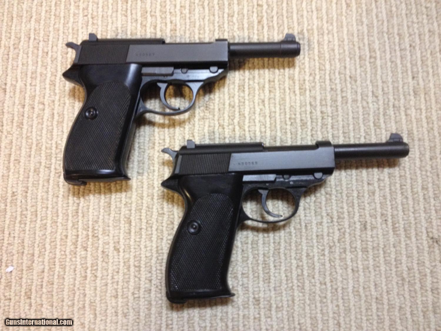 Description: Here are two unfired Walther P-38 9 mm parabellum pistols made post war. They have consecutive serial numbers. One has the original box, the other comes in a commercial gun box. Both have the original spare magazine and cleaning tool. Notice that neither have an Interarms or other importation stamp. SOLD Manufacturer: Walther Model: P-38 Serial Number: 430567/430568 Caliber Info: 9mm Condition: NIB |