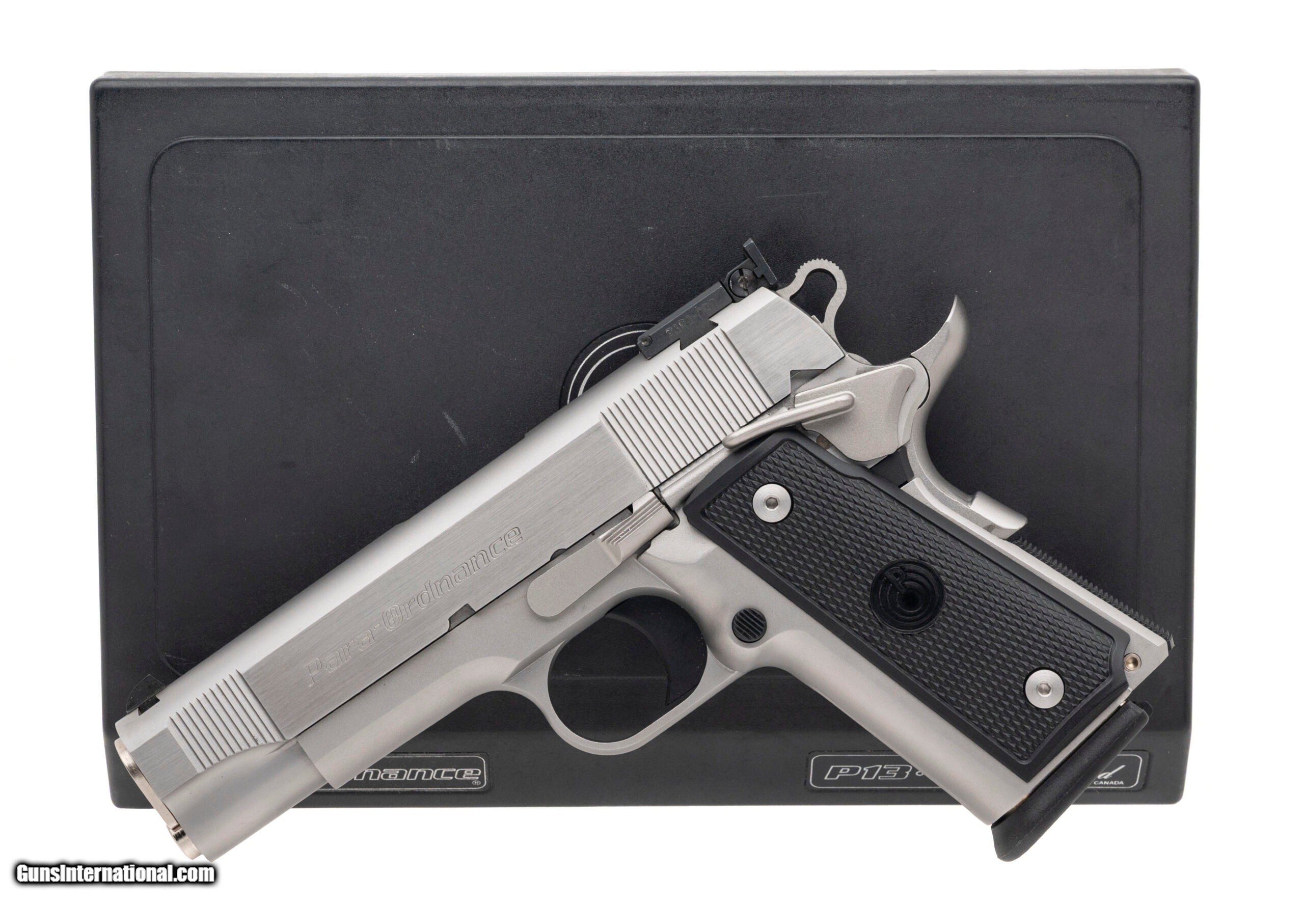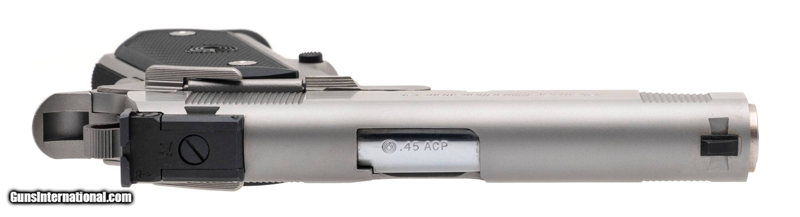 Description: "SN: HL2336. 1990s vintage, .45 ACP with a 4.25"" barrel. Bore is very good. Vintage double stack stainless steel frame 1911 style pistol with an adjustable rear sight, ambidextrous manual thumb-safety, and checkered polymer grips. Metal shows minor marks. Overall condition is near excellent. Includes original case. Price: $799.95 Contact Seller |