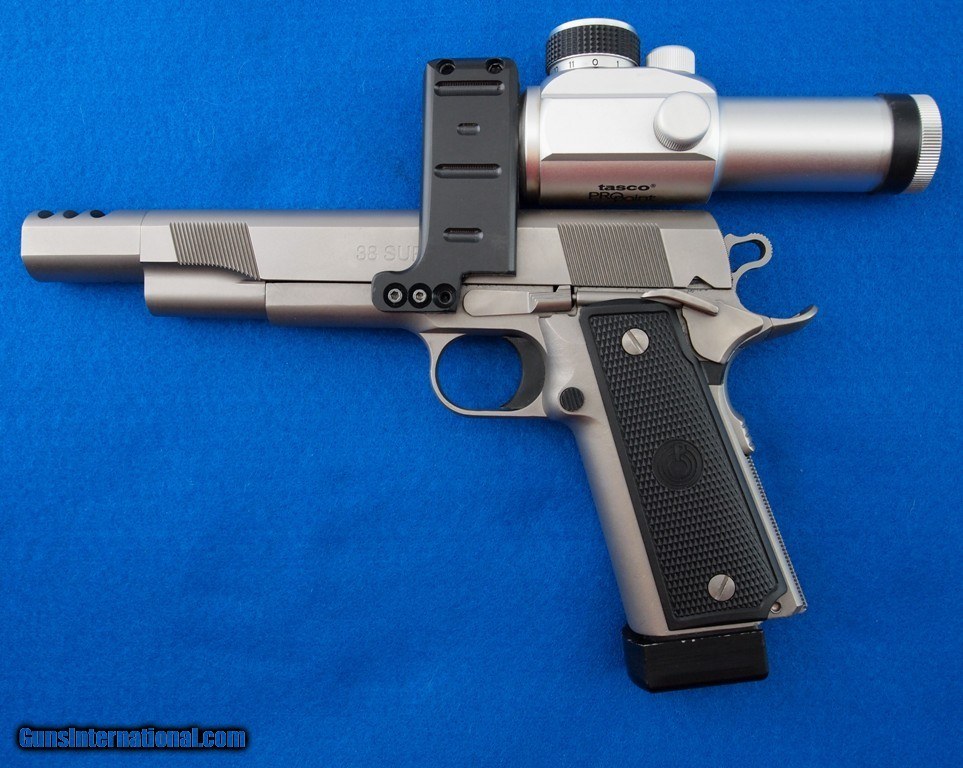 Description: PARA - BAER Custom Comp .38 Super, 5" bbl, shiny bore, good rifling, muzzle brake, Tasco Pro Point red dot optic, matte stainless finish, checkered mainspring housing, black checkered ParaOrdnance grips, and four 19 round magazines. Includes ten unopened bags of unprimed brass (appears to be 50 cases per bag). Add 3% for Credit Card Shipping $25.00 SOLD |