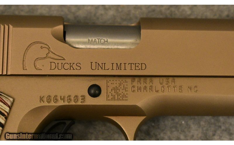 Description: This Ducks Unlimited Para 1911 is a version of the Para Ordinance commander sized pistol. Starting with only the finest precision-engineered parts, each pistol is hand-assembled and fine-tuned. The result is a true classic, featuring the custom grade quality and timeless looks of a high-end 1911. 9mm Luger SOLD Barrels: 5 inch Weight: 3lbs Item Location: Kansas City, KS |
