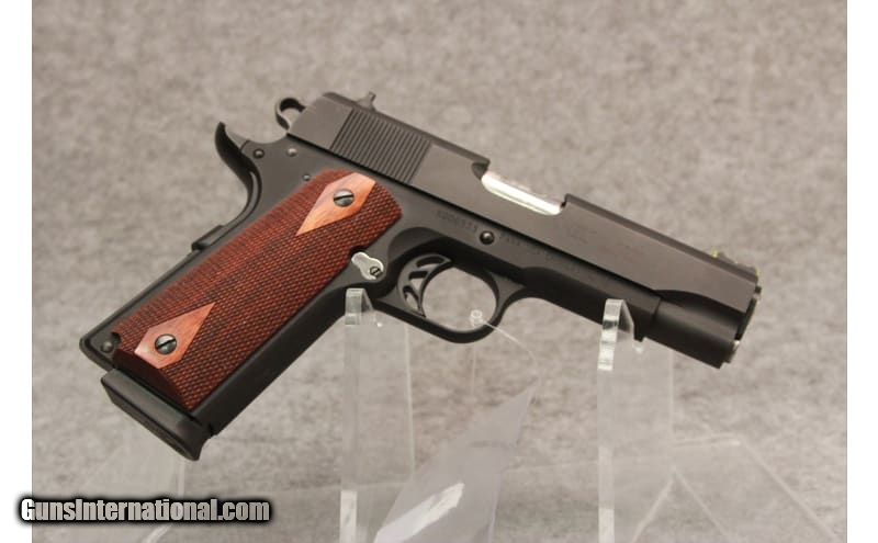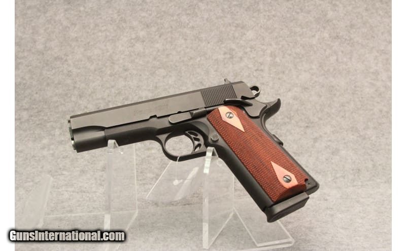 Description: Full size 1911 style pistol, skeletonized hammer, extended beaver tail safety and wood grips, some holster wear on the left side of the gun, over in great shape. .45 ACP SOLD Chambers: 45 ACP Metal Condition: good Wood Condition: good Barrels: 4 Inches Weight: 28 ounces Sights: "white dot rear, green fiberoptic front Item Location: Woodbury, MN |