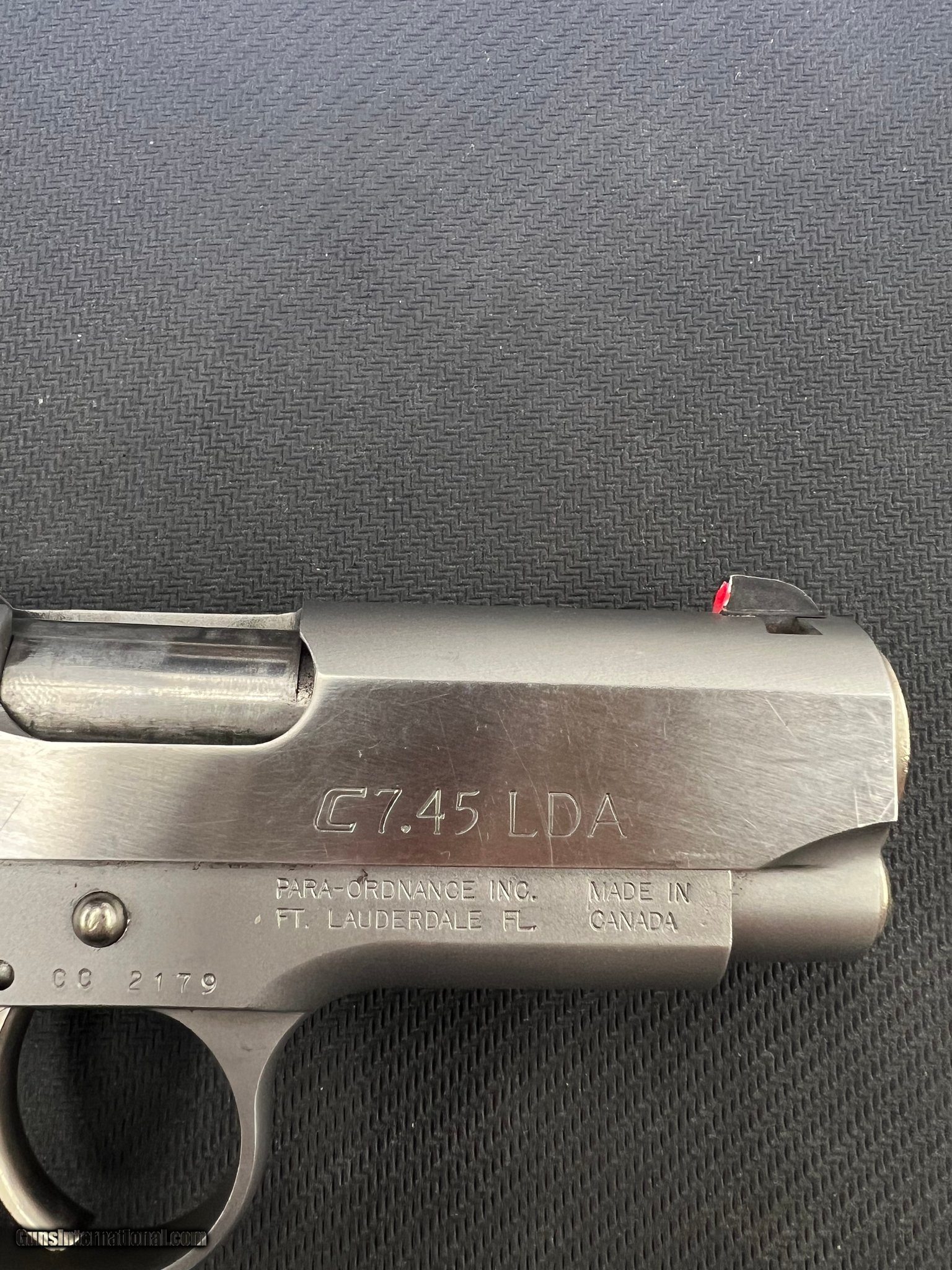 Description: Guns Listing ID: 545635 Para Ordance Para Companion C7.45 LDA .45 ACP STAINLESS 7rd magazine Has some scratches and marks from use Has crimson trace laser grips SOLD Manufacturer: PARA-ORDNANCE Model: C7.45 LDA Caliber Info: .45 ACP Condition: Used - Non-Certified Barrels: 2 BARREL Action: SEMI AUTOMATIC |
