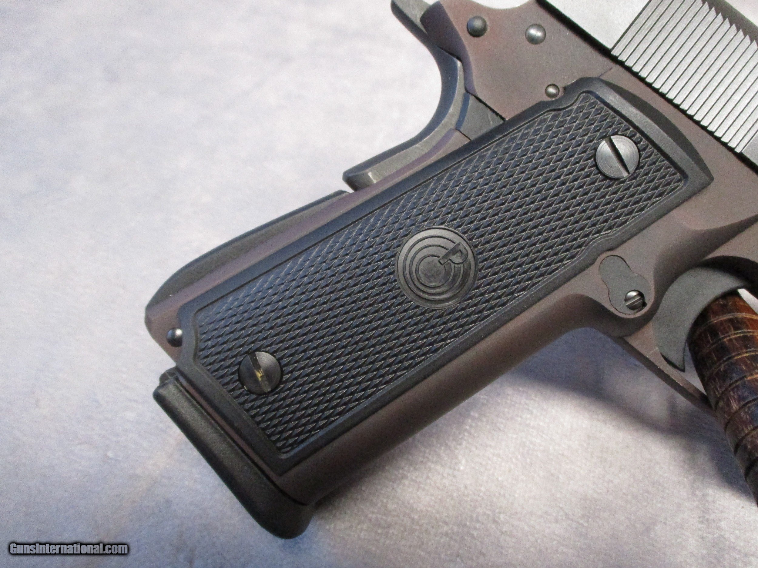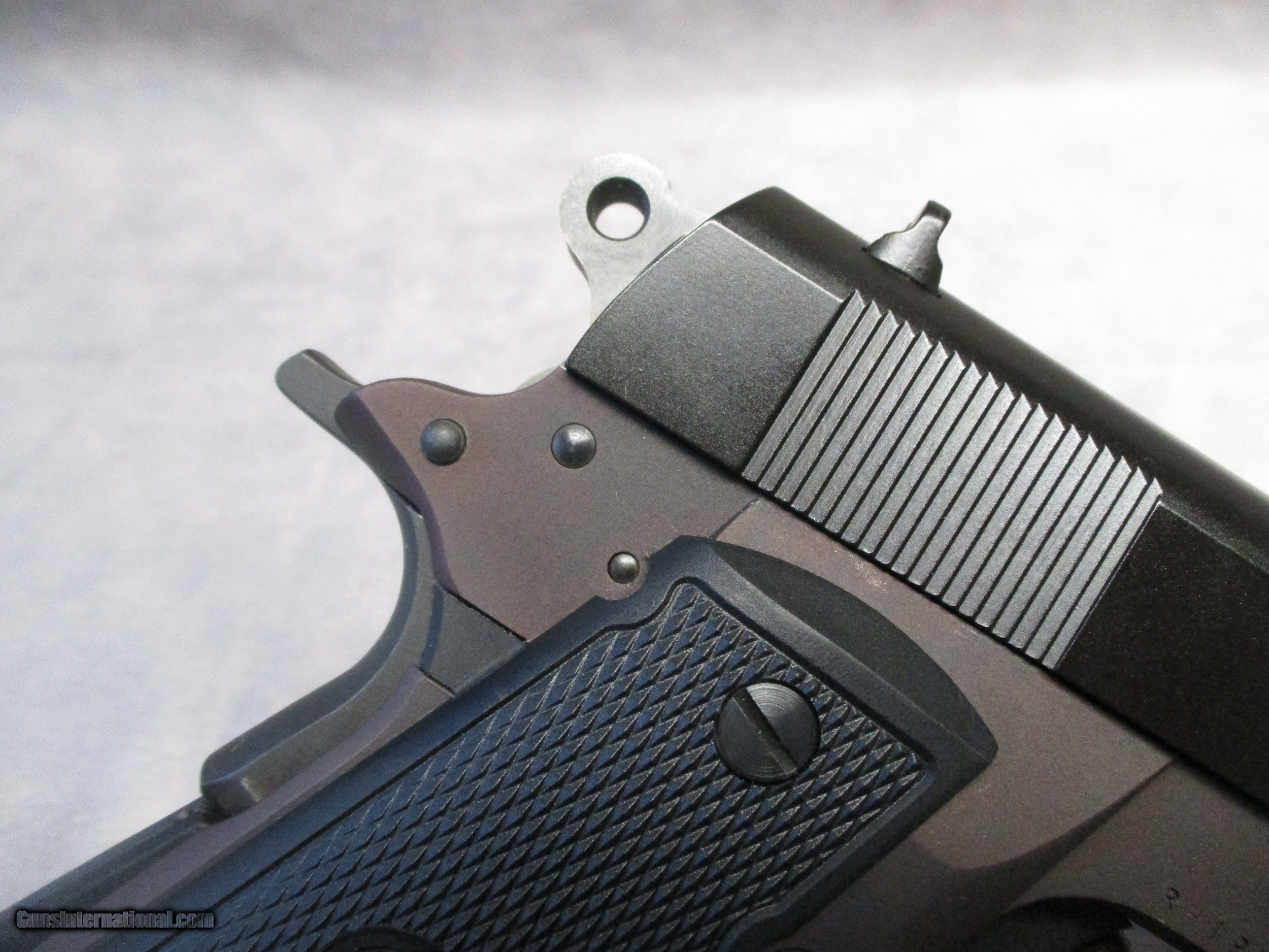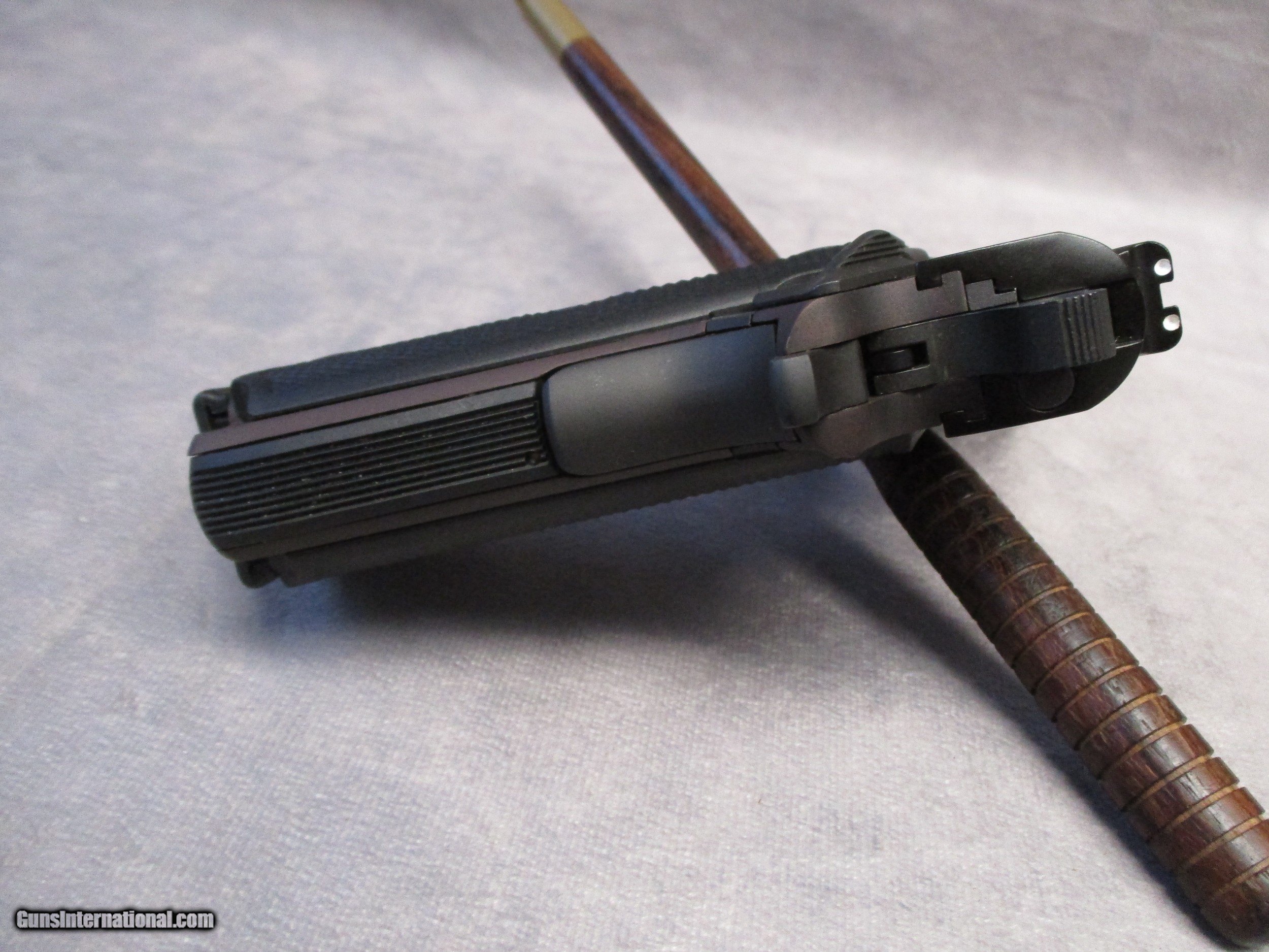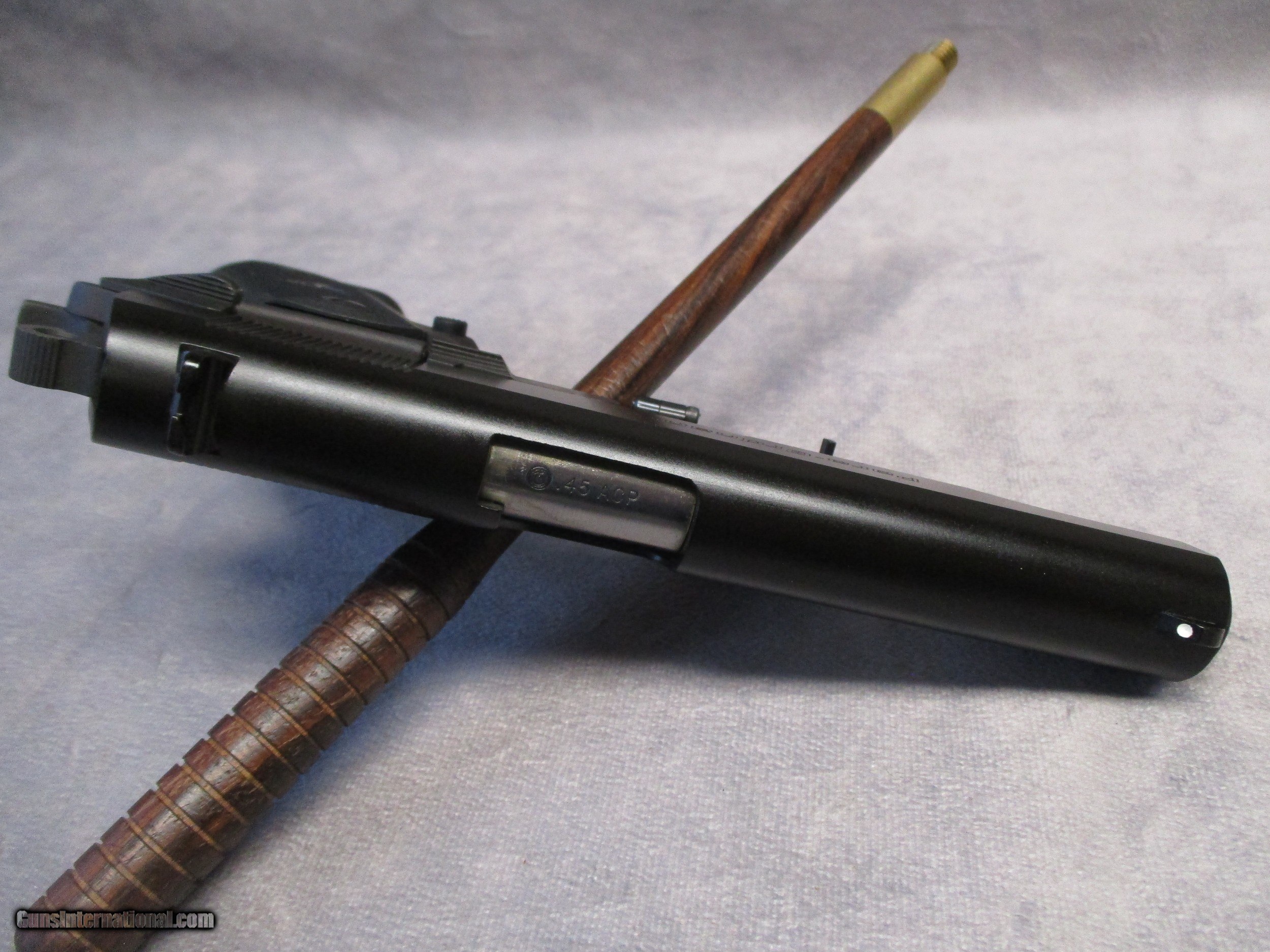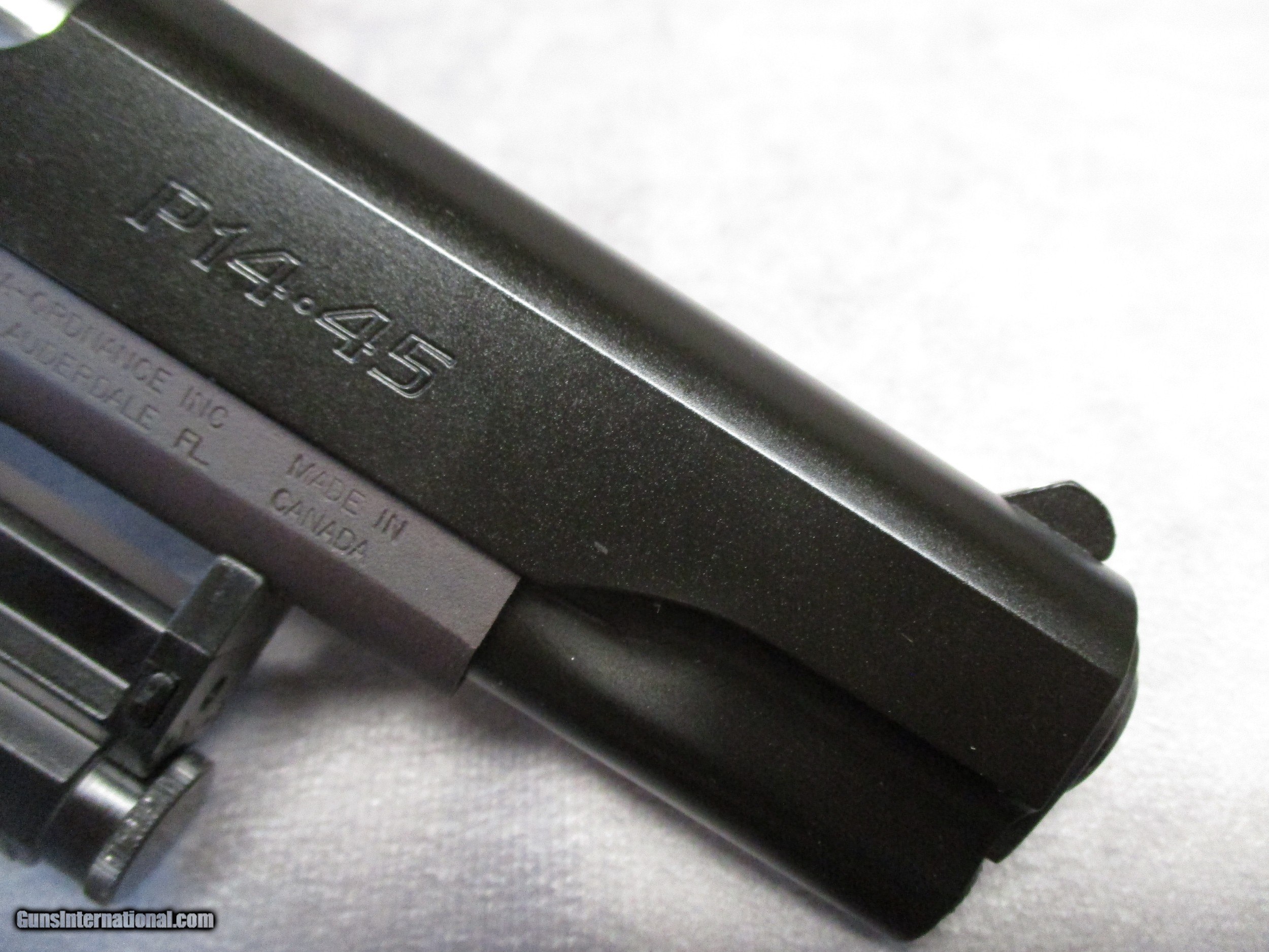 Description: The P14-45 was the first mass production 1911 to feature a wide frame capable of housing a double stack magazine, giving the pistol a capacity as high as 14 in the magazine and 1 in the chamber. This allowed it to compete with more modern pistols, particularly the 9mm types. Although Para-Ordnance is no longer in business, their double stack design concept lives on in the form of new production pistols made by STI, Rock Island Armory, Nighthawk, and Wilson Combat. This example has an interesting two-tone finish with a matte black slide and a plum-colored frame. The pistol comes with its original box which is more worn the pistol itself, which is in excellent condition. The original box is made of plastic and the part that keeps it closed has broken off at some point. The pistol itself appears to have seen little use. There are spots on the frame that have a matte black coloration to them. It is not certain if the frame was cerakoted or not. The P14-45 has been fitted with a trigger guard mounted laser sight manufactured by Laserlyte. It has two switches, one for power, and the other essentially changes the appearance of the dot. The pistol comes with three 14 round magazines total. Although not pictured, the original manual is included. SOLD Handgun Caliber: .45 ACP (.45 Auto) Manufacturer: Para Ordnance Model: P14-45 Serial Number: RH19983 Bore: Rifled Condition: Excellent Barrel Type: Round, tilting Action: Semi-Auto, Short recoil, Locked Breech Triggers: Single Stock: Checkered polymer grips Finish: Matte black, Plum Sights: 3-dot sights with windage adjustable rear sight, sight radius 6.375 inches (161.925 mm) Extras: Laserlyte Laser Sight, two spare mags for a total of three Case: Para Ordnance box |