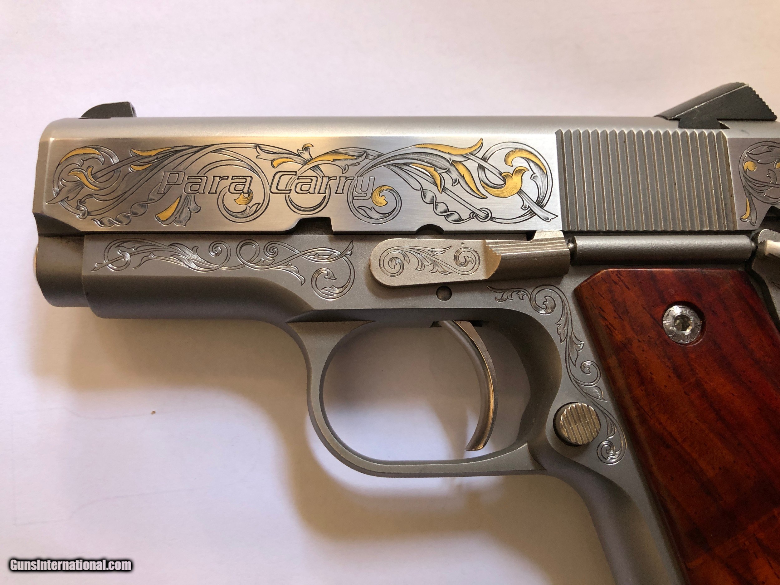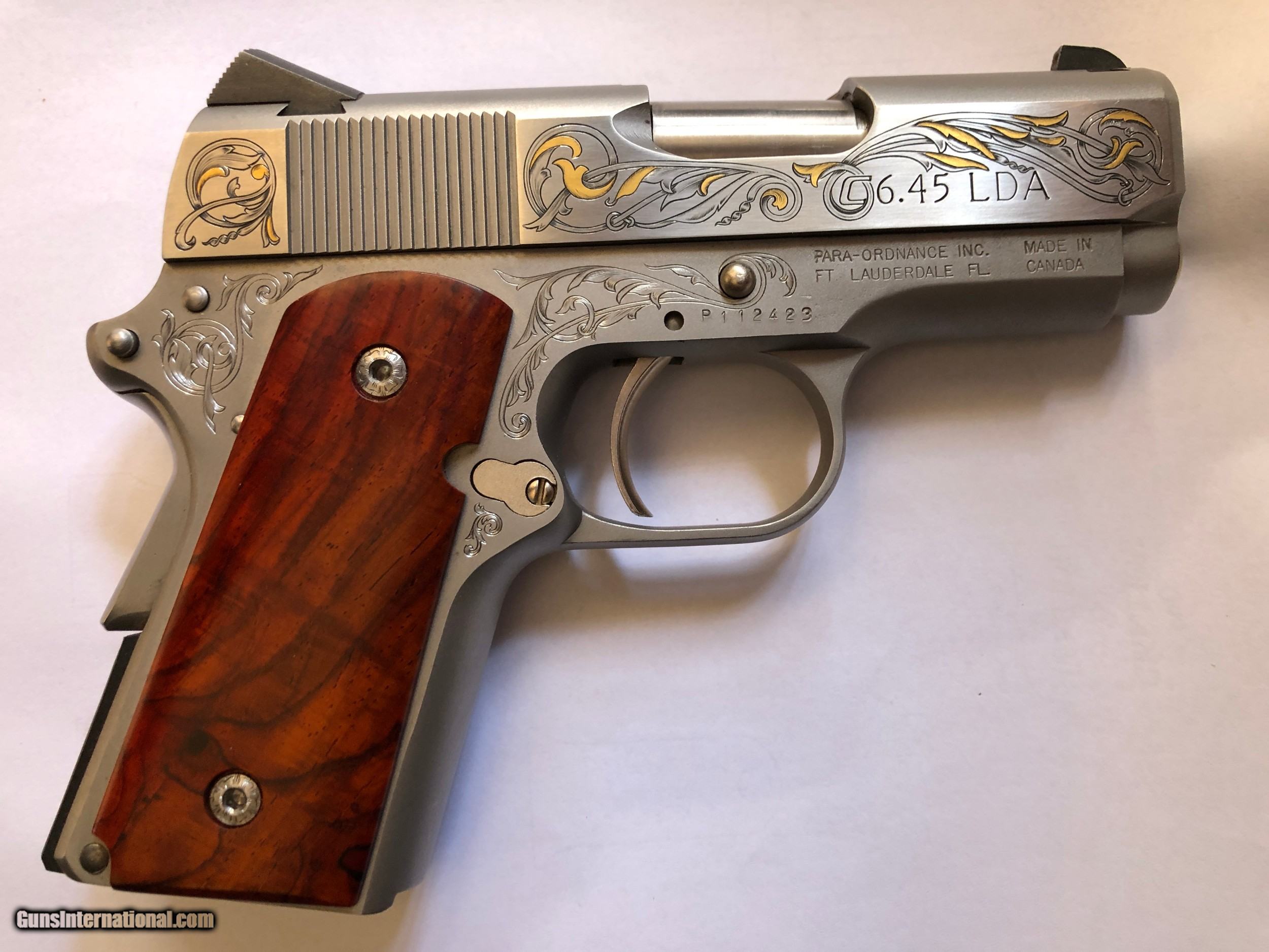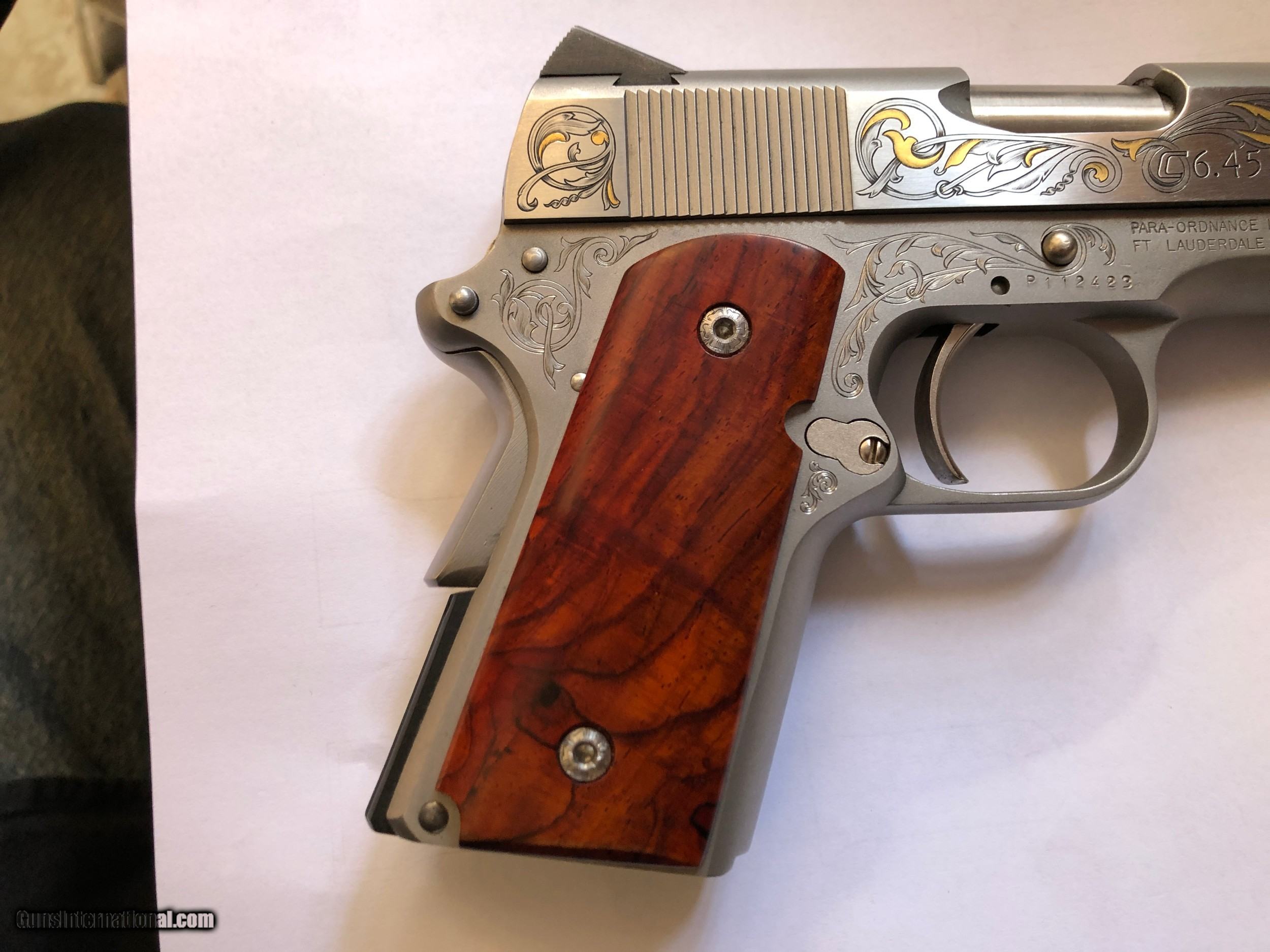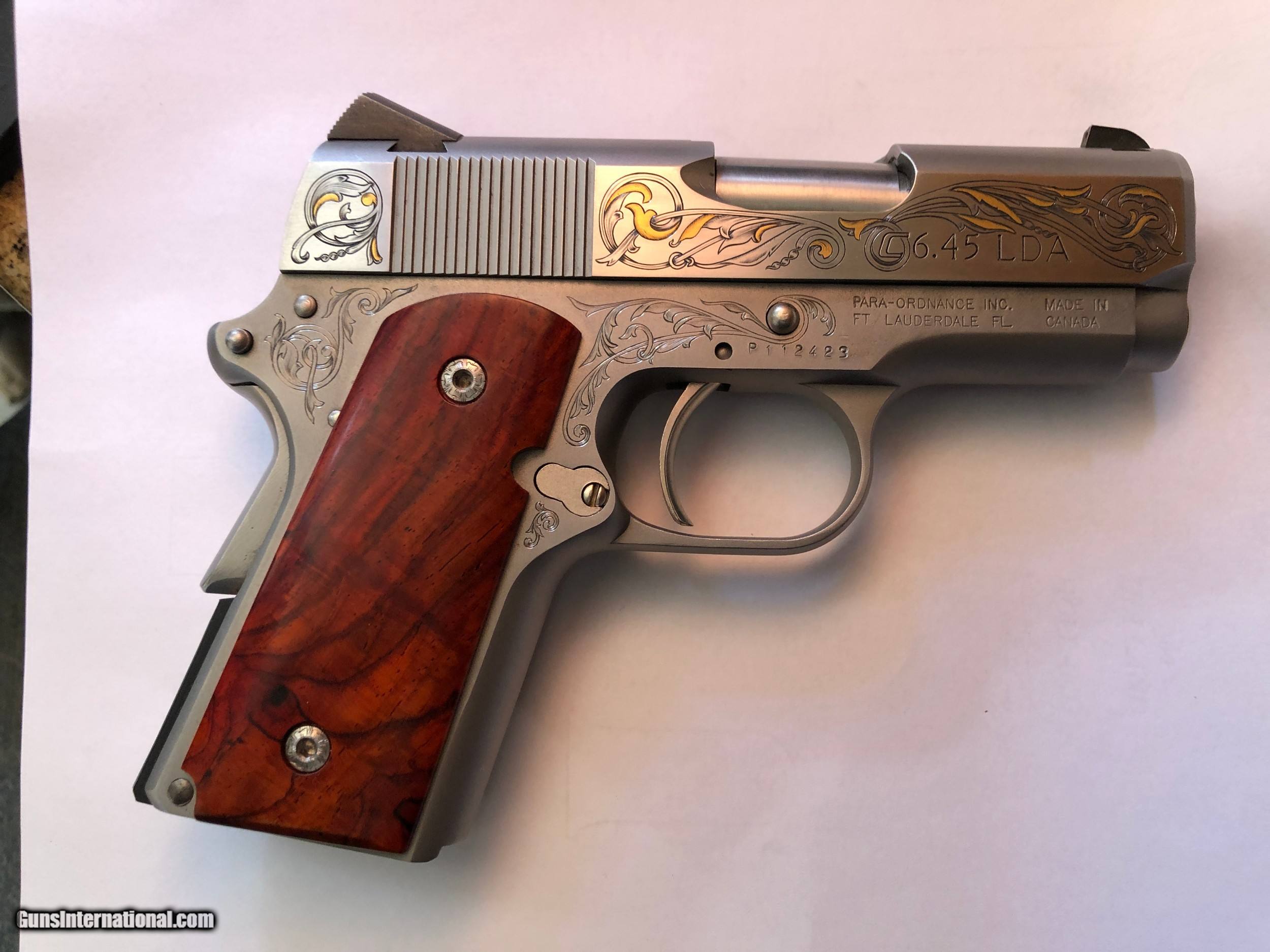 Description: - Made by Para Ordance Inc (Made in Canada) - PARA CARRY 6.45 LDA - Stainless Steel frame and slide - Cocobolo Root Burl custom scales with original Para grip included - Has 3" barrel - 6 round magazines - 3 magazines included (two have engraved bottom steel) - Light Double Action trigger (LDA) - Has grip safety - Hand Engraved by F.E.G.A. Master Engraver Gordon Alcorn - 24 karat gold inlays - Original box, instructions, factory fired shell casing, original lube tube and allen wrenches - I purchased this pistol new. It has had only a few hundred rounds though it at the most (much less than 500) - Shipping to lower 48 included (with possible exceptions) - Sorry - NO shipping to California SOLD Handgun Caliber: .45 ACP (.45 Auto) Manufacturer: Para - Ordnance Model: Para Carry LDA 6.45 Serial Number: P112423 Barrel Length: 3 Condition: Excellent Metal Condition: Excellent Wood Condition: Excellent Bore Condition: Very Good Action: Semi-Auto Triggers: LDA Engraving: Master" hand engraved |