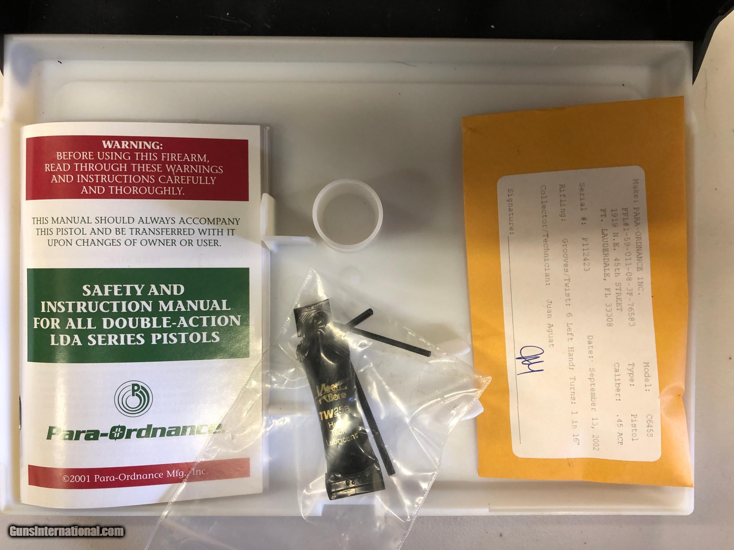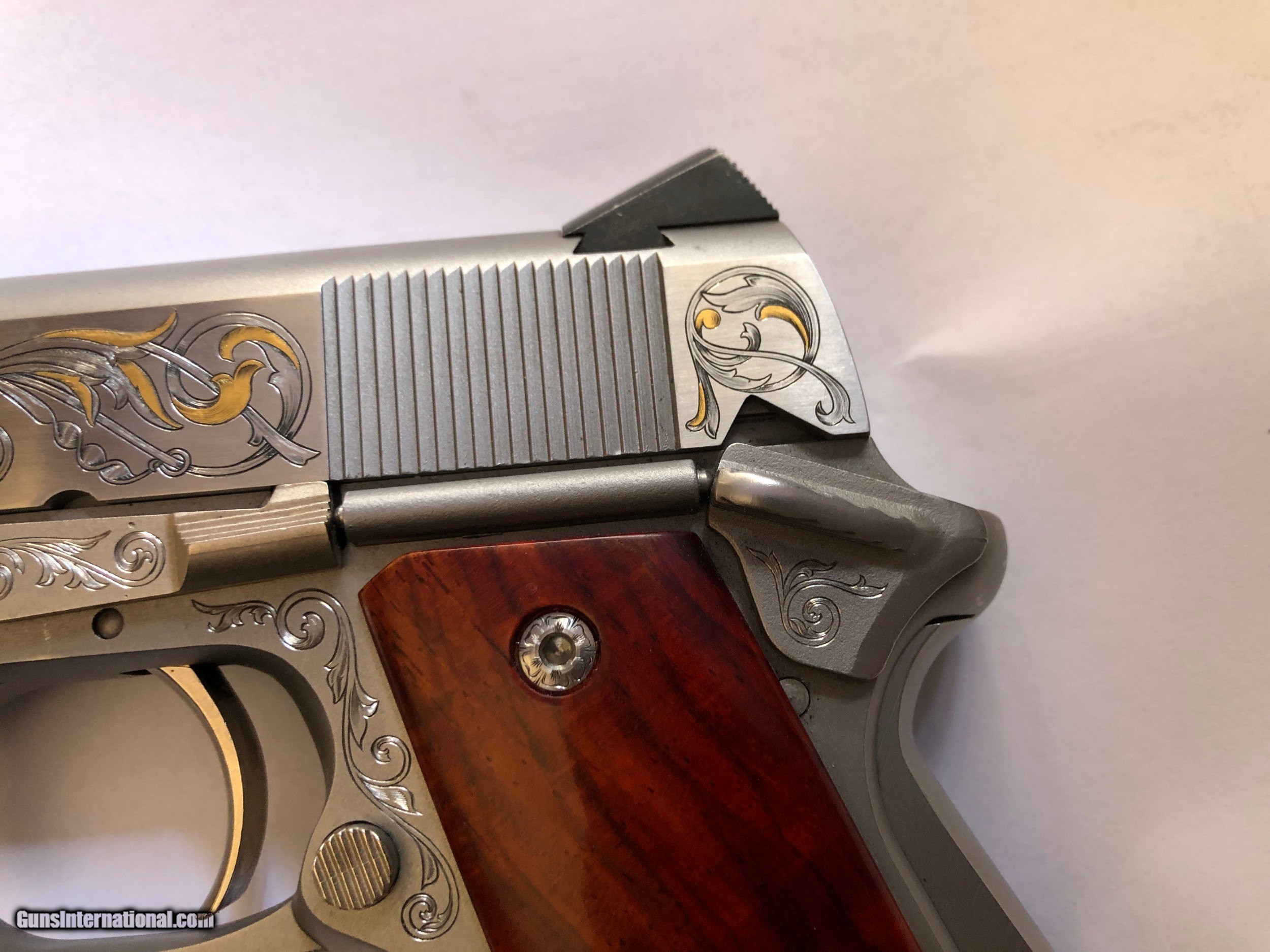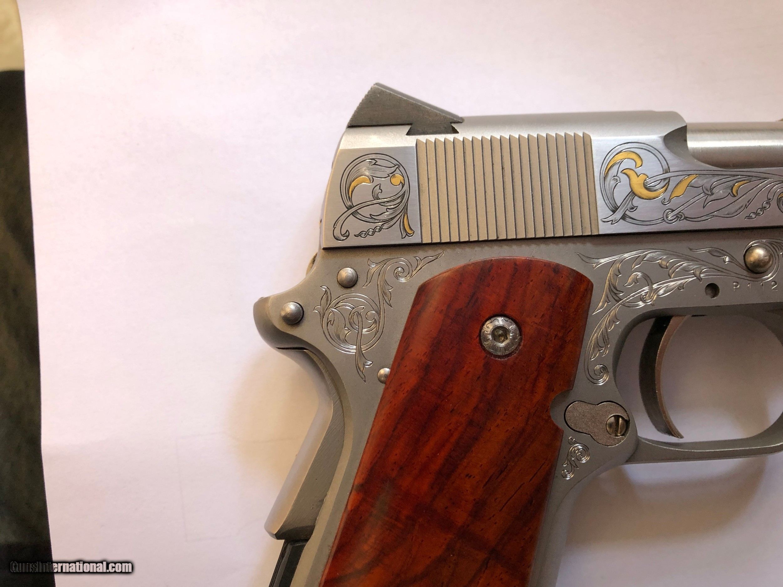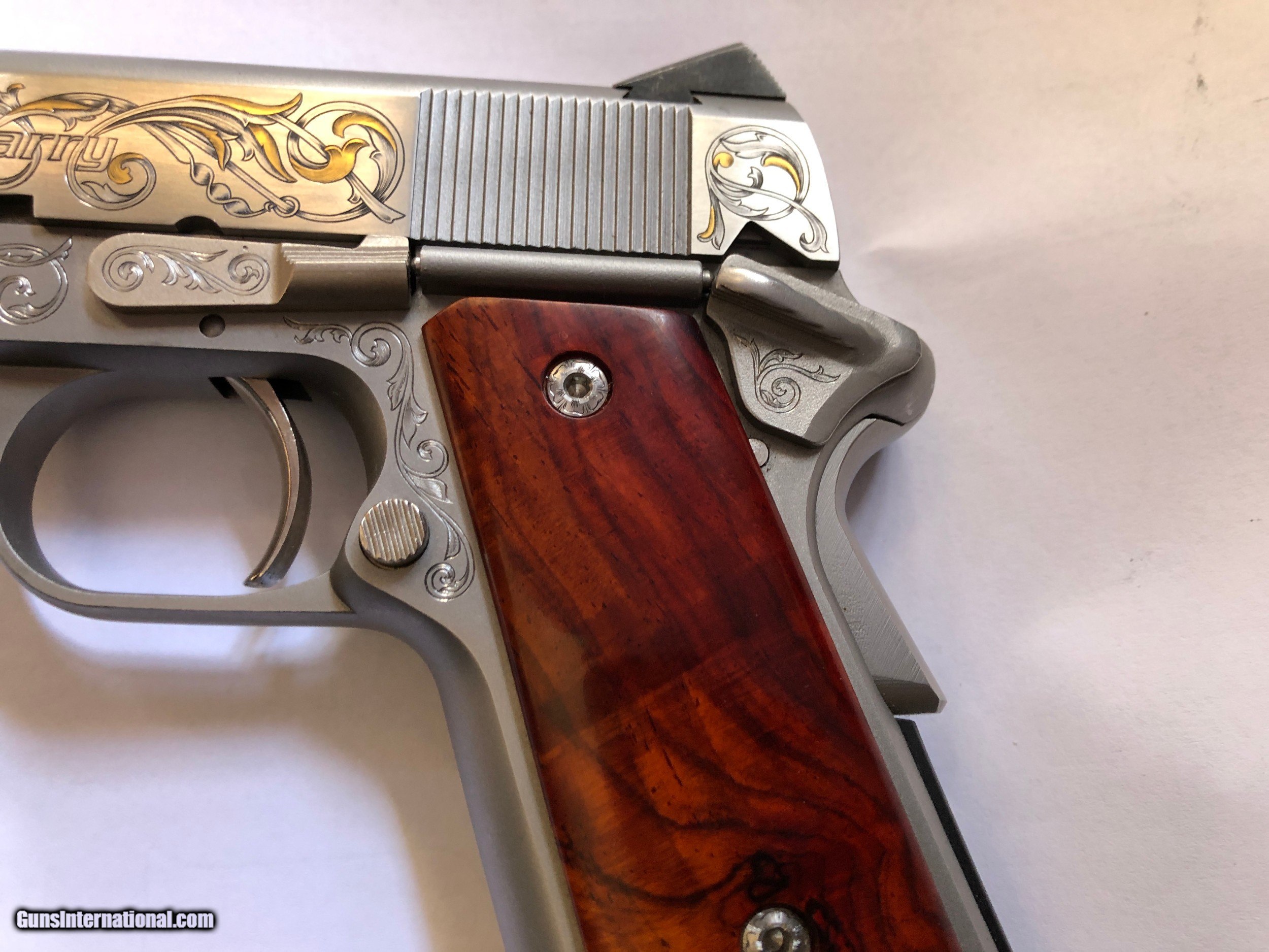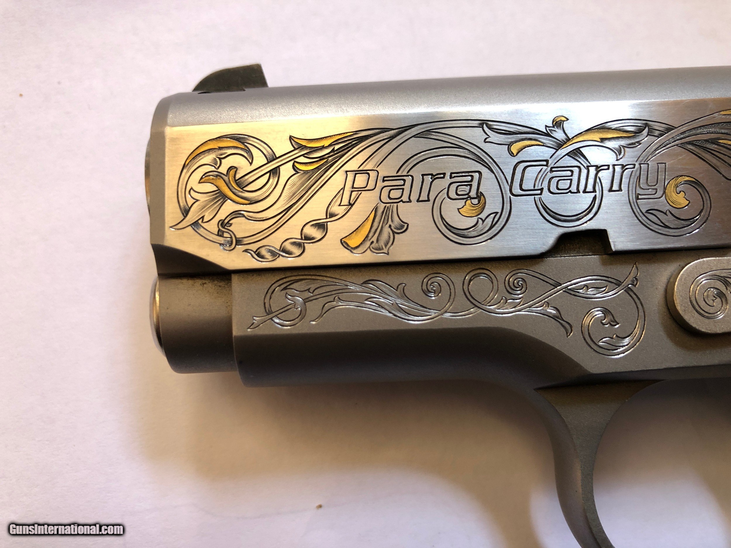 Description: - Made by Para Ordance Inc (Made in Canada) - PARA CARRY 6.45 LDA - Stainless Steel frame and slide - Cocobolo Root Burl custom scales with original Para grip included - Has 3" barrel - 6 round magazines - 3 magazines included (two have engraved bottom steel) - Light Double Action trigger (LDA) - Has grip safety - Hand Engraved by F.E.G.A. Master Engraver Gordon Alcorn - 24 karat gold inlays - Original box, instructions, factory fired shell casing, original lube tube and allen wrenches - I purchased this pistol new. It has had only a few hundred rounds though it at the most (much less than 500) - Shipping to lower 48 included (with possible exceptions) - Sorry - NO shipping to California SOLD Handgun Caliber: .45 ACP (.45 Auto) Manufacturer: Para - Ordnance Model: Para Carry LDA 6.45 Serial Number: P112423 Barrel Length: 3 Condition: Excellent Metal Condition: Excellent Wood Condition: Excellent Bore Condition: Very Good Action: Semi-Auto Triggers: LDA Engraving: Master" hand engraved |