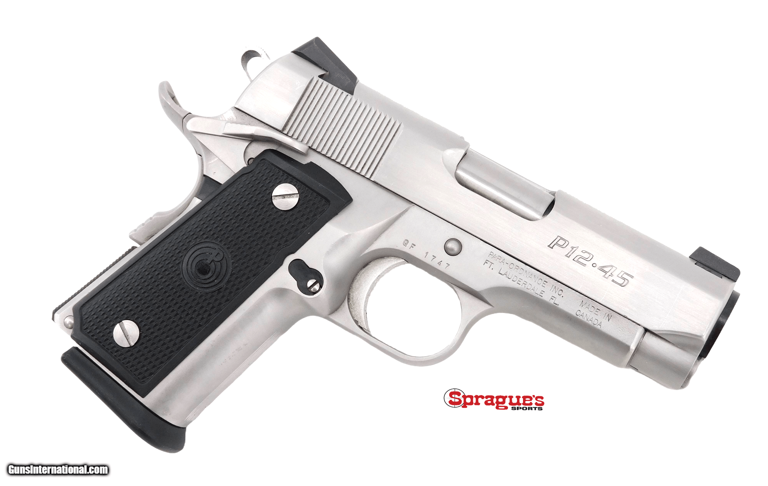 Description: Para Ordnance Pistols P12-45 3-1/2" 45 ACP Novak's Night Sights MFG 1999-2012 Manufacturer: Para Ordnance Canada Model: P12-45 Caliber:.45 ACP Manufactured:1999 - 2012 Barrel:3 1/2", shiny bore, good rifling Rear Sight:Novak's night sight, two dot Front Sight:One dot, Trijicon Optic:N/A Finish:Satin stainless steel, Light handling marks Action:Semi-automatic, mechanically solid, fed by detachable magazines, rear slide cocking serrations, ambidextrous thumb safety, grip safety, serrated front strap, checkered main spring housing, checkered blued magazine release, light handling marks Grips:Black checkered polymer with logos Accessories:One 12 round Para Ordnance magazines Condition:This is a very good example of a used Para Ordnance P12-45 stainless pistol Serial Number:QF1747 Sprague's Number:157343 +++++++++++++++++++++++++++++++++++ Add 3% for Credit Card Shipping will be actual cost plus insurance +++++++++++++++++++++++++++++++++++ This handgun will be a GREAT addition to your future outings! In-house pictures are of the item(s) being sold and the item(s) that will be shipped to the buyer! If there are no boxes, documentation, accessories, etc. shown in the pictures or described in the description, they are not included. Any stock pictures will be labeled as such. PRIOR TO PURCHASE!!! We will do our best to answer all questions Monday through Saturday during business hours, but are CLOSED ON SUNDAY. PLEASE ALLOW 7-10 BUSINESS DAYS FOR PROCESSING PRIOR TO BEING SHIPPED ONCE PAYMENT AND FFL INFORMATION HAVE BEEN RECEIVED. Buyers are responsible to ensure that you have fully reviewed the listing before purchase. Buyers are responsible to know and ensure that they are in compliance with local, state, and federal regulations/laws and are of legal age for items purchased. We have not test fired any firearms unless specifically noted in the description. Have a GREAT SAFE HEALTHY day! SOLD |