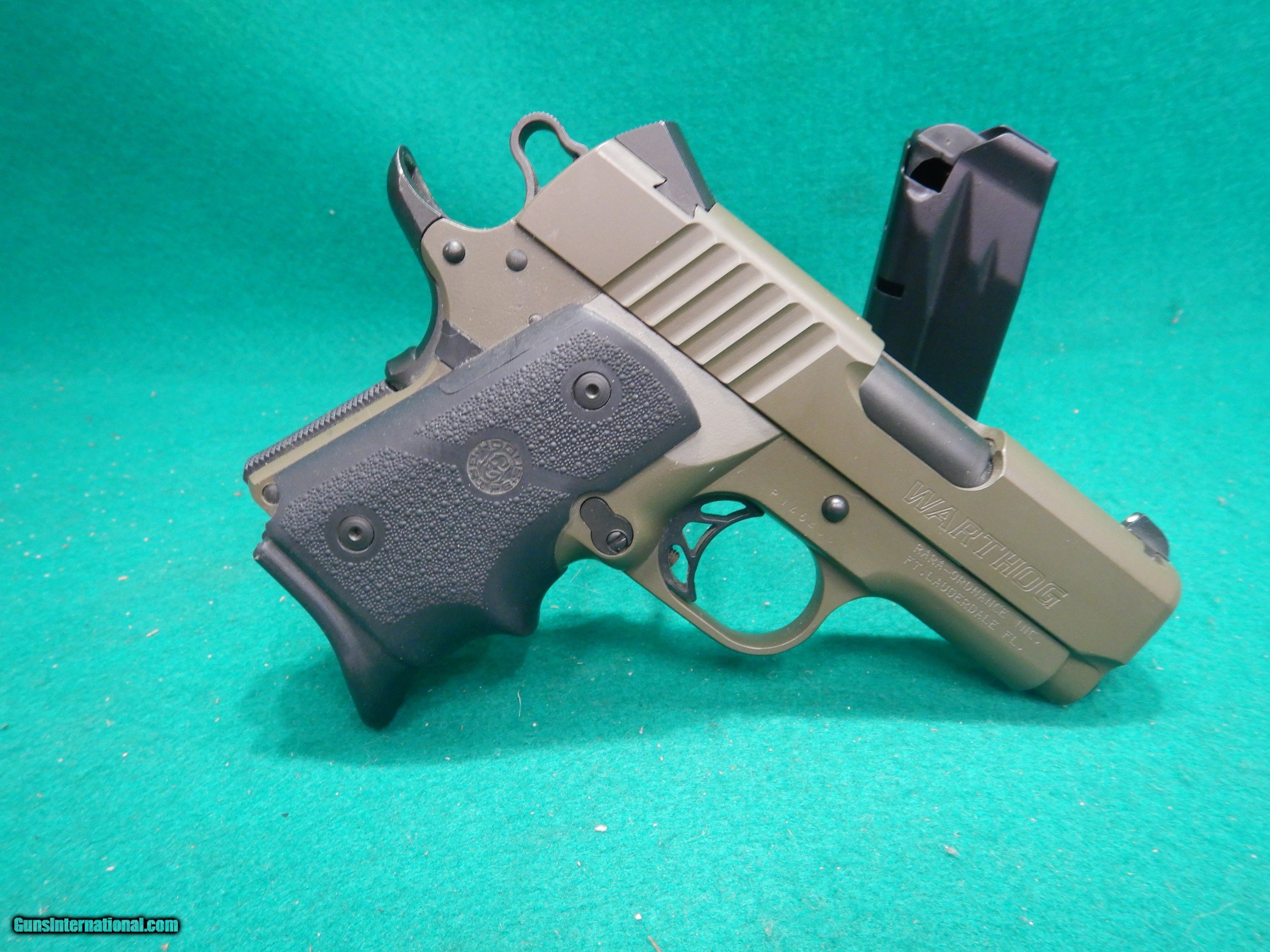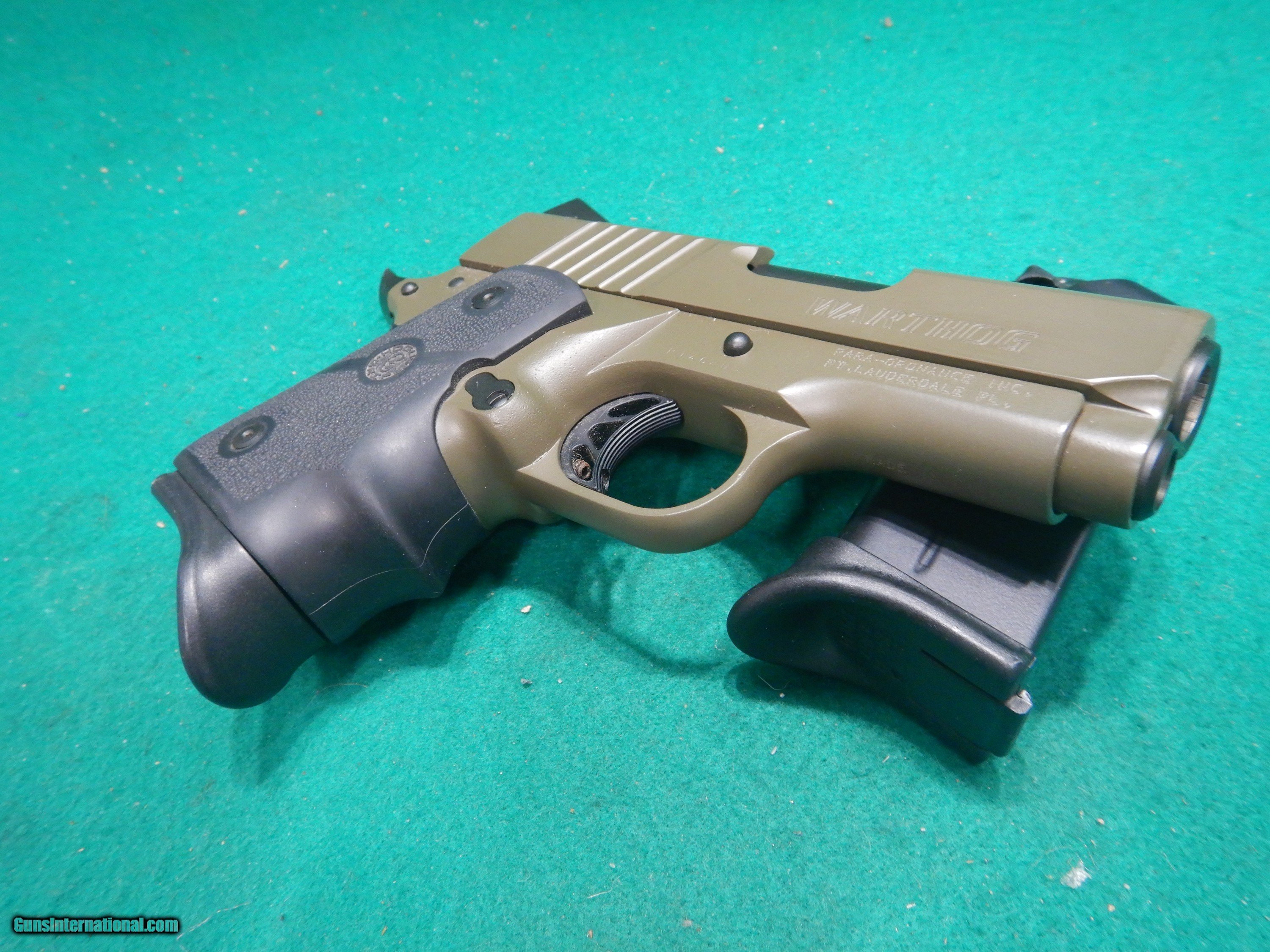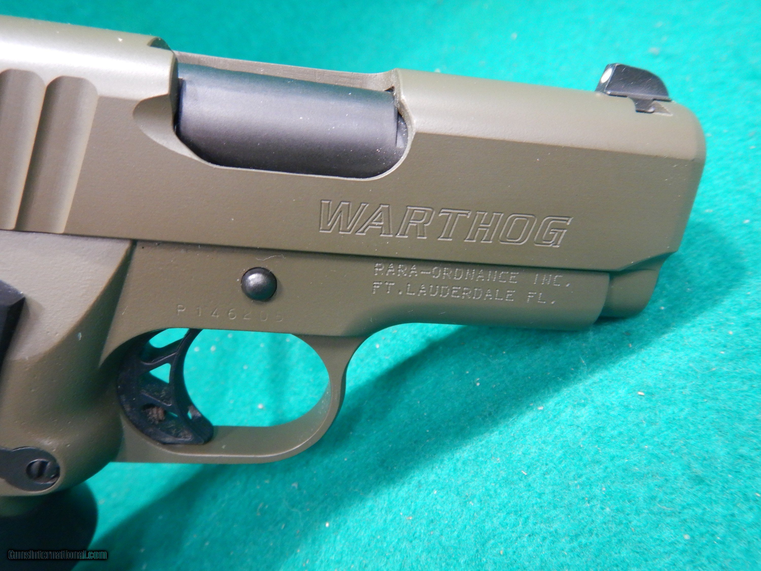 Description: Para Ordnance Warthog .45 ACP Pistol. S/N: P146205. Stamped: Made in Canada. Factory olive drab green. Hogue wrap around grip. Two 10 round double stack magazines. 3" barrel with excellent bore. I purchased this pistol new years ago and it's an unfired shelf queen in excellent condition, No box. SOLD |