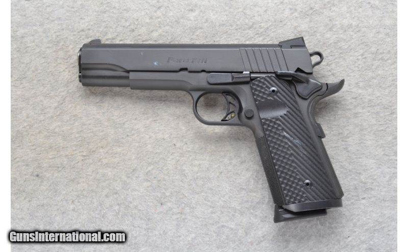 Description: This Para USA Model Elite Pro is a semi auto pistol in .45 ACP Cal. It has a 5 inch barrel with a rear serrated matte black slide. A blade front and notch rear sight with 3 dot night sight. The grip panels are a black dual textured G10 style and checkered front and rear straps. Black IonBond finish. It has a grooved adjustable 3 hole trigger and a ring serrated hammer. SOLD Caliber Info: .45 ACP Chambers: Semi-Auto 8 round magazine. Metal Condition: Excellent with two surface marks on the left slide side. Bore Condition: Excellent. Barrels: 5 inch barrel with a rear serrated matte black slide. Triggers: Grooved. Adjustable. 3 hole. Stock: Dual textured black G10 grip panels. Black IonBond finish. Ringed serrated hammer. Weight: 42 oz. Sights: Blade front. Notch rear. 3 dot night sights. Item Location: Richfield, WI |