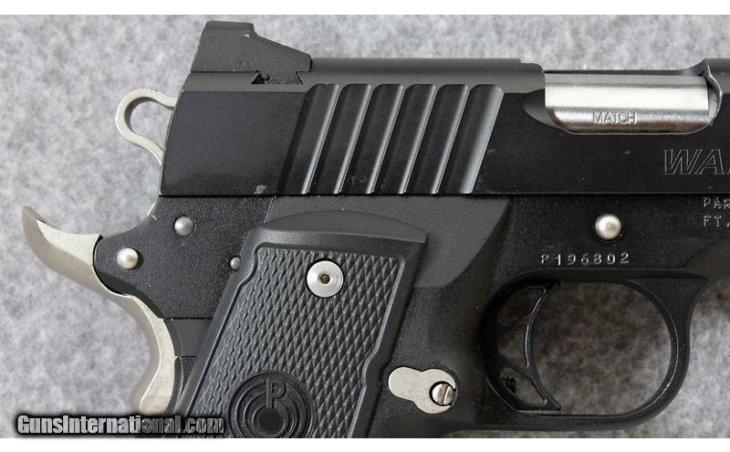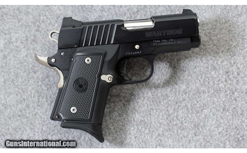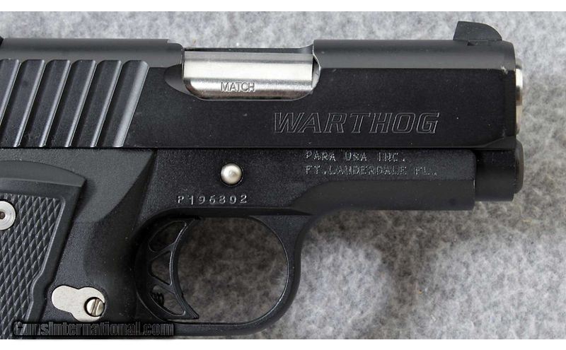 Description: The Para USA Warthog .45 acp gives you all the ergonomics of the familiar 1911 in small compact package; with the additional advantage of having 10 rounds of the hard hitting .45 acp cartridge. This a good pistol for personal defense and concealed carry. .45 ACP SOLD Metal Condition: Excellent Bore Condition: Excellent Barrels: 3 inch barrel Triggers: Single action Weight: 27 oz. Sights: Drift adjustable three dot sight Item Location: Lehi, UT |