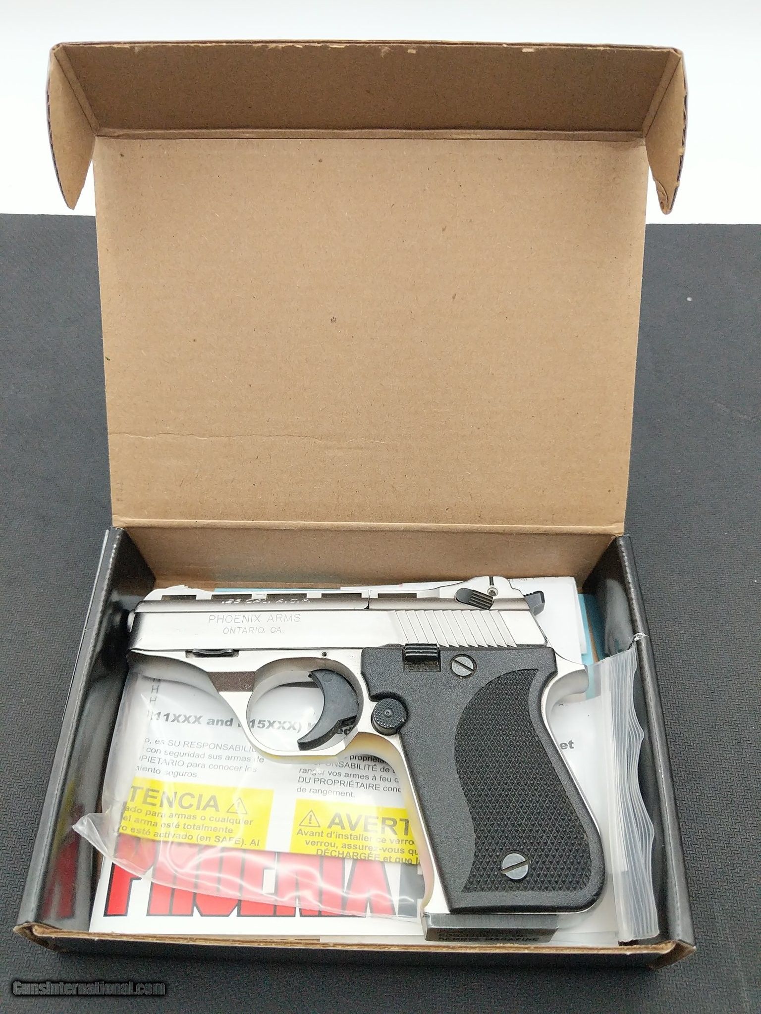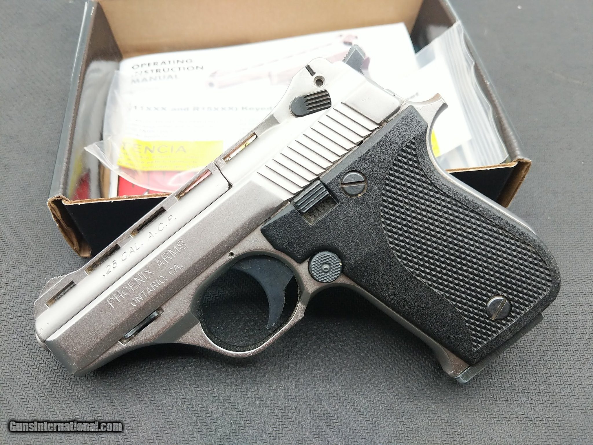 Description: Guns Listing ID: 598035 Very good condition Phoenix Arms HP25A! Perfect affordable concealed carry pistol in original box with one 8rd magazine. Nice option for cheap self defense. SOLD Manufacturer: PHOENIX ARMS Model: HP25A Caliber Info: .25 ACP Condition: Used - Non-Certified Barrels: 3" BARREL Action: SEMI AUTOMATIC Finish: silver |