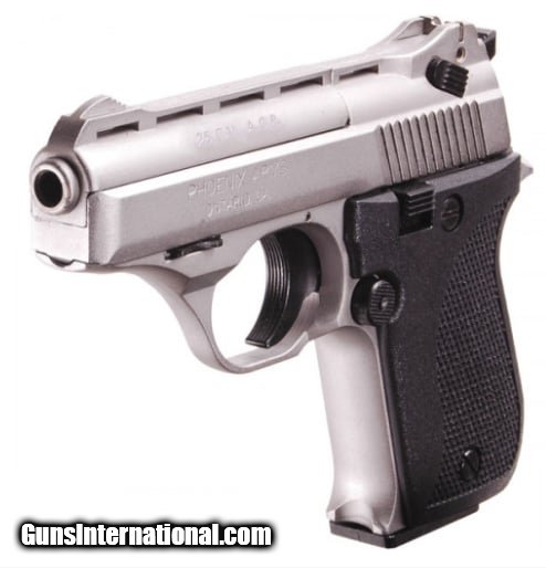 Description: Guns Listing ID: 483873 The Phoenix Arms HP25A is a single action semi-automatic pistol chambered in 25 ACP. It features a compact 4.1 by 5.5 size and weighs only 20 oz. This handgun additionally sports an alloy frame black plastic grips vented rib 3 barrel serrated trigger adjustable rear sight magazine interlock with manual slide hold open external hammer and firing pin block safety. Details PHX HP25 25ACP 9RD 3IN NKLBLK NICKEL FINISH SOLD Manufacturer: PHOENIX ARMS Model: HP25A Caliber Info: .25 ACP Condition: new Barrels: 3" barrel |