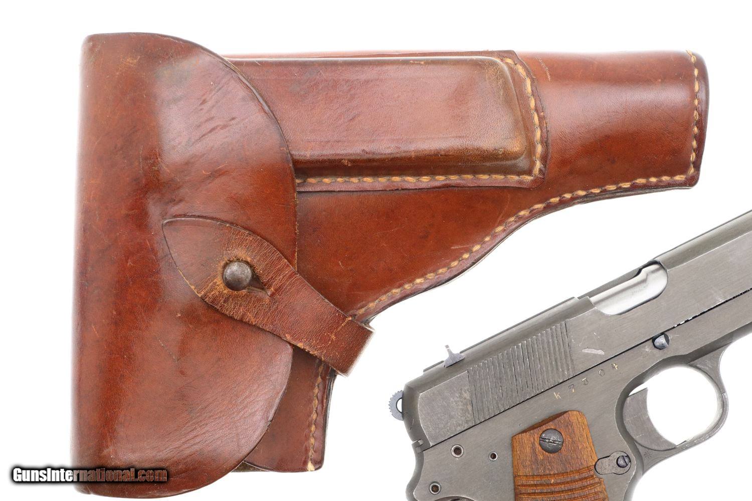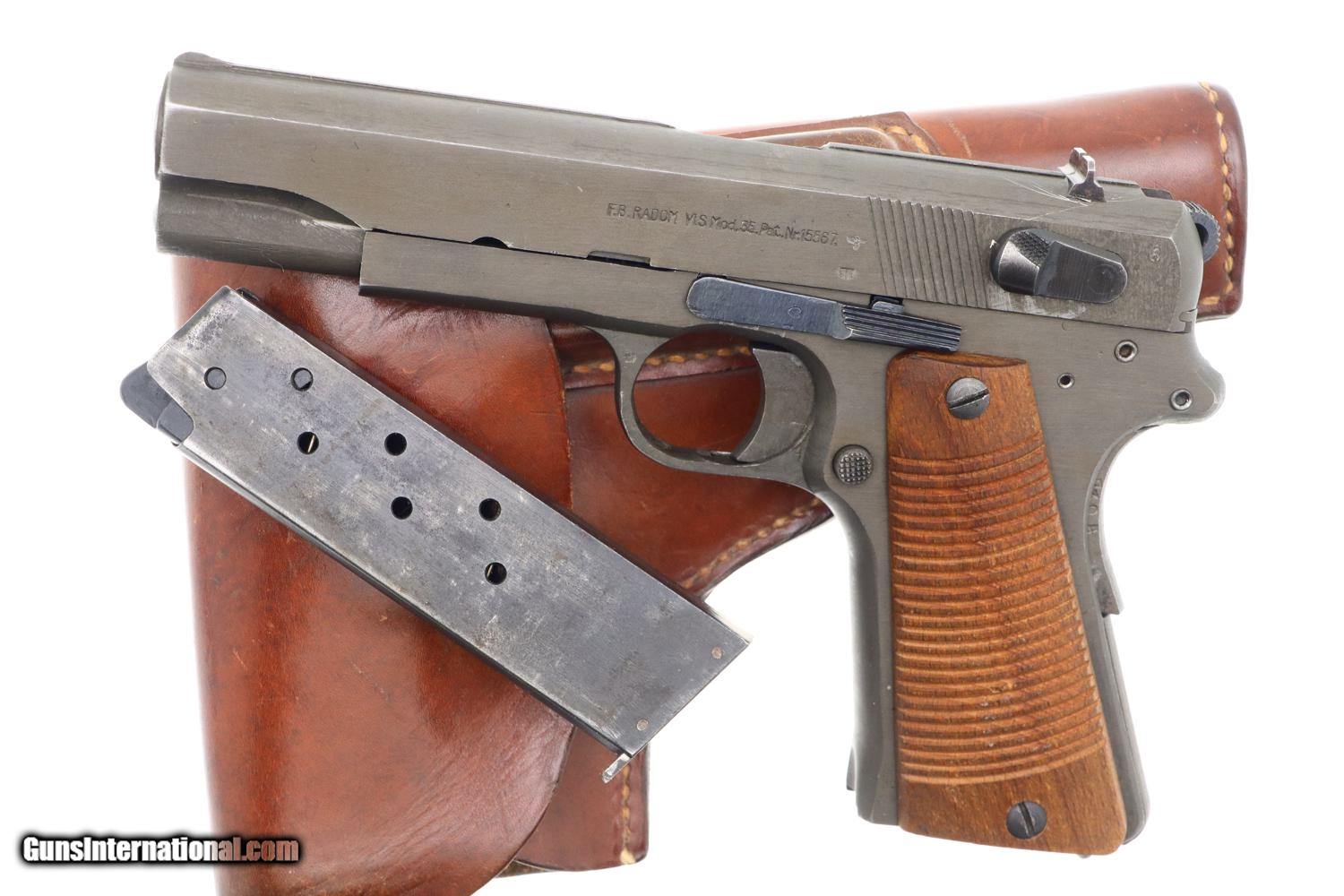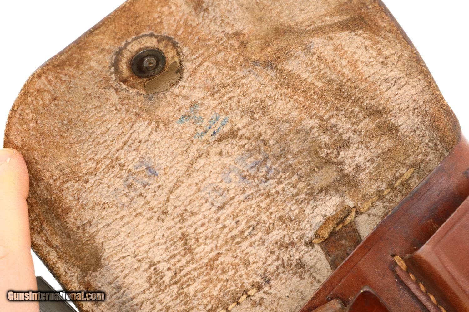 Description: Synopsis: Beautiful Polish Radom, Late War, All Matching K block with phosphated finish, blued small parts, wood serrated grips and correct leather holster with inked acceptances as issued to the Germans in WWII. Description: A very nice example of an all matching, late war, Type III K block Radom with the sought after phosphated finish and wood serrated grips. Standard configuration pistol with fixed front and drift adjustable rear sight. Left side of slide marked with usual single line address specifying model and patent number. Full serial number on right side of frame, repeated inside slide, barrel lug, and grip safety. Major components with E/623 acceptances. Serrated wood grips. Late war, roughly finished, unmarked magazine. Complete with brown leather holster with inked acceptances inside flap. Condition: VG/EXC as photographed with original phosphate and blue, wear befitting a service firearm that has been holstered with light use. Comparable condition grips. Mirror bore Perfect manual mechanics. Near EXC holster that begs for a spare magazine. ~~Insured shipping fee of $155; most packages shipped using FedEx 2nd Day.~~ SOLD Curio/Relic: Yes Manufacturer: FB Radom Serial Number: K7304 Caliber Info: 9mmP |
