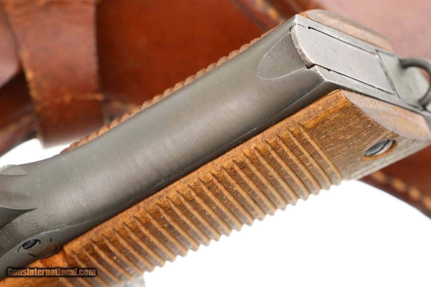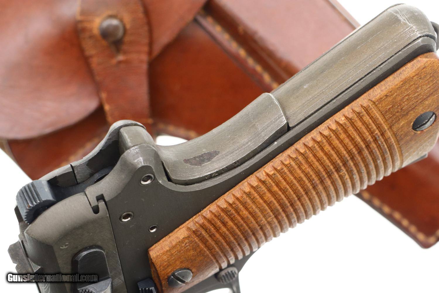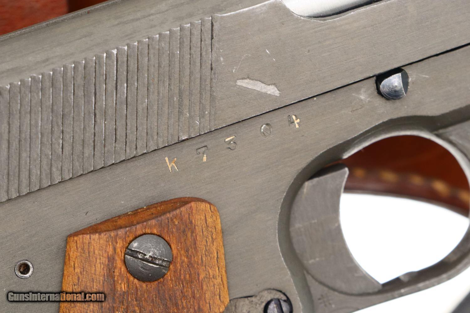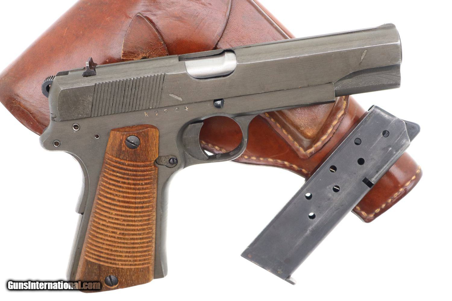 Description: Synopsis: Beautiful Polish Radom, Late War, All Matching K block with phosphated finish, blued small parts, wood serrated grips and correct leather holster with inked acceptances as issued to the Germans in WWII. Description: A very nice example of an all matching, late war, Type III K block Radom with the sought after phosphated finish and wood serrated grips. Standard configuration pistol with fixed front and drift adjustable rear sight. Left side of slide marked with usual single line address specifying model and patent number. Full serial number on right side of frame, repeated inside slide, barrel lug, and grip safety. Major components with E/623 acceptances. Serrated wood grips. Late war, roughly finished, unmarked magazine. Complete with brown leather holster with inked acceptances inside flap. Condition: VG/EXC as photographed with original phosphate and blue, wear befitting a service firearm that has been holstered with light use. Comparable condition grips. Mirror bore Perfect manual mechanics. Near EXC holster that begs for a spare magazine. ~~Insured shipping fee of $155; most packages shipped using FedEx 2nd Day.~~ SOLD Curio/Relic: Yes Manufacturer: FB Radom Serial Number: K7304 Caliber Info: 9mmP |