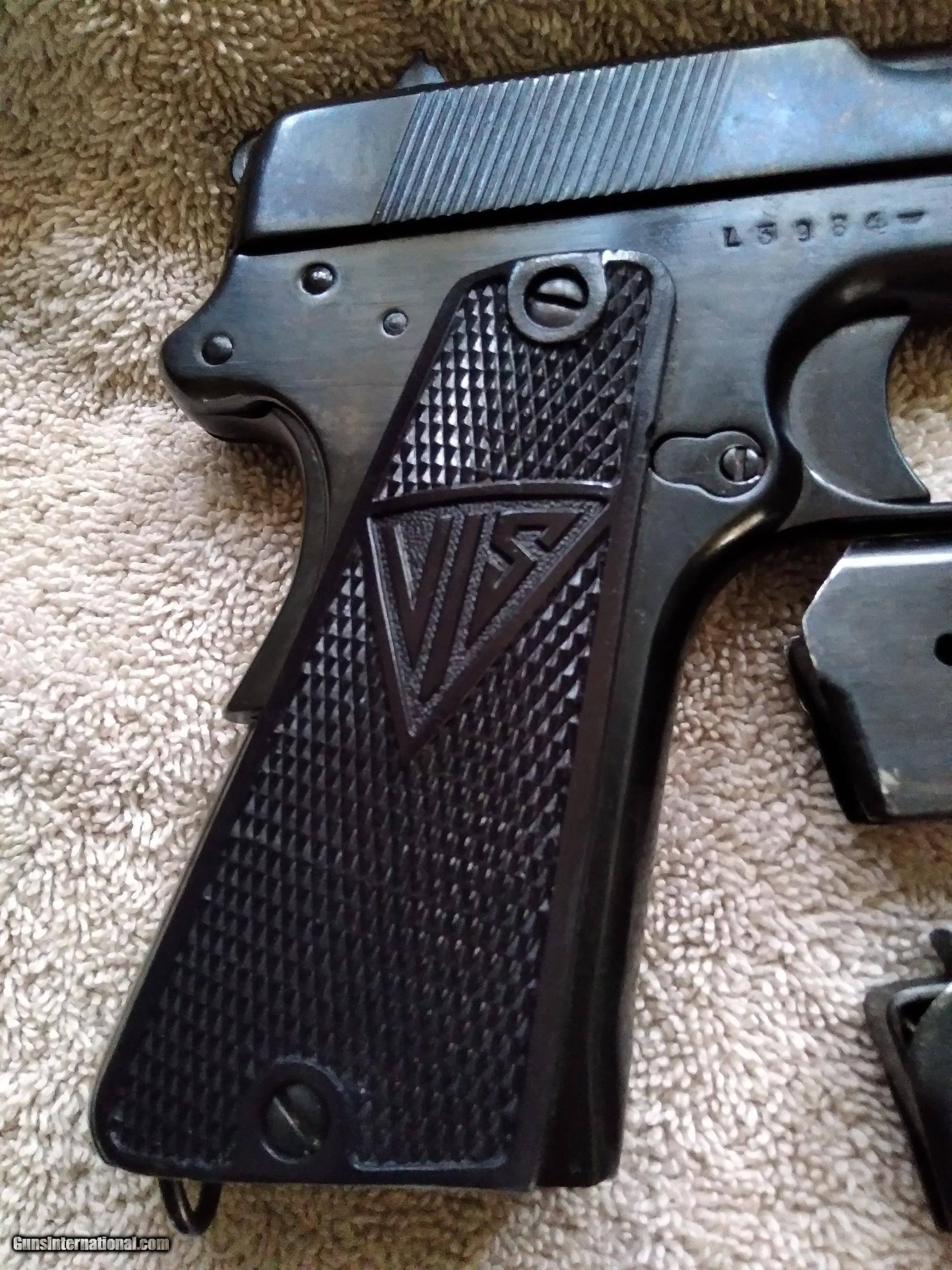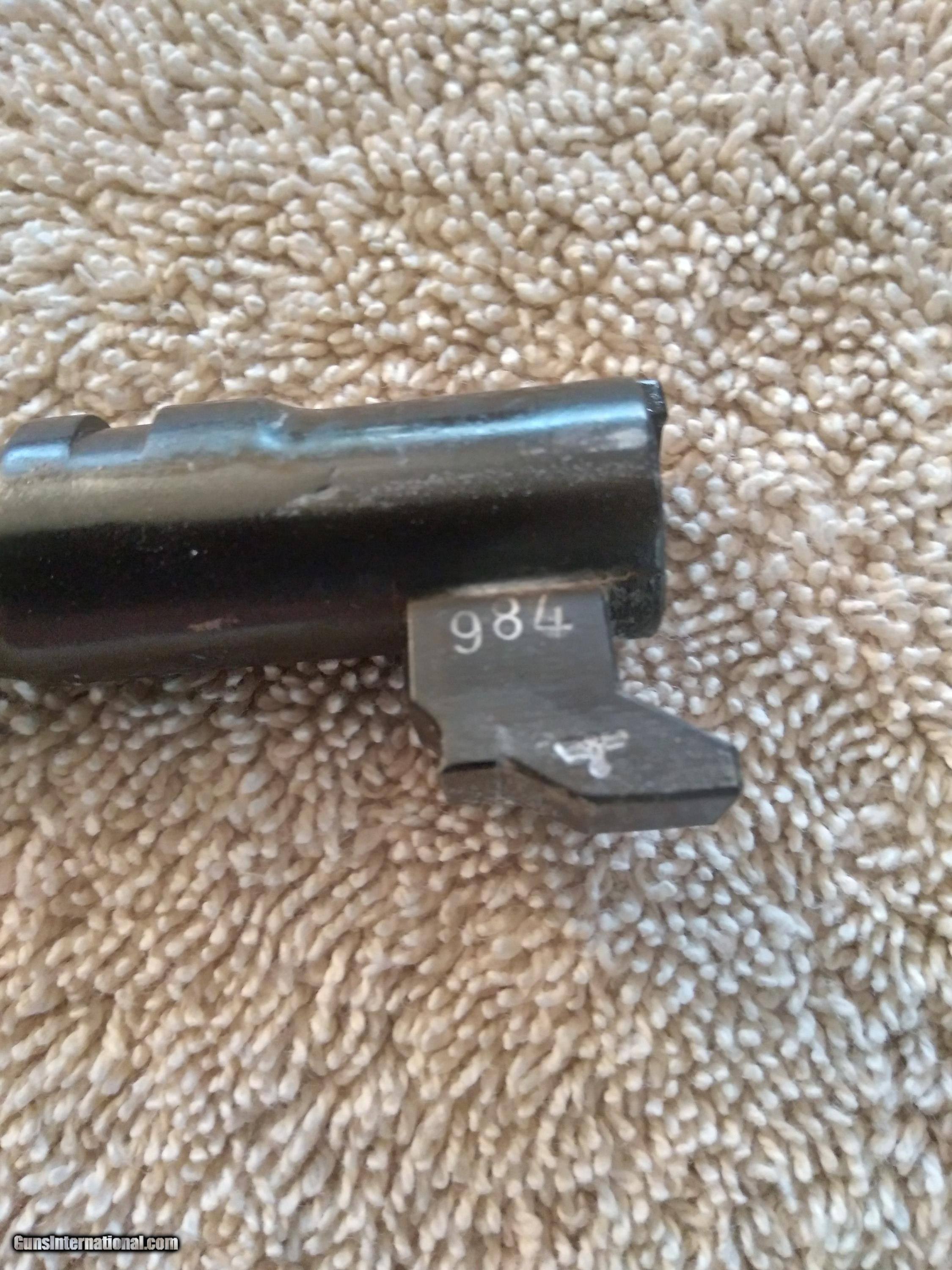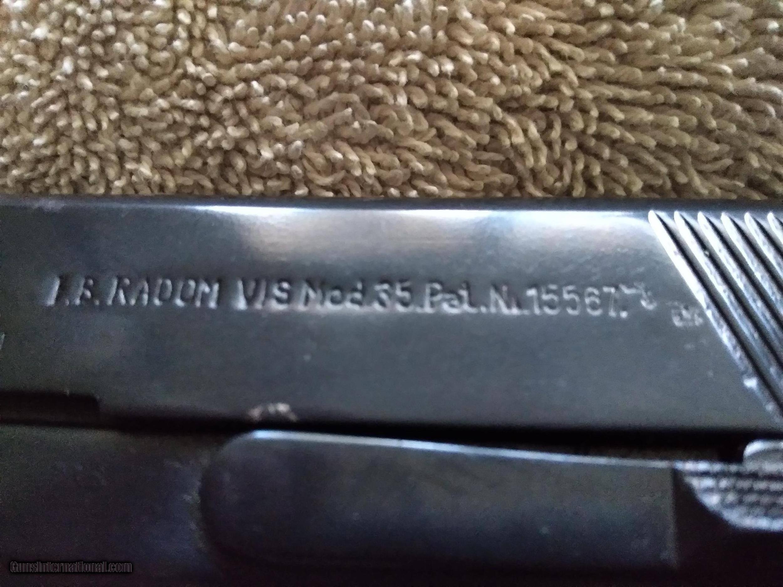 Description: POLISH/ GERMAN F.B. RADOM VIS 35 SEMI AUTOMATIC PISTOL 9mm S/N L3984 RIGHT SIDE OF FRAME ABOVE TRIGGER S/N L3984 INSIDE LEFT SLIDE RAIL GROOVE BELOW SLIDE STOP LATE WAR PRODUCTION 1944/1945 R 35 NAZI RADOM TYPE II THREE LEVER ( HAMMER DROP, TAKEDOWN AND SLIDE STOP ) NOT SLOTTED FOR SHOULDER STOCK REBLUED ( POSSIBLY HOT DIPPED ) WAFFENAMT WaA 77 ON LEFT SIDE OF SLIDE AND FRAME DIFFICULT TO SEE CLEARLY ( SEE PHOTOS ) WAFFENAMT WaA 833 ON LEFT SIDE OF SLIDE IN FRONT OF SLIDE SERRATION DIFFICULT TO SEE CLEARLY ( SEE PHOTOS ) S/N 984 WITH EAGLE WAFFENAMT ON LEFT SIDE OF BARREL LUG WAFFENAMT 823 OVER 5 ON RIGHT SIDE OF BARREL LUG BARREL HAS 883 IN FRONT OF BARREL LUG EXCELLENT BORE NO WEFFENAMT MARKS ON FRAME UNDER GRIPS BLACK PLASTIC FB GRIPS IN EXCELLENT SHAPE HAS LANYARD LOOP WITH A ( S AND G ) EITHER SIDE OF LAYNARD LOOP HAMMER DROP MUST BE PUSHED DOWN FIRMLY PITTING UNDER BLUING LEFT SIDE OF SLIDE ALONG HIGH EDGE PITTING UNDER BLUING RIGHT SIDE OF SLIDE ALONG HIGH EDGE FOR A INCH IN FRONT OF EJECTION PORT MAGAZINES ARE REPLACEMENT AFTERMARKET NOT ORIGIONAL WHITE NAIL POLISH ON FRONT SIGHT HAS BEEN REMOVED Shipping $20.00 USPS SOLD Curio/Relic: Yes Handgun Caliber: 9x19mm Parabellum (9mm Luger, 9x19mm NATO) Manufacturer: RADOM Model: VIS 35 Serial Number: L3984 Barrel Length: 4.75 in Bore: STRONG RIFLING Condition: GOOD Metal Condition: GOOD Bore Condition: Excellent Manufacture Date: 1944-1945 |