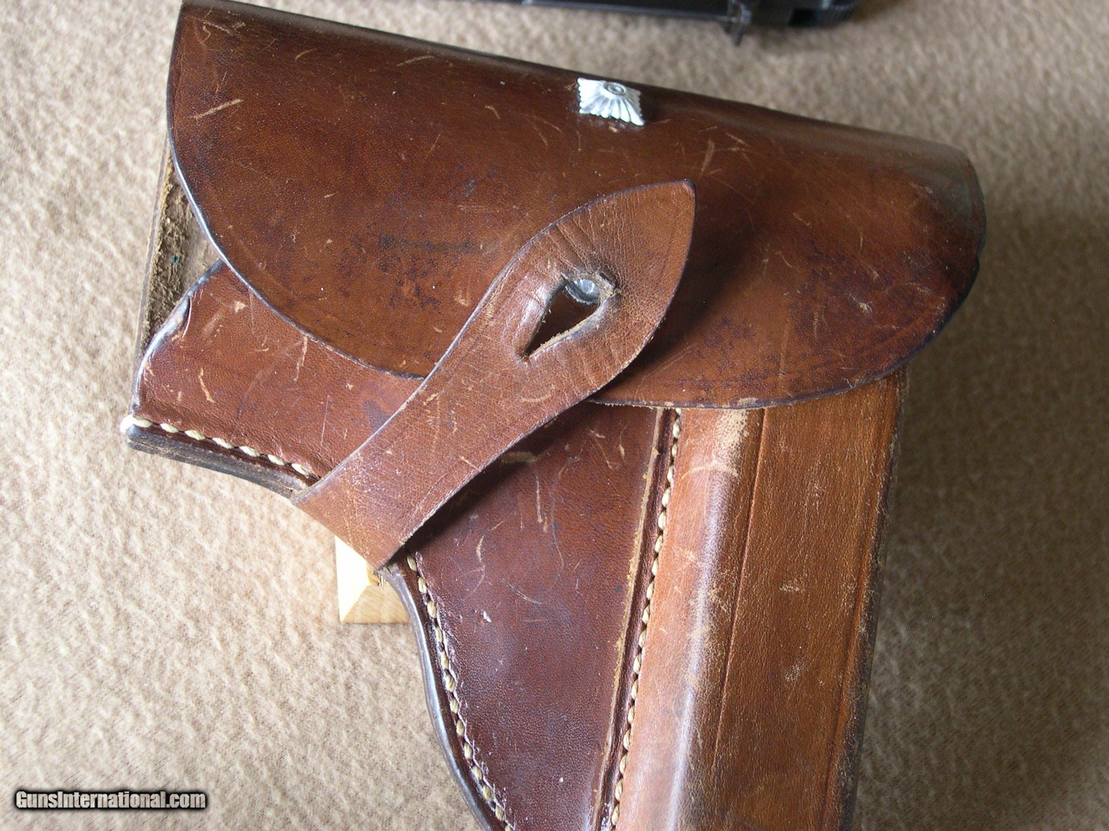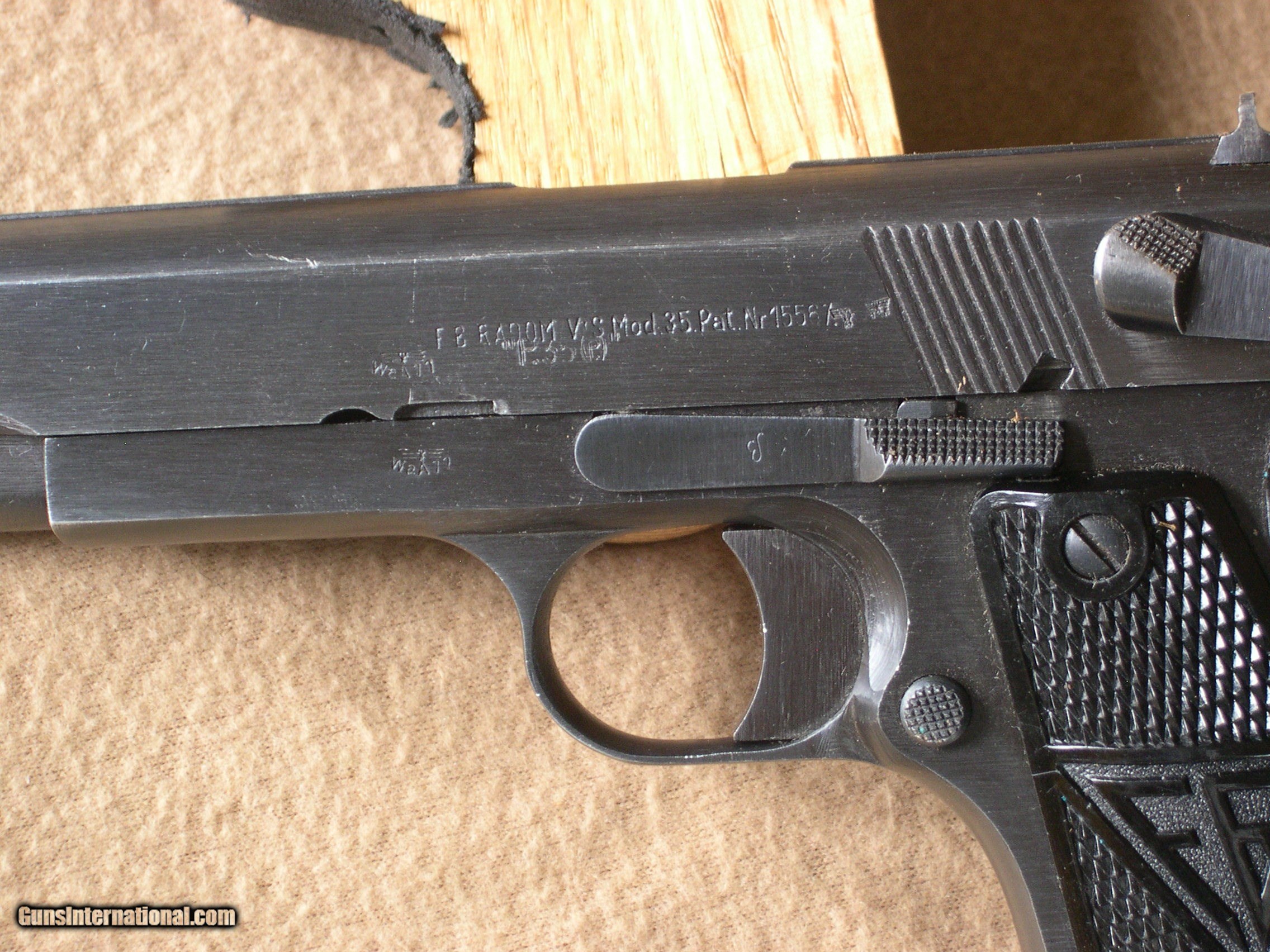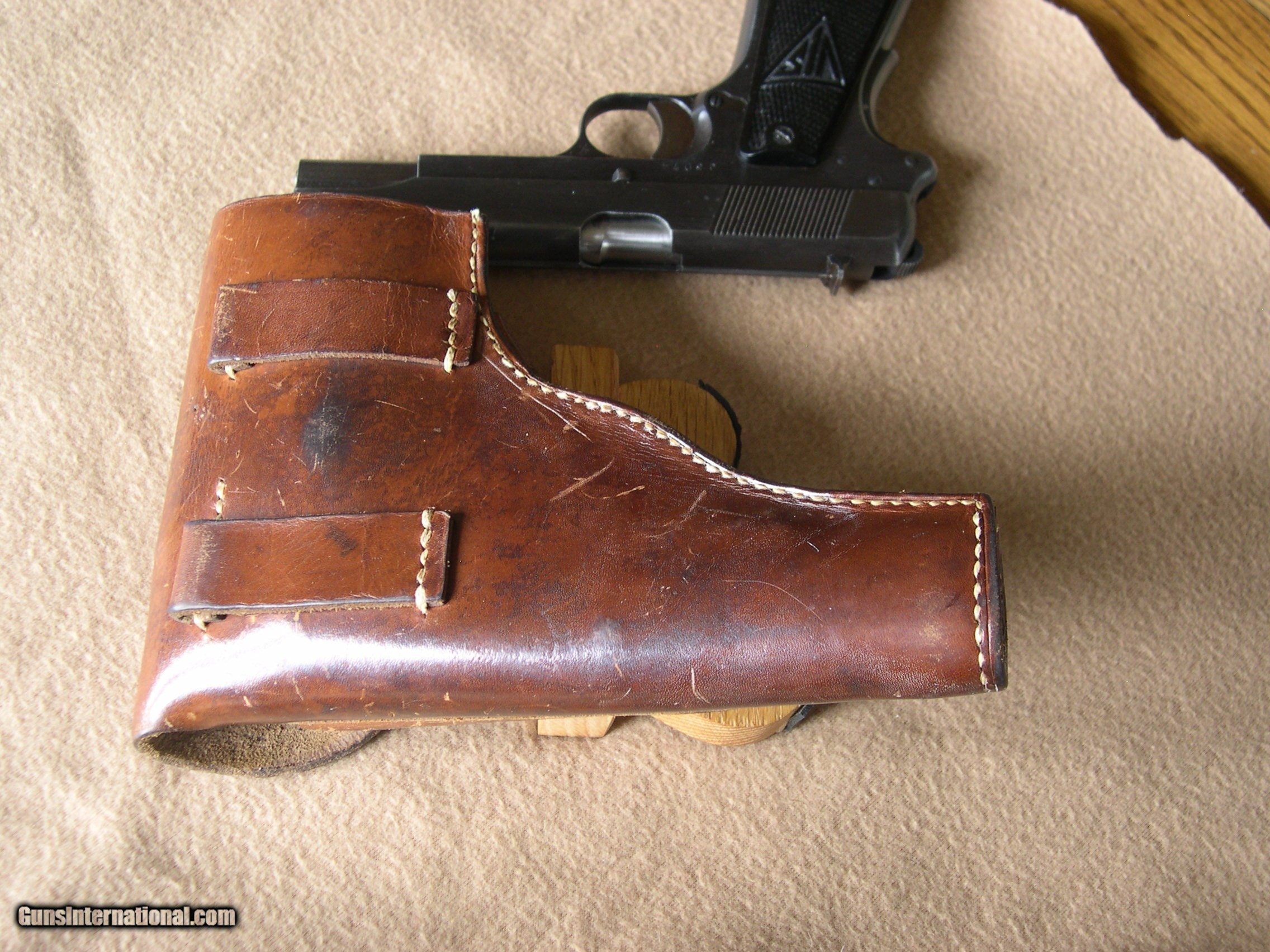 Description: Nazi proofed Radom w/holster original to gun, condition 99% and 100% original, Slide stamped, FB radom v.s.mod 35nr15567 waffenampt WEA #77 on slide & frame, gun has no marks or wear, 99.9% original blue, Holster is the same great condition, with P 35 stamped in green ink on inside of flap ! This is the best RADOM I have seen in years, (consignment gun) !! The pics do not lie. SOLD |