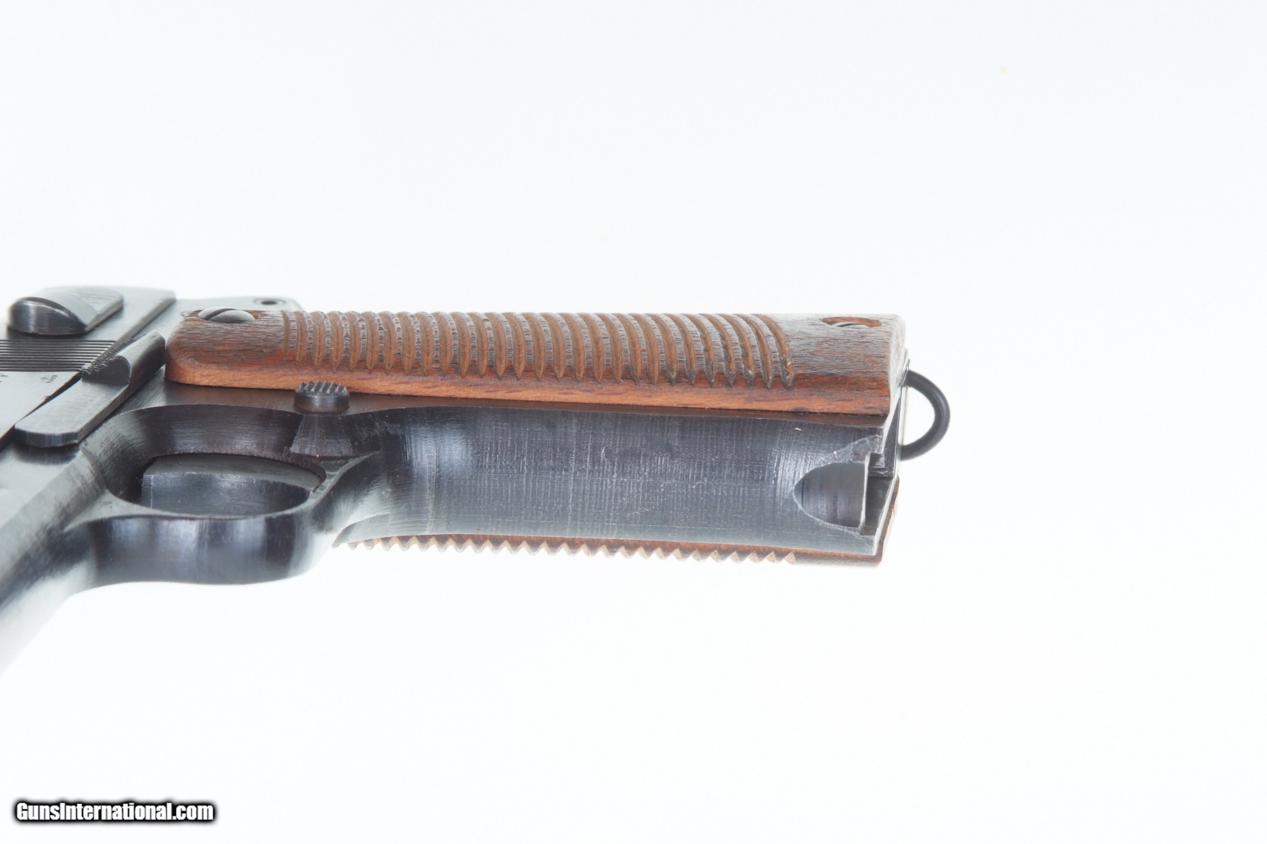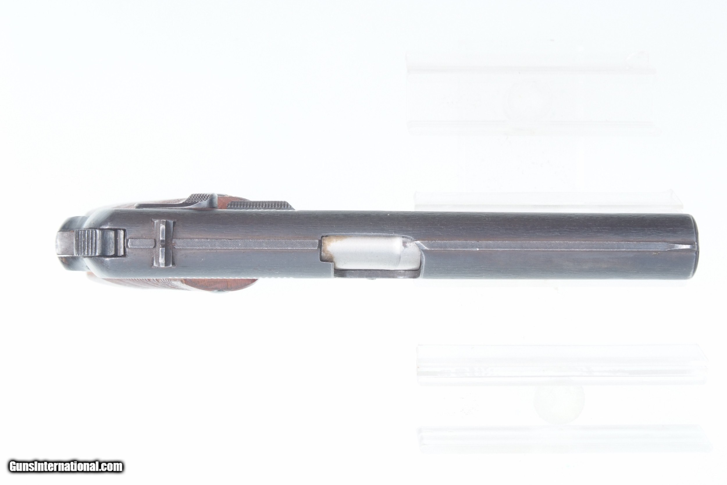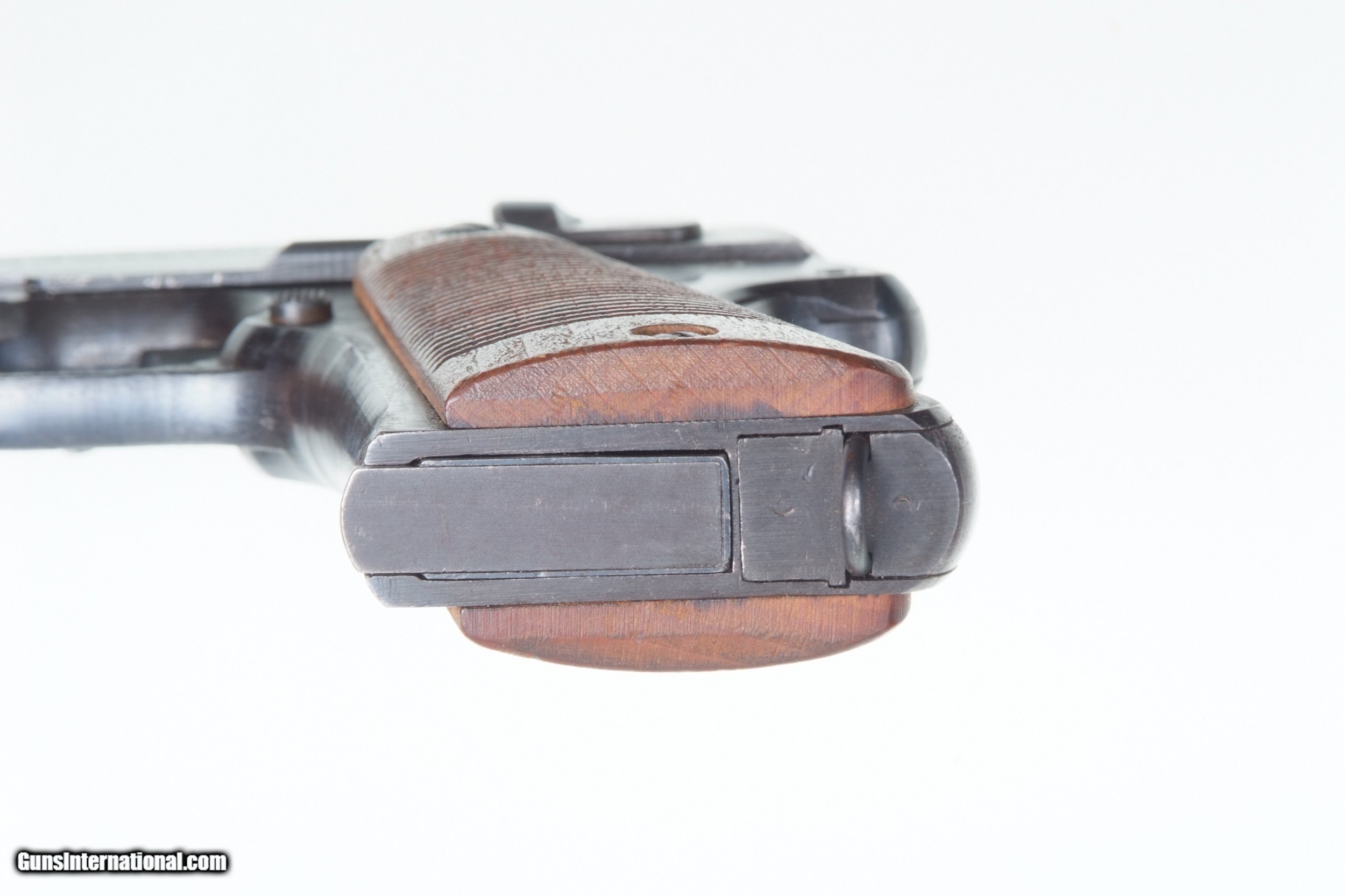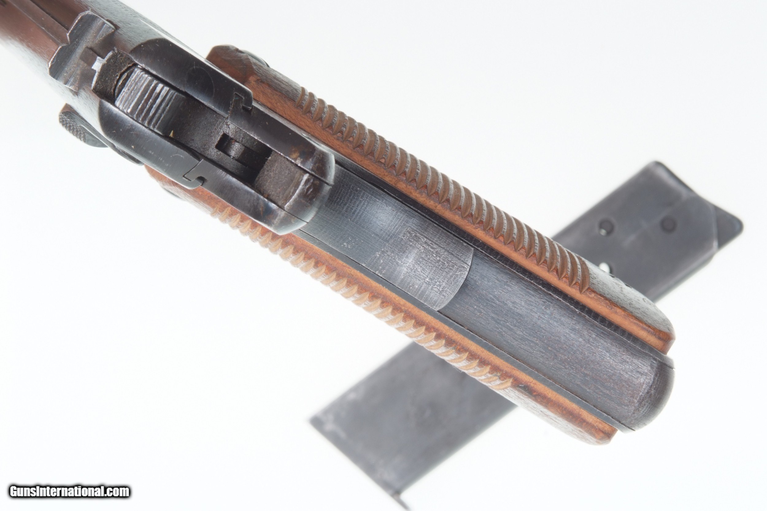 Description: Polish Radom, Late War, All Matching, Wood grips as issued to Nazi forces with correct magazine. SN: H1456. Cal: 9mmP. A very nice example of an all matching, late war, Type III Radom. Standard configuration pistol with fixed front and drift adjustable rear sight. Left side of slide marked with usual single line address specifying model and patent number. Full serial number on right side of frame, repeated inside slide and on barrel lug. Major components with E/77 acceptances. Serrated wood grips. Late war, roughly finished, unmarked magazine. Near excellent. Original blue, with sharp edge wear as befitting a service firearm that has been holstered but only minimally used. Comparable condition grips. Bright bore with sharp rifling. Decocking lever will need adjustment: it will retain slide in retracted position but will not decock hammer. Pistol will otherwise function as expected. SOLD Curio/Relic: Yes Manufacturer: Radom Model: VIS-35 Serial Number: H1456 |
