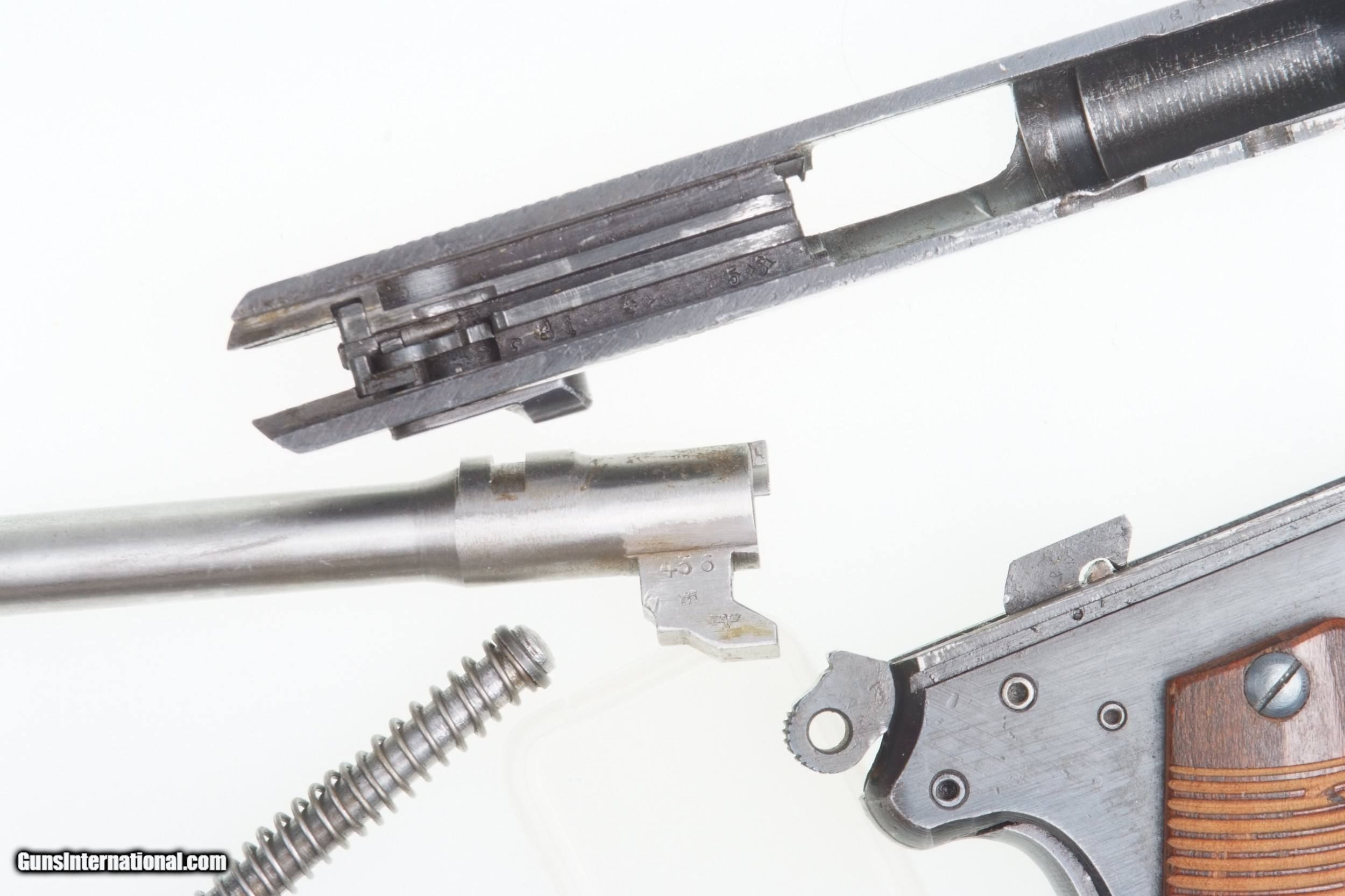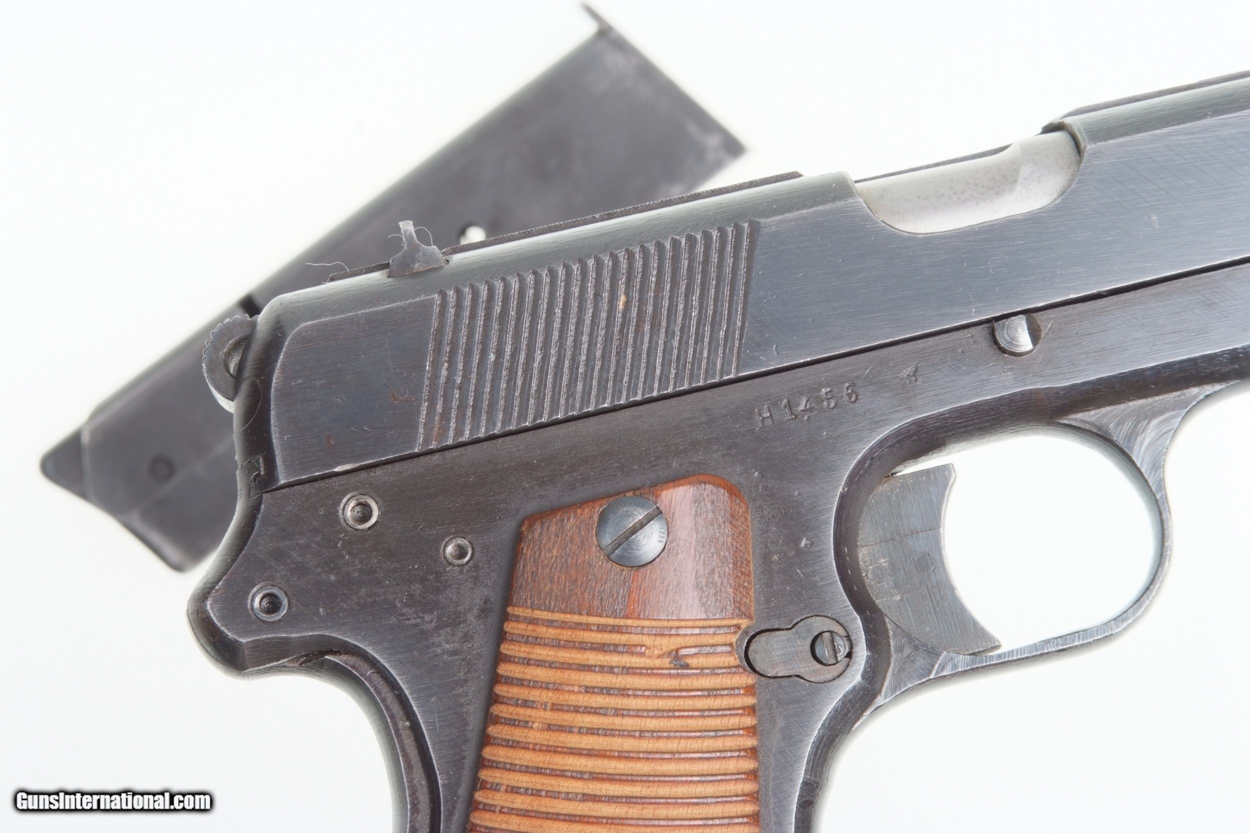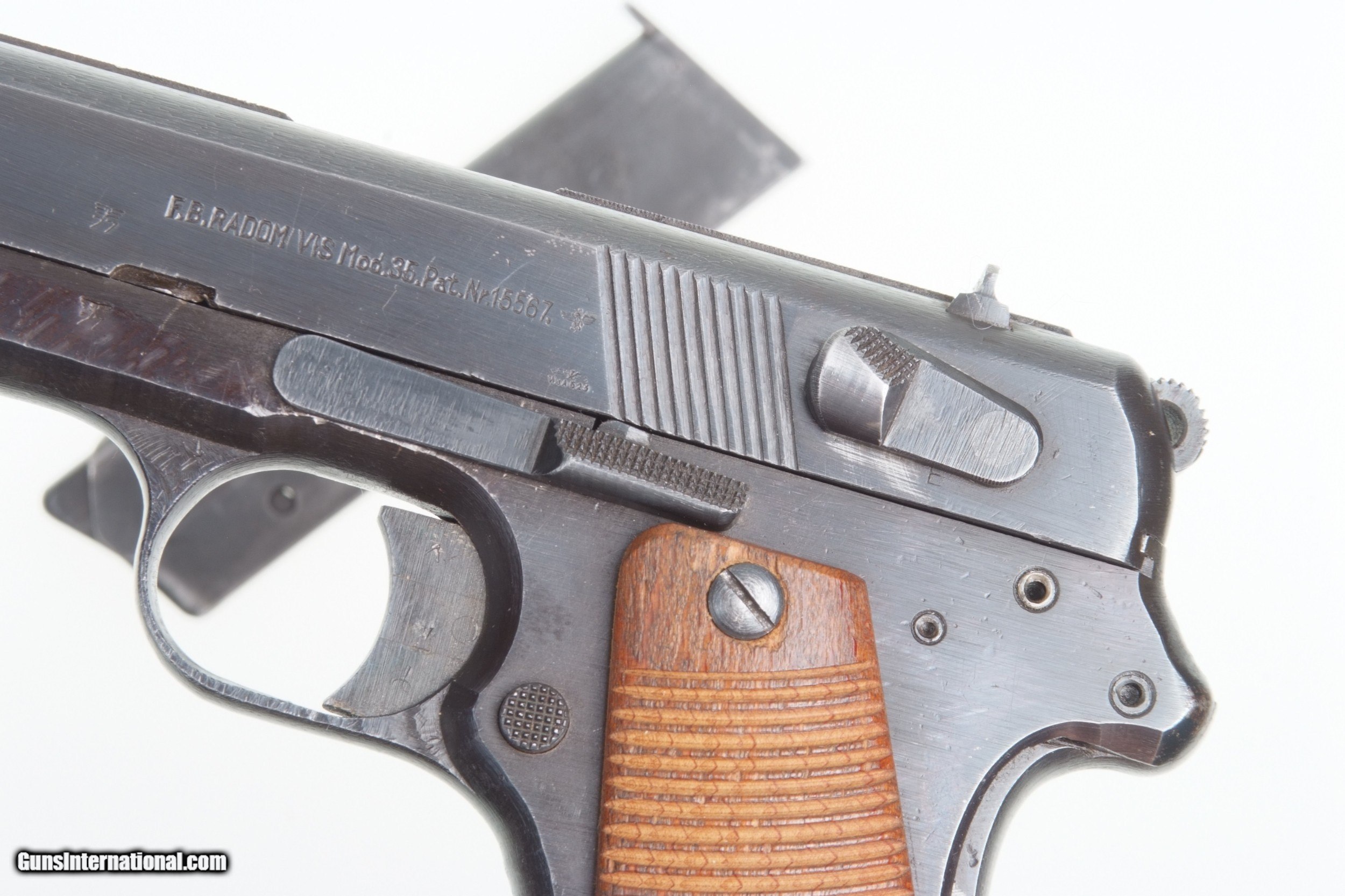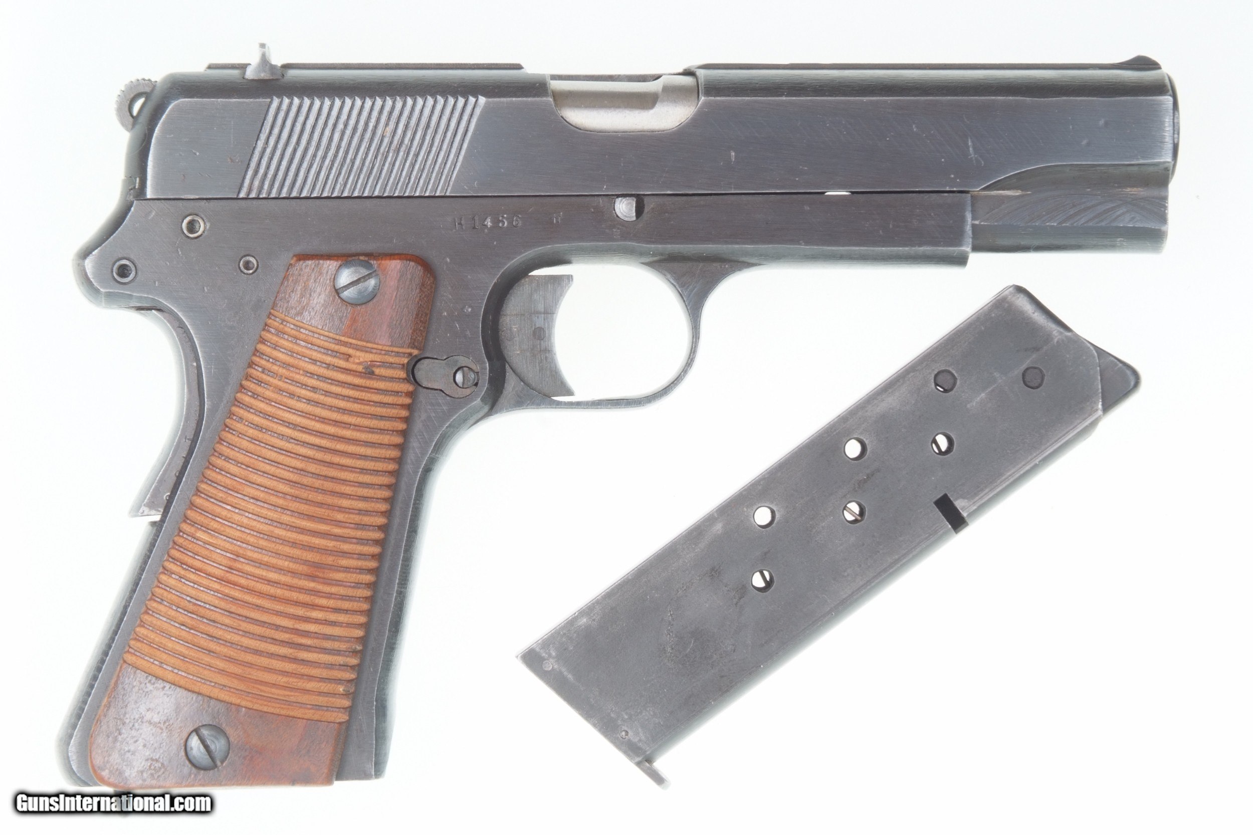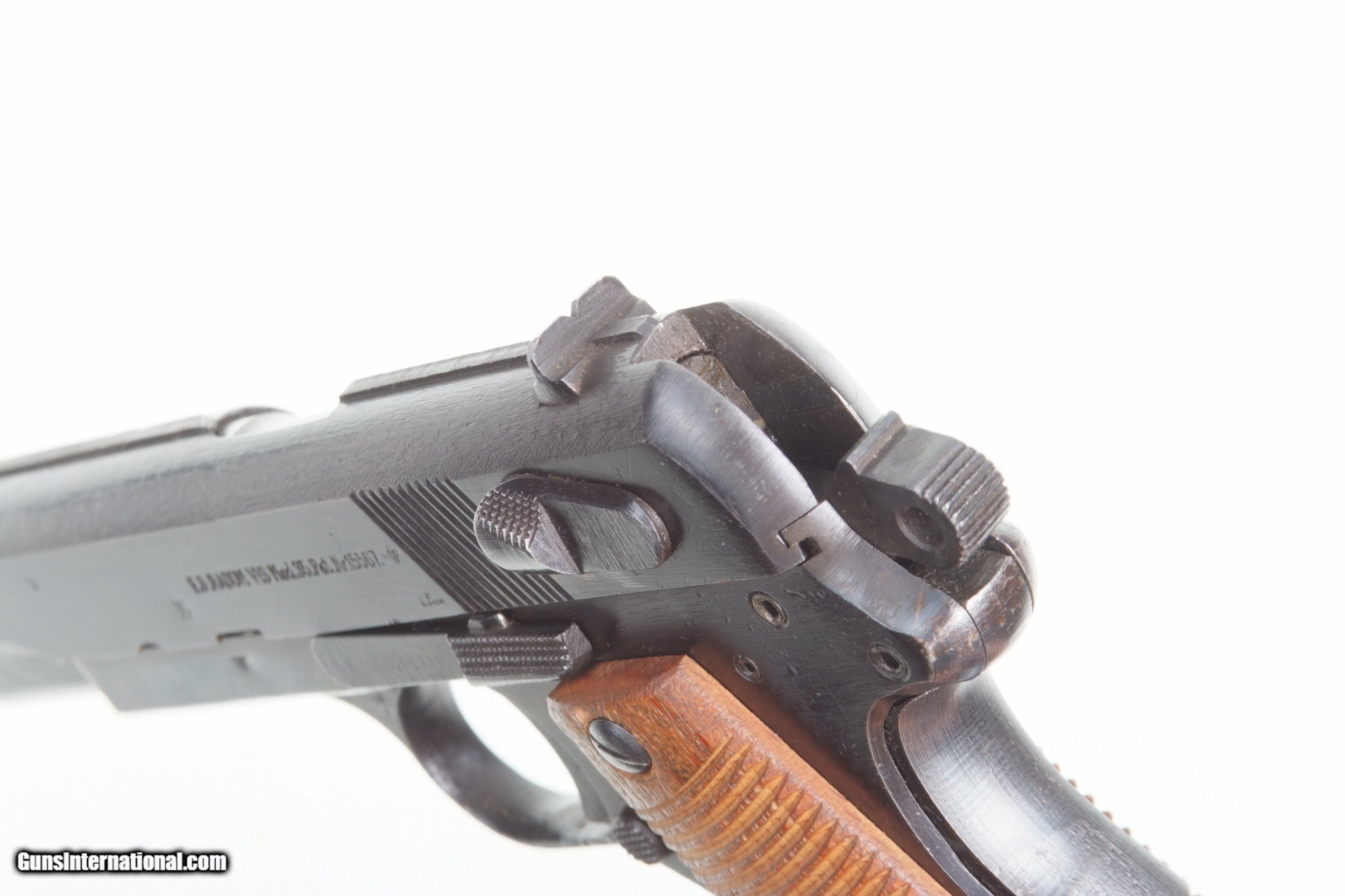 Description: Polish Radom, Late War, All Matching, Wood grips as issued to Nazi forces with correct magazine. SN: H1456. Cal: 9mmP. A very nice example of an all matching, late war, Type III Radom. Standard configuration pistol with fixed front and drift adjustable rear sight. Left side of slide marked with usual single line address specifying model and patent number. Full serial number on right side of frame, repeated inside slide and on barrel lug. Major components with E/77 acceptances. Serrated wood grips. Late war, roughly finished, unmarked magazine. Near excellent. Original blue, with sharp edge wear as befitting a service firearm that has been holstered but only minimally used. Comparable condition grips. Bright bore with sharp rifling. Decocking lever will need adjustment: it will retain slide in retracted position but will not decock hammer. Pistol will otherwise function as expected. SOLD Curio/Relic: Yes Manufacturer: Radom Model: VIS-35 Serial Number: H1456 |