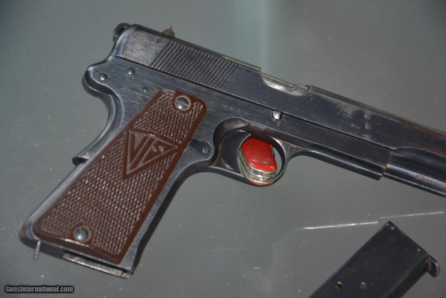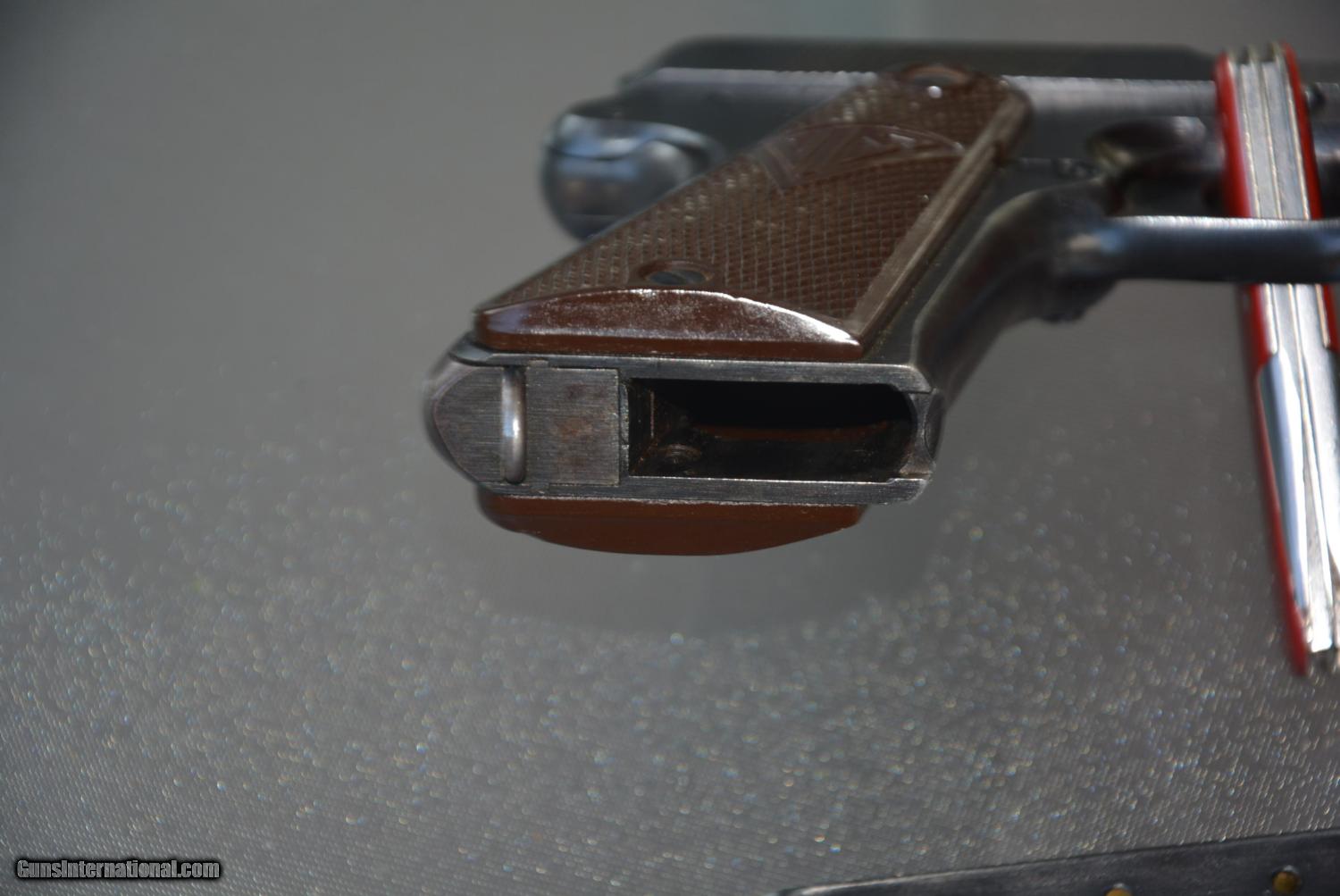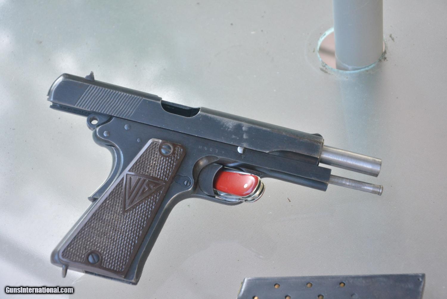 Description: This is an oridginal Radom vis model 35 action is crisp and cycles shell and fires. this is a type 2 has cocking lever load lever and disasembly lever or is called 3 lever no rear slot. Has the rear grip safety just like 1911 . Shows all the waffen 77 marks and swastika grips show no cracks or chip all # match and bore looks great.the finish is of the early type 2 with less styrations and smoother finish . there is normal holster wear and more loss on the right side from holster sliding in an out. all marking sharp and clear. Many old timers claim is one of the worlds finest made pistols bar none. serial # denotes is world war 2. about 1942 we know Germany invaded Poland much early ..........this came from a ww 2 vet who brought it back. there is no X marked in side of the grips which the russians did when captured from a german soldier. this is a nice clean solid pre ww 2 peice,,,,,I can ship to , C&R or your FFL......shipping is $35. dollar includes insurance. I accept us postal money order SOLD Curio/Relic: Yes Manufacturer: Radom Model: Vis 35 Serial Number: H4037 Caliber Info: 9mm Condition: very good Metal Condition: very good Bore Condition: excellent Action: excellent |