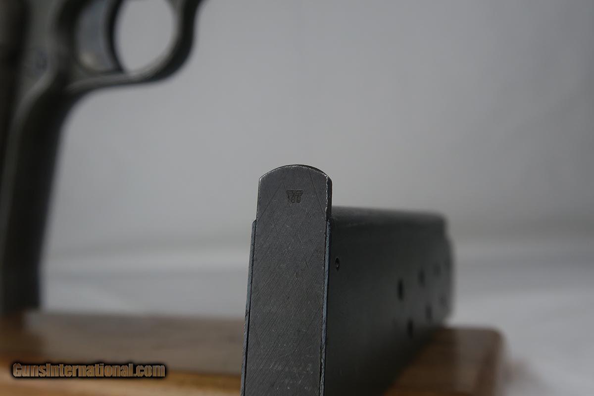 Description: This is an increasingly hard-to-find Steyr produced Radom with late-war phosphate finish. There were only ~22,000 of these produced and this is the first we've been able to get our hands on in at least a year! This specific pistol is also photographed and documented on pg. 220 of William York's VIS Radom book. It is all correct, matching and original with some blued small parts. The phosphate finish is largely in very good condition with some minor freckling on the right side of the slide. Original wood grips and a waffen proofed magazine. Bore has strong rifling but some frosting. SOLD Curio/Relic: Yes Manufacturer: Radom Model: VIS 35 / P.35 Serial Number: K5548 Caliber Info: 9mm Bore: 6/10 Condition: Very Good Manufacture Date: 1945 |