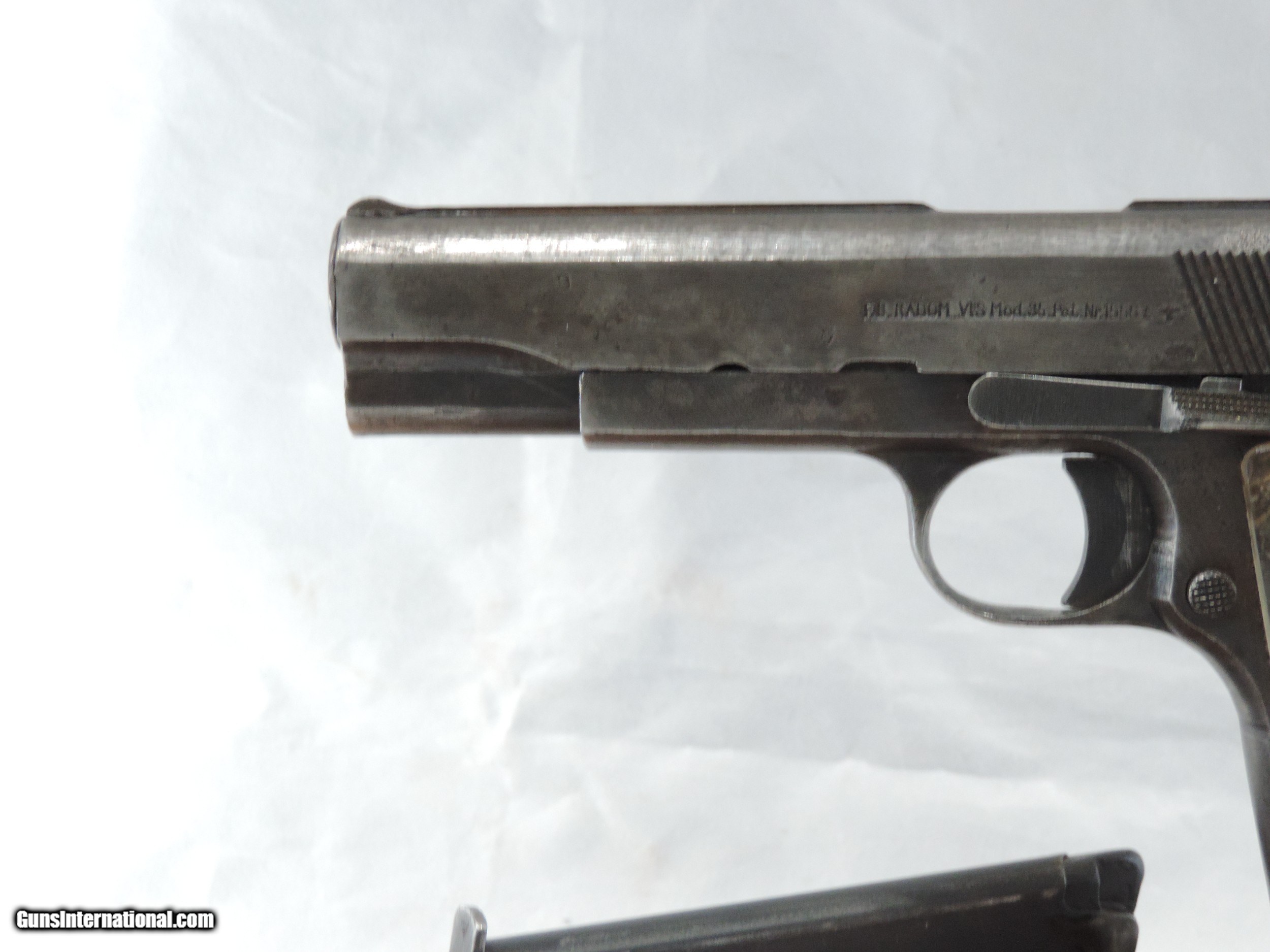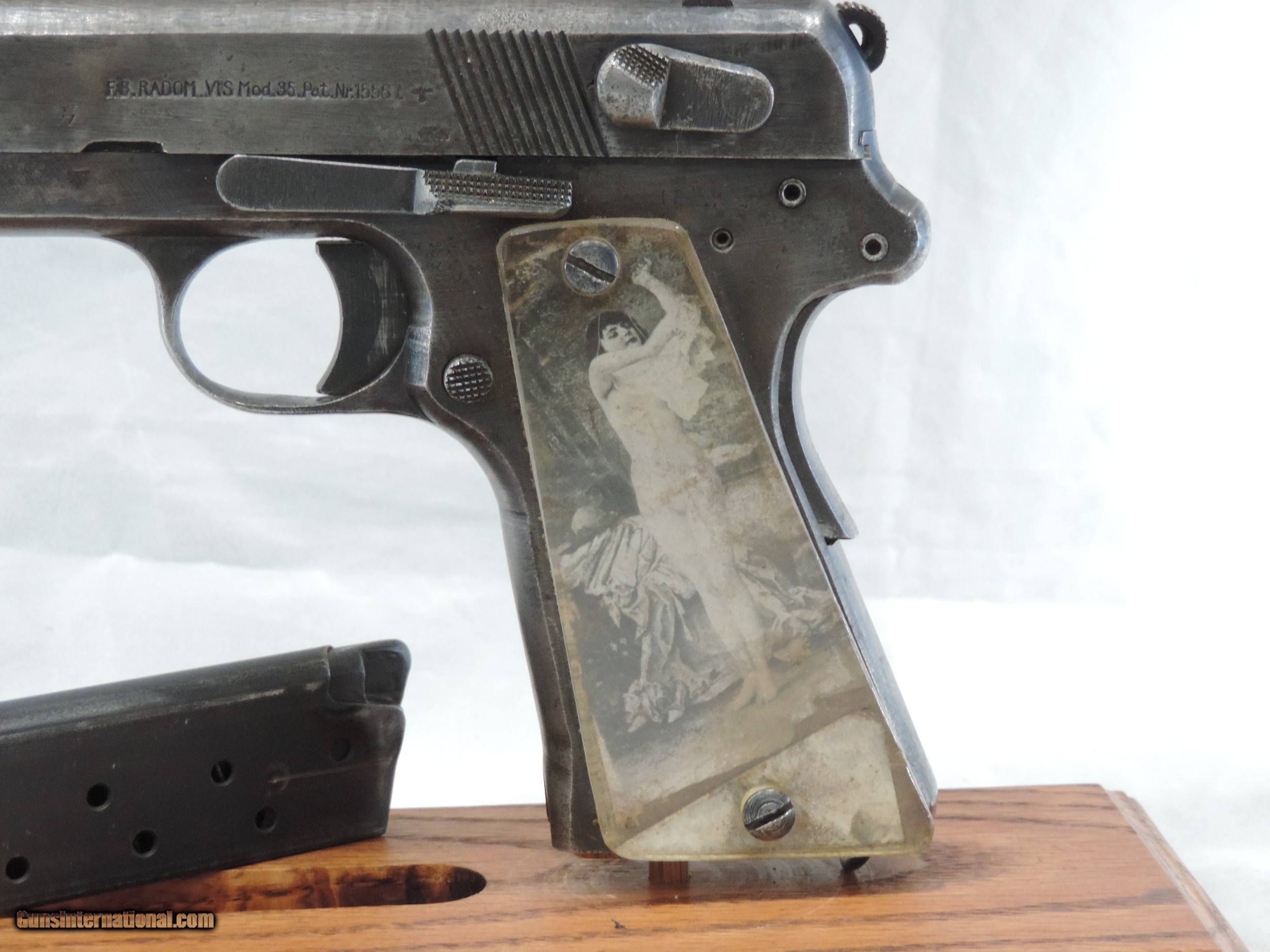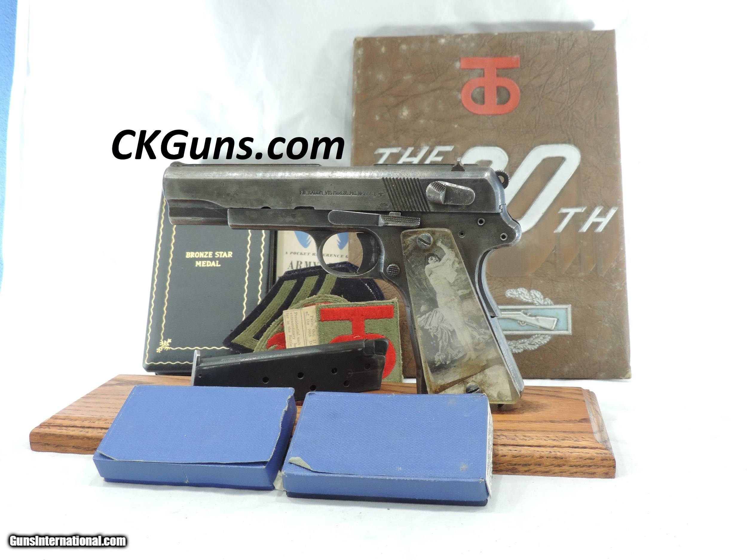 Description: INV. 9194 WOW!!, NAZI P-35 POLISH RADOM, CAL 9MM, SER. G 5039. THIS G.I. BRINGBACK P-35 HAS AN AWESOME STORY. THE GUN IS HOLSTER WORN TO ABOUT 40% OF THE ORIGINAL FINISH EXCEPT FOR A FEW SCATTERED PIN PRICKS. ALL NUMBERS MATCH AND HAVE THE PROPER WAFFENAMTS. THE BORE IS VERY BRIGHT WITH CRISP SHARP RIFLING AND LIGHT SCATTERED FROST. THE GUN APPEARS TO BE FULLY FUNCTIONAL. THE GRIPS ARE LUCITE REPLACEMENTS. WE THINK THAT THE DECEASED GOT THIS NAZI SOLDIER'S GUN WHEN HE WAS WITH THE 70TH INF. DIV DURING THE INVASION OF FRANCE. WE THINK THE GRIPS MIGHT HAVE BEEN MADE FROM A DOWNED PLANE. BEHIND THE LEFT GRIP IS A VERY OLD PICTURE OF A NAKED GIRL. THE RIGHT GRIP ALSO HAS A NAKED GIRL AND A DRIED FOUR LEAF CLOVER. THE PICTURES ARE TYPICAL OF THOSE FOUND ON FRENCH POST CARDS PRIOR TO WWII. INCLUDED WITH THE GUN ARE ALL OF THE RIBBONS AND MEDALS WON BY THE G.I. PLUS A BRONZE STAR WITH THE ORIGINAL CASE, A COMBAT INFANTRY MAN'S BADGE AND ASSORTED MEDAL RIBBONS, HIS DOG TAGS, UNIFORM INSIGNIAS, A WARTIME HISTORY OF THE 70TH INFANTRY, AND AN ONE PROPER RADOM MAGAZINE. FOR THE WW II HISTORIAN IT IS A GREAT FIND, MODESTLY PRICED..$1295.*** ***100% PURCHASE SATISFACTION GUARANTEED To purchase this firearm or if you want to request more information contact us at: Email ckguns[at]ymail[dot]com Phone 201-512-0002 Cell 201-575-6838 FAX 201-215-4759 We accept most major credit cards. Prices shown are Discounted 3% for Cash or Check. The buyer must be familiar with all the laws governing the purchase and the ownership of firearms in their own city and state. The Yankee Armorer, Inc is not responsible for any failure to comply with or observe these laws. The Yankee Armorer, Inc will only ship after full payment and receipt of all required documents. Shipping: Add $35.00 for handguns, $45.00 for long guns. New Jersey buyers are subject to a 7% sales tax. The Yankee Armorer, Inc offers a 3 day inspection period with full refund upon return of intact firearm and in the original condition. The Yankee Armorer, Inc offers a no interest lay away program - 25% down; 25% in 30 days; 25% in 60 days; and full payment in 90 days. Any violation of this policy is subject to restocking and forfeiture of all payments. Any variation from this policy must be agreed to in advance. Unshipped Cancelled sales are subject to a 20% restocking fee. Be advised that all firearms sold by The Yankee Armorer, Inc. or the Gun Exchange, LLC (SELLER) are sold as collector’s items. They have not been fired or tested for safety and must be examined by a license gunsmith prior to use. By purchasing any item from the (SELLER), you are agreeing to hold the (SELLER) free from any damages or lawsuits of any nature. Any item left for transfer or storage will be charged to $25.00 per month, per item from the day of its receipt. Any variation from this policy must be agreed to in advance. Store hours 10:00 am to 5:00 pm Tuesday -Saturday. It's always best to call for appointment. Store 201-512-0002, cell 201-575-6838. SOLD Handgun Caliber: 9x19mm Parabellum (9mm Luger, 9x19mm NATO) |