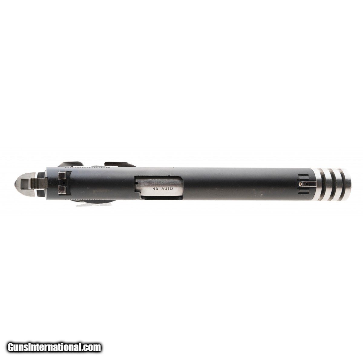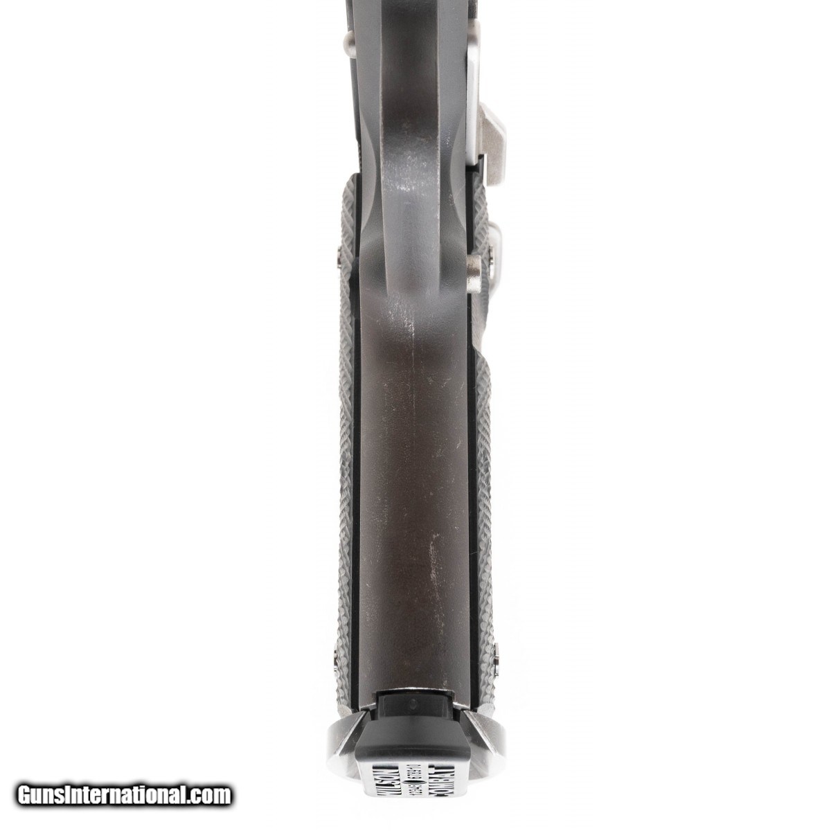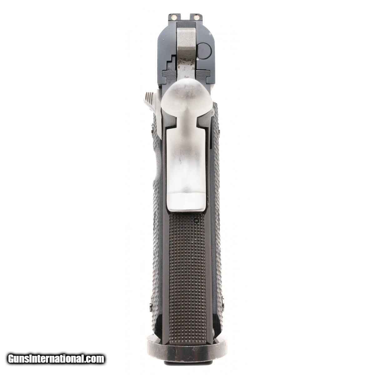 Full size custom 1911 with 5"" barrel and mounted 3 port compensator. Two tone black and stainless finish and g10 grips. Has checkered backstrap, flared magwell, extended safety, slide release and beaver tail. Has some wear from use and is overall good plus condition.