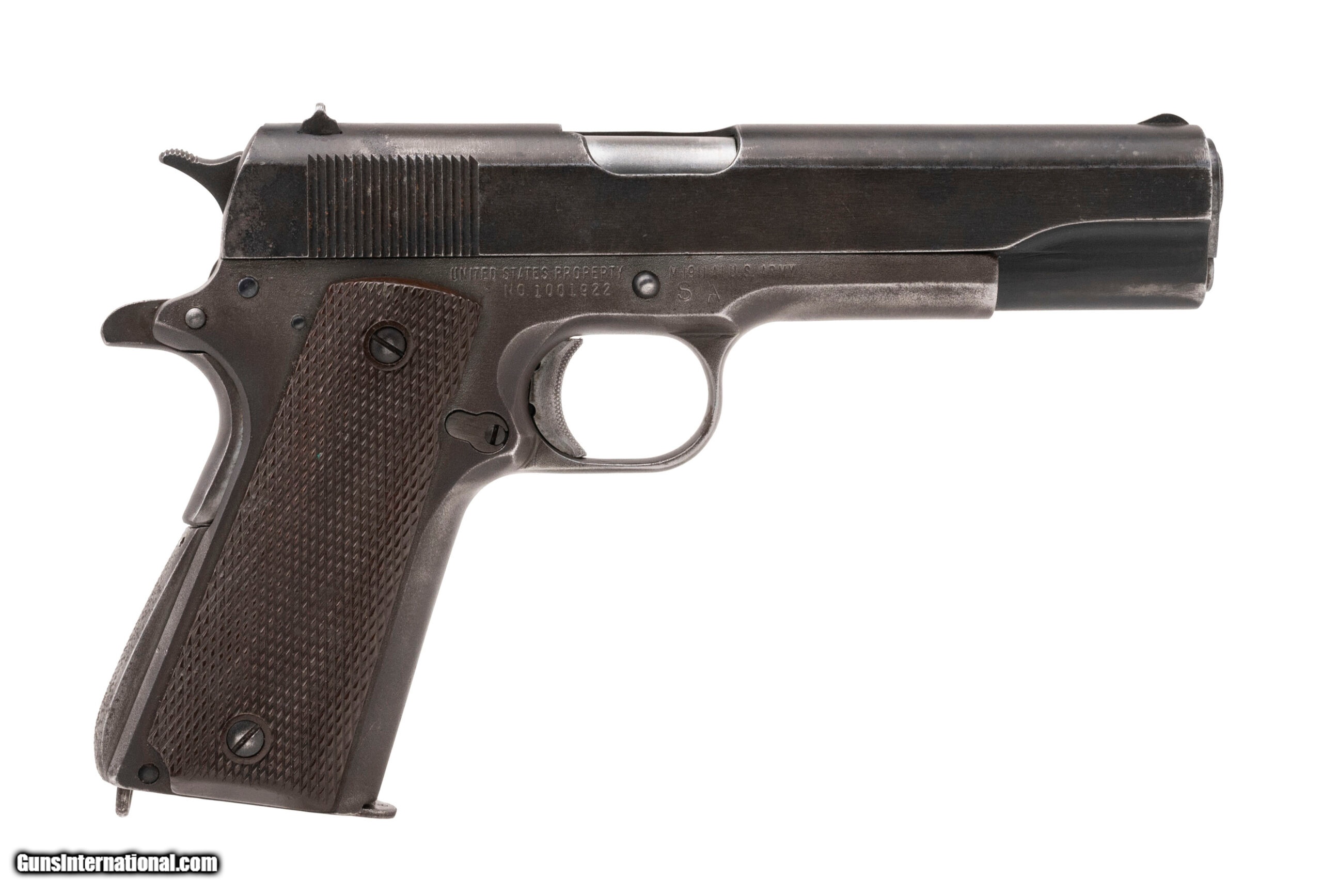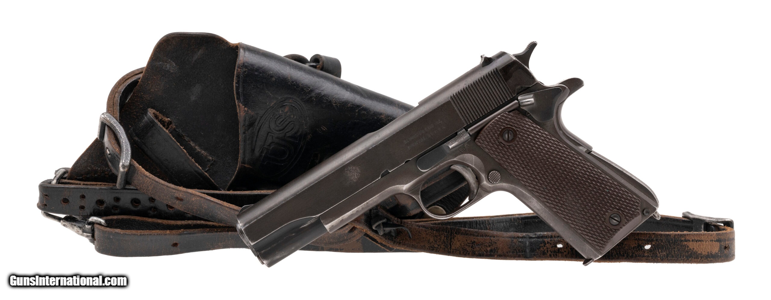 Description: "Serial No. 1001922, circa 1943, .45ACP, 5" round barrel. Bore is bright with light surface frosting visible, rifling remains strong. Refinish blue has turned to a light grey patina with scattered areas of smooth oxidation noted. Slide is marked “REMINGTON RAND INC./SYRACUSE. N.Y. U.S.A." Left side of frame has “F.J.A./P" while the right is marked “UNITED STATES PROPERTY/ No. 1001922-M19911 A1 U.S. ARMY/SA". Checkered grips remain sharp with minimal wear noted. Action is smooth and functions correctly. Pistol comes with a WWII M7/M9 Black leather holster in overall very good condition with embossed “US". SOLD |