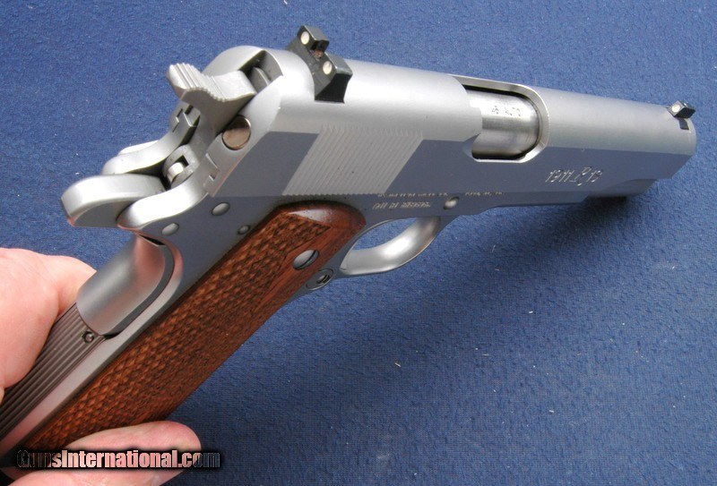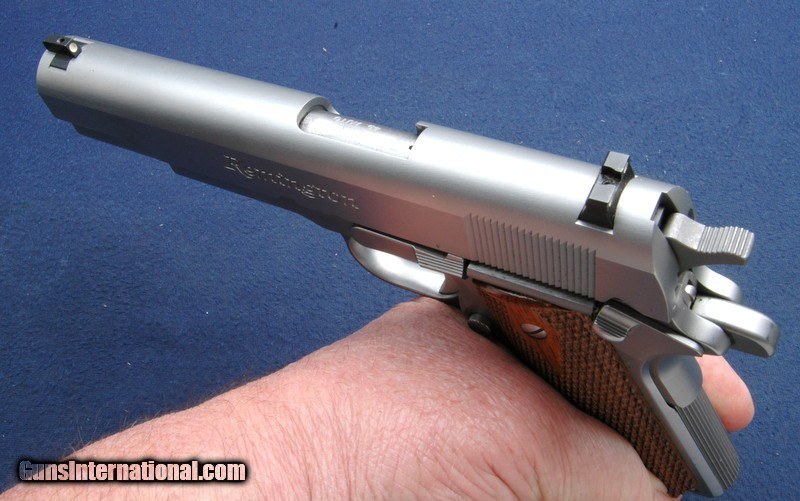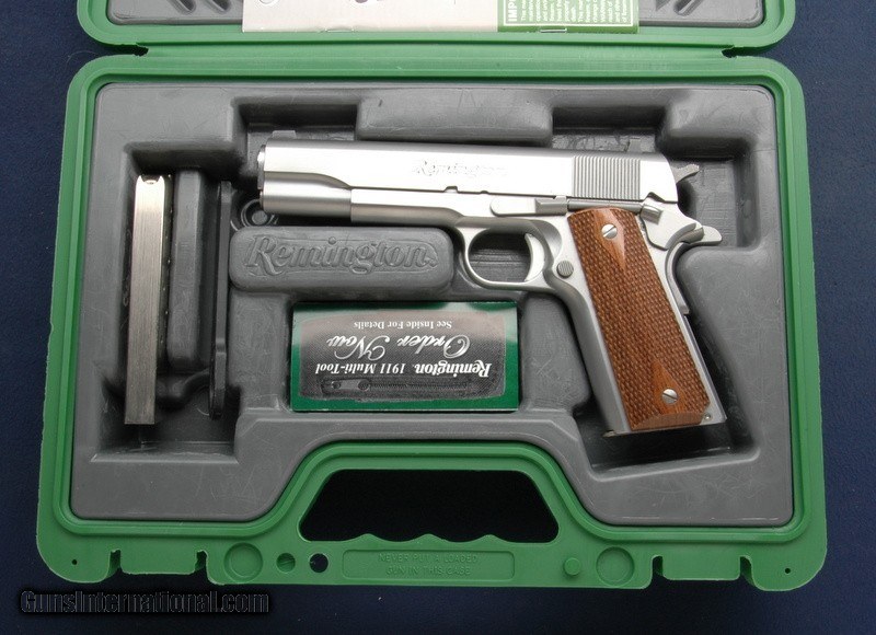 Description: If you're looking for a step up from the Rock Island 1911s, suggest you consider the Remingtons. Very clean, very sharp and well done. This has a gorgeous satin stainless finish and a mint bore. Comes in the Remington hard case with all inserts plus two 7 round Remington factory magazines. Nice walnut double diamond grips too. $45 shipping to the lower 48, 3% surcharge for using a CC. If you pay with a personal check, you can expect us to hold the item for up to 10 days to ensure that the check clears. SOLD Handgun Caliber: .45 ACP (.45 Auto) |
