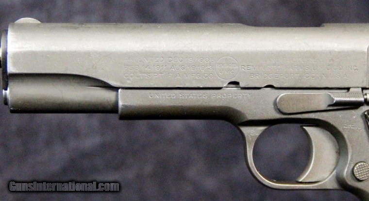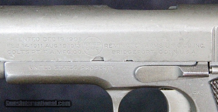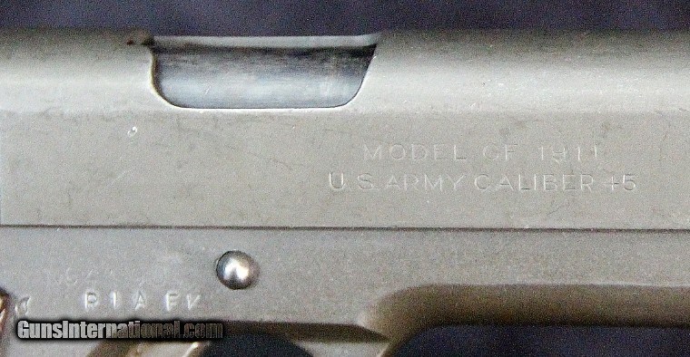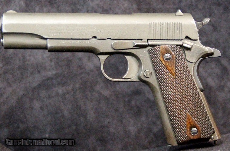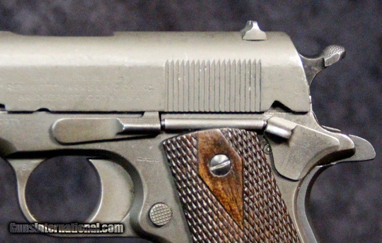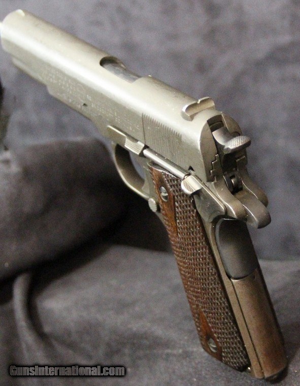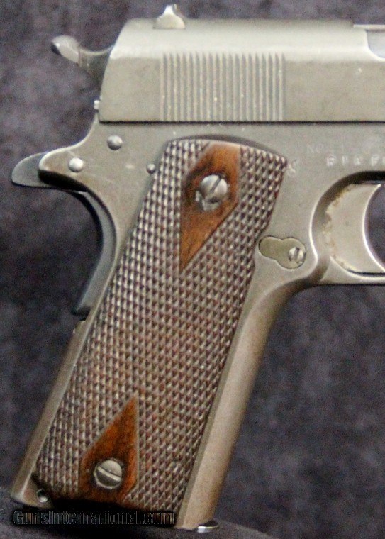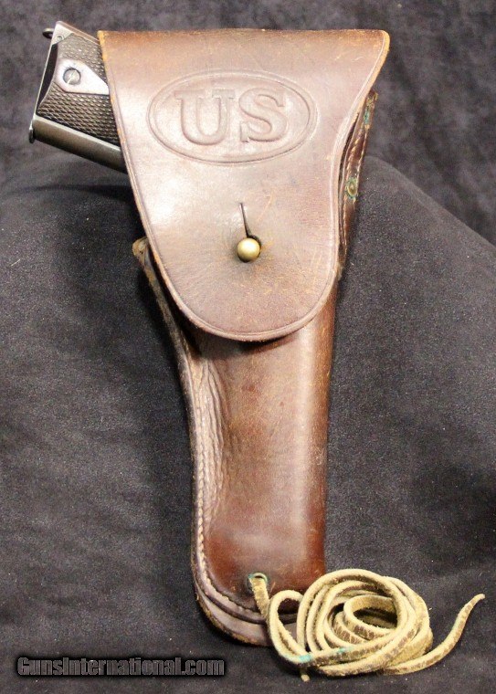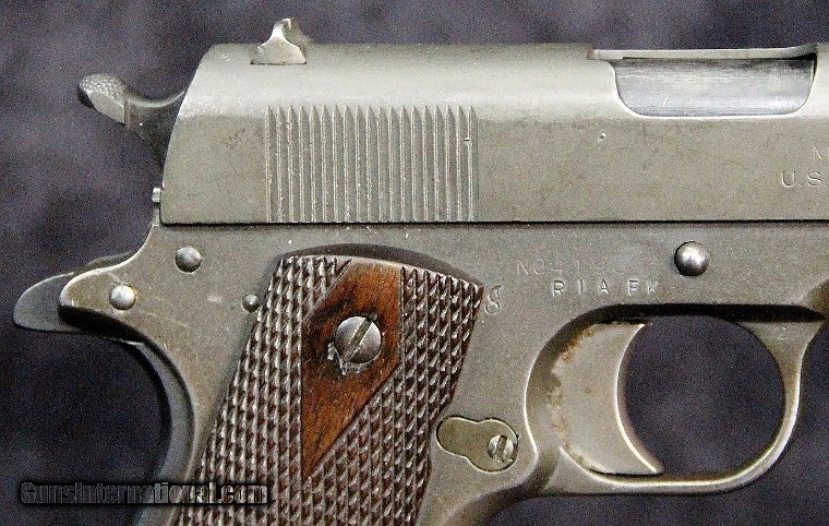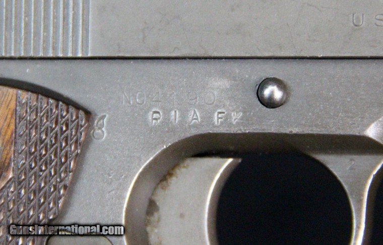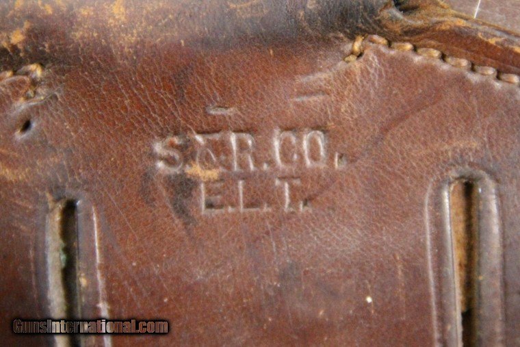 Description: .45acp, #4190, 5 inch barrel, armory finish, 2 piece walnut grips, with holster marked "S&L Co/ELT" , unmarked magazine, left side of frame stamped "RIA FK" (Frank Krack), left side marked "EEC" (Edmund Chapman),1918. Condition: excellent bore, 90% finish overall, excellent grips, excellent mechanically, excellent marks. SOLD Curio/Relic: Yes |