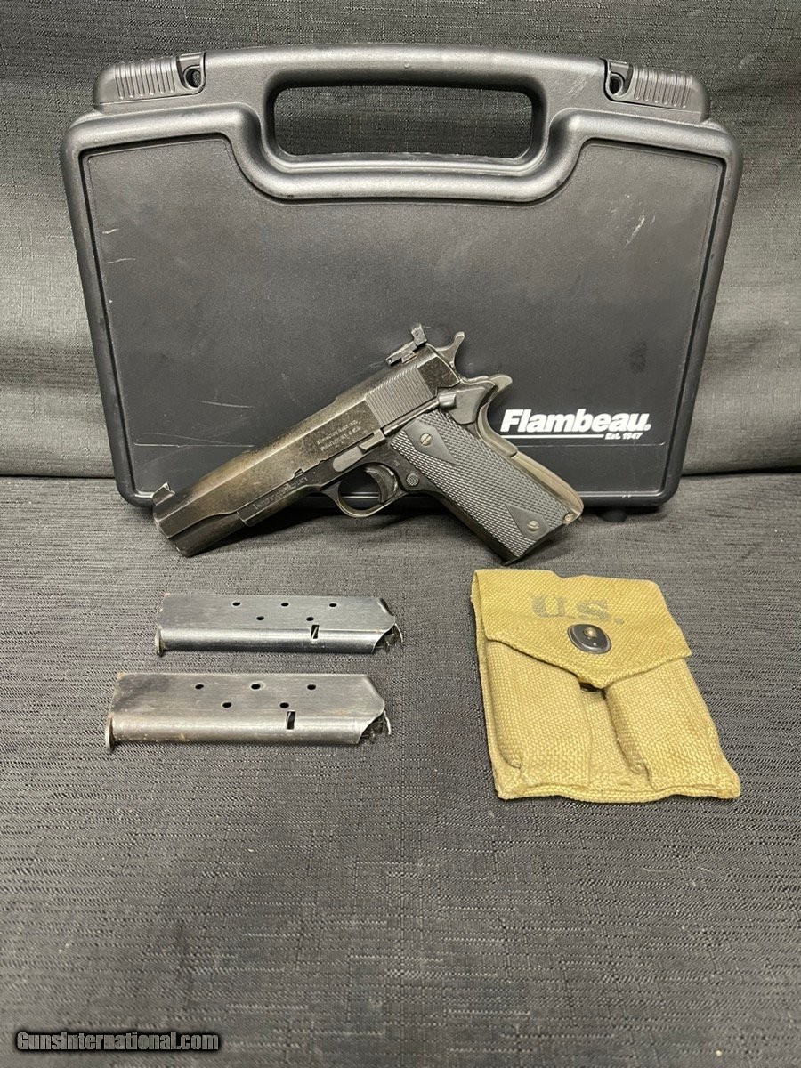 Description: Guns Listing ID: 602398 PISTOL: REMINGTON ARMS COMPANY MODEL 1911 GOVERNMENT 1943, COLT 1918 TO WW2 FRAME, BROUGHT INTO WW2 SERVICE, POST WAR MODS, SERIAL NUMBER 462103, SEMI - AUTOMATIC, 45 ACP (45 AUTO), BLUE, INCLUDES HARD CASE, WW2 1943 POUCH, 2 XTR MAGS, 5 1/2\", CP2016209 Curio/Relic: Yes Manufacturer: REMINGTON Model: 1911 GOVERNMENT Caliber Info: 45 ACP (45 Auto) Condition: Used - Non-Certified Barrels: 5 1/2" BARREL Action: SEMI AUTOMATIC Finish: Blue Price: $1,299.99 Contact Seller |