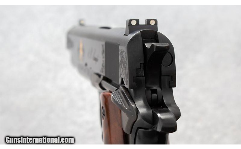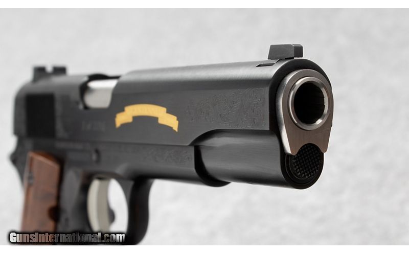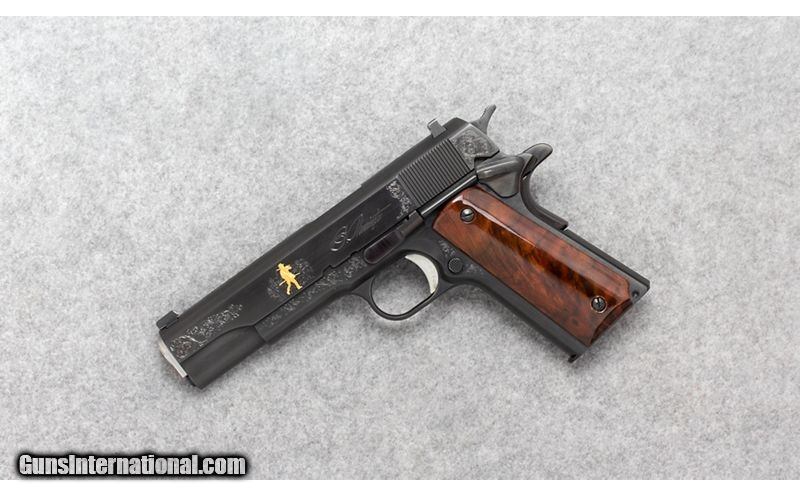 Description: This pistol is part of a Limited Edition series of laser-engraved firearms to commemorate Remington's 200th year as an American Gun Maker. With a limited run of 2,016 pistols, this firearm features a sculpted 24-karat gold inlay portraying the company's founder, Eliphalet Remington, walking with his first forged barrel. The engraved blued frame and slide are accented by beautiful C-grade walnut grips. This pistol comes with its commemorative Bicentennial box and is an excellent addition to any collection. .45 Auto SOLD Chambers: 7 Barrels: 5 Weight: 2.45 lbs Item Location: Farmington, UT |