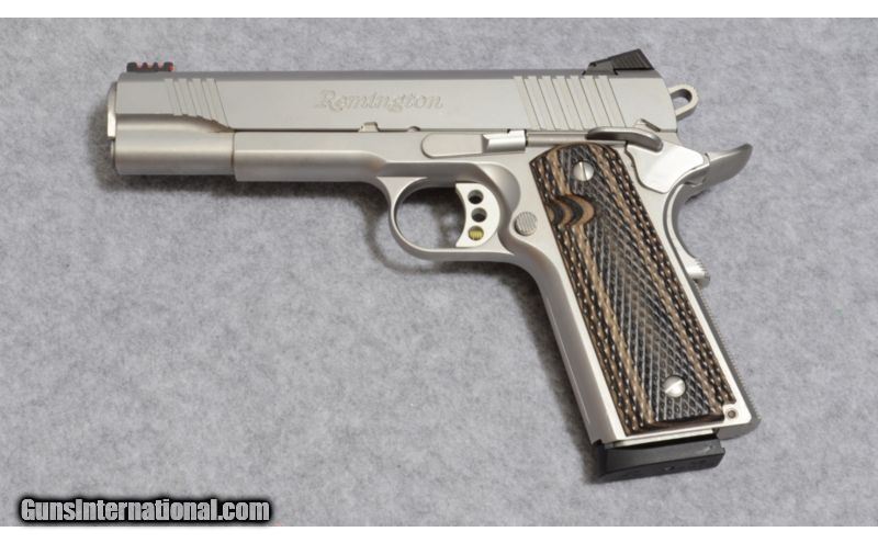 Description: This is a nice stainless steel Remington 1911 R 1S pistol in .45 ACP. The stainless steel frame, slide and barrel are new looking but the pistol has been fired a little. The double diamond checkered lamanant grips are as new with no flat spotting. This nice pistol is ready for the field and range. SOLD Caliber Info: .45 ACP Metal Condition: Excellent Bore Condition: Excellent Barrels: 5 Stock: Factory Grips Weight: 40 ozs. Sights: Fixed Extras: Comes With Case And 2 Magazines Item Location: Tulalip, WA |
