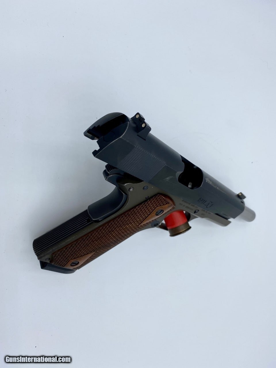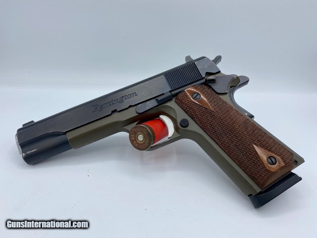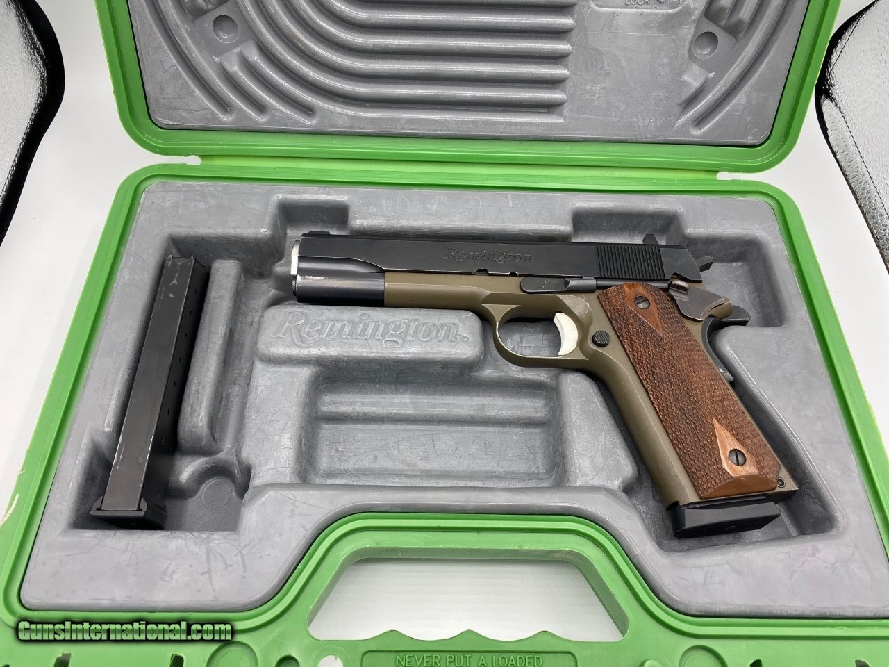 Description: Guns Listing ID: 570073 This is a pre-owned 1911 R1 in good condition. Comes with 2-8+1 magazines in original case. Match-grade stainless steel 5\" barrel and bushing Flared and lowered ejection port Two-dot dovetailed rear sight with single-dot dovetailed front sight Double-diamond walnut wood grips Satin black oxide metal finish Weight 38.5 ounces Carbon steel frame and slide I#0364875 BEO SOLD Manufacturer: REMINGTON Model: 1911 R1 Caliber Info: .45 ACP Condition: Used - Non-Certified Barrels: 5 BARREL Finish: BLACK & GREEN |