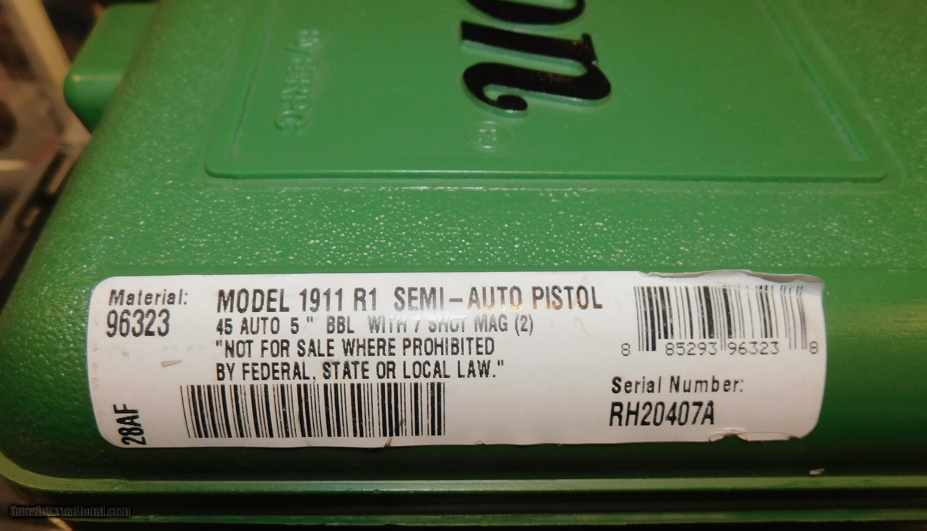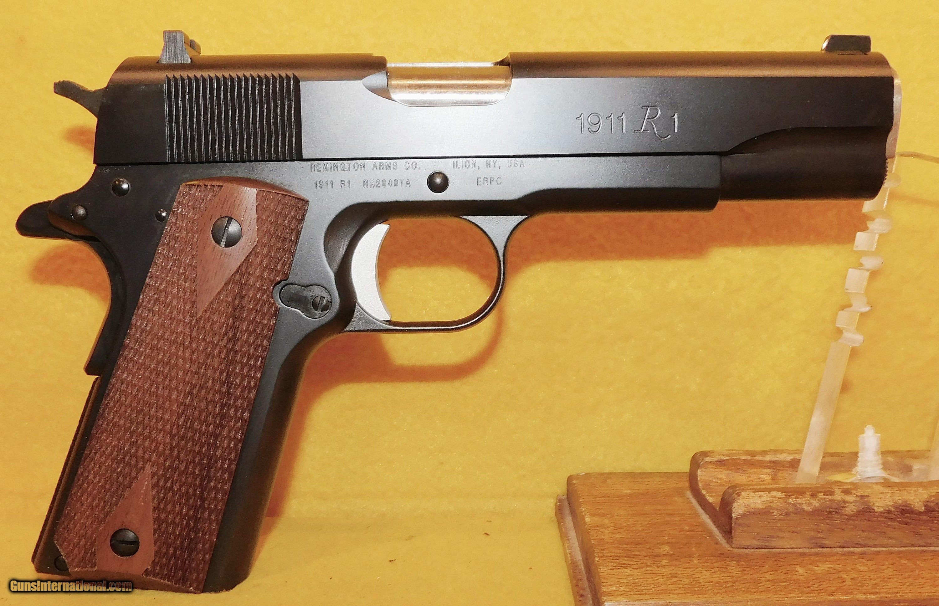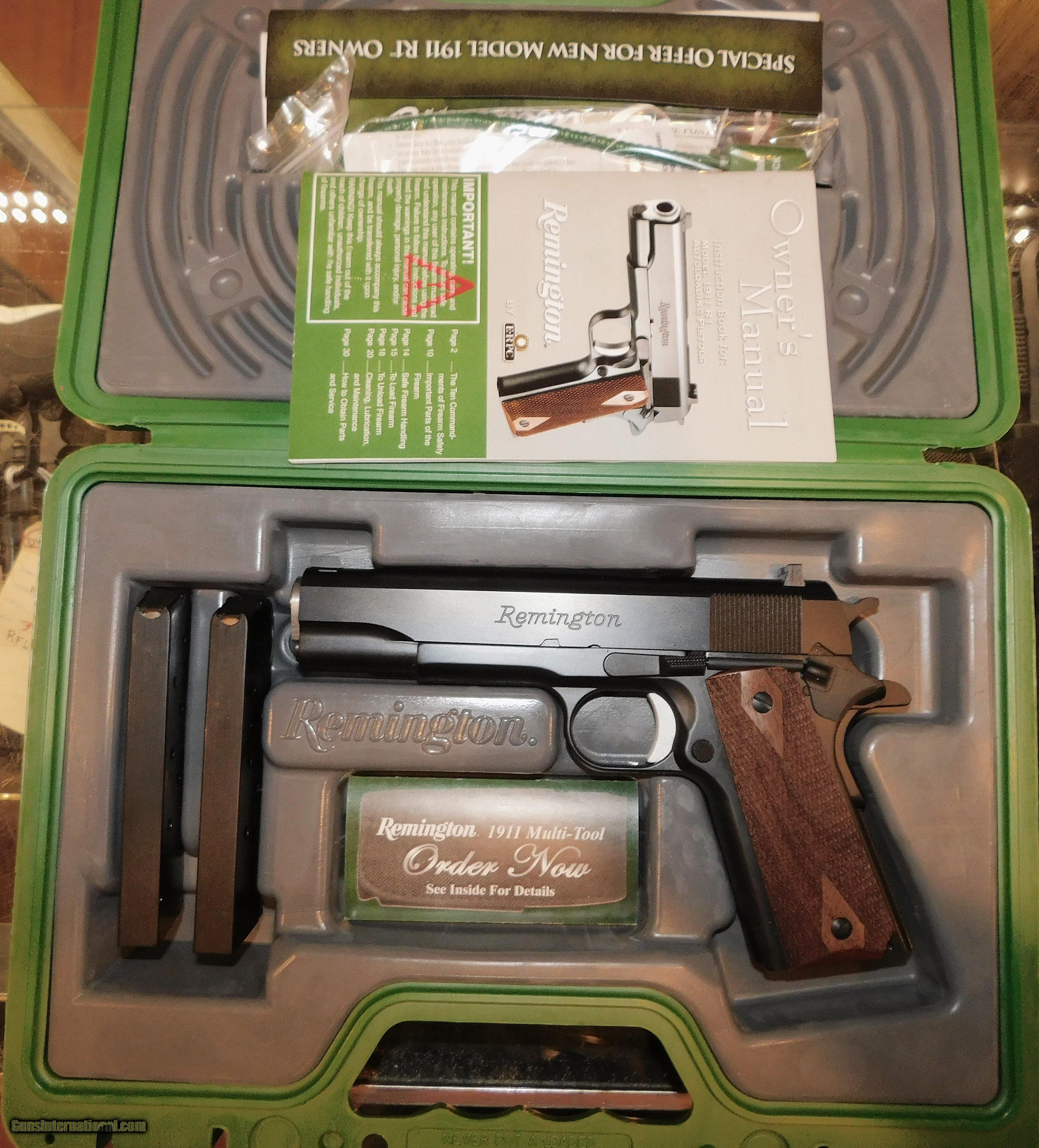 Description: REMINGTON 1911 R1 IN .45 ACP CAL., WITH 5" BARREL. COLOR BLACK. CONDITION NEW IN BOX. SERIAL NUMBER RH20407A. REMINGTON MODEL 1911 R1 (FIRST GEN.) IN .45 ACP CALIBER, NEW IN BOX UNFIRED, COMES WITH GREEN HARD CASE WITH PAPERS, TWO FACTORY MAGAZINES, NEW IN BOX OVERALL CONDITION, OUR STOCK # D6667 SOLD |