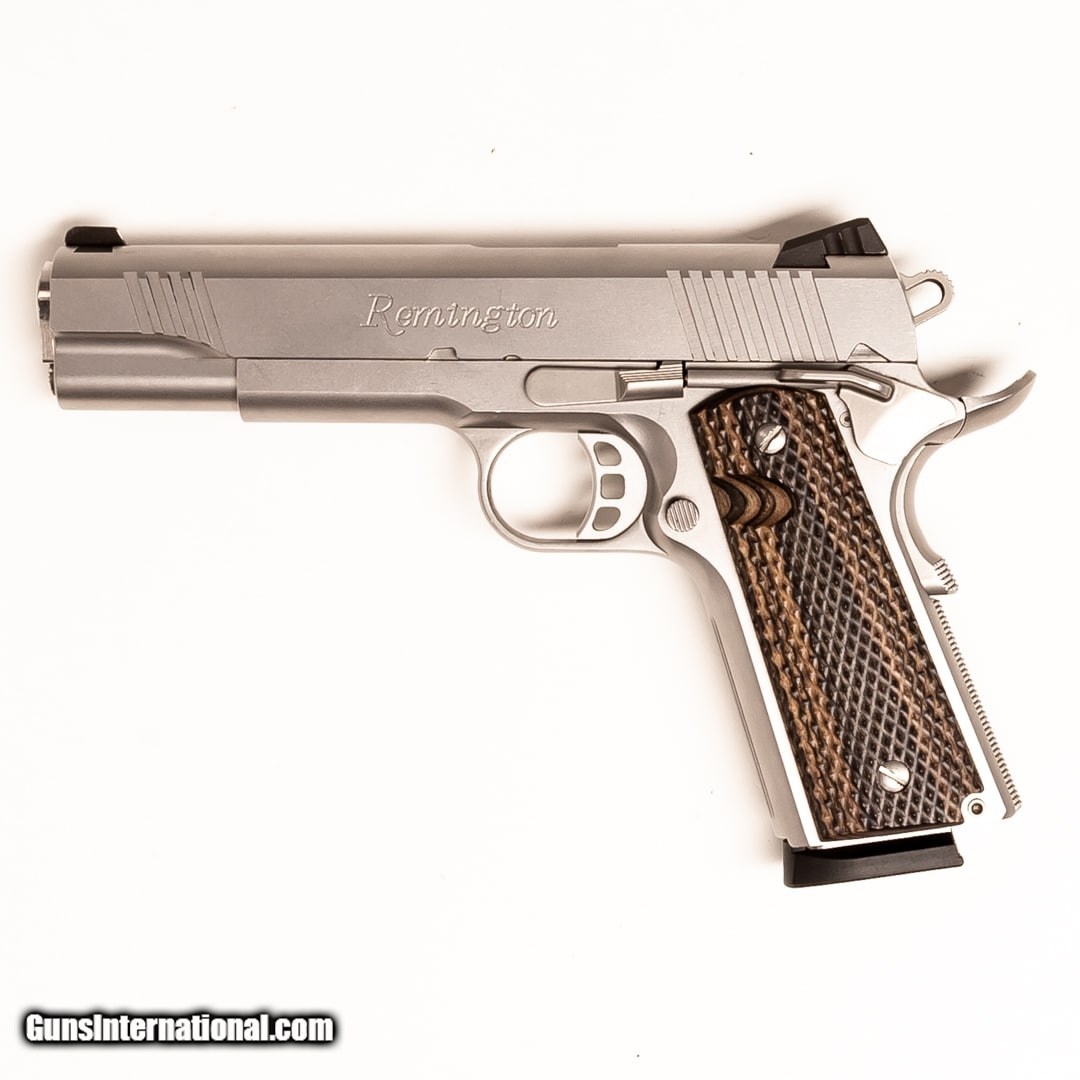 Description: Guns Listing ID: 619955 All the features of the 1911 R1, but with the enhanced durability and visual appeal of a stainless steel finish. Features two-dot dovetailed rear sight with single-dot front sight, G.I. thumb safety, grip safety and hammer. The Remington R1S is a stainless steel 1911 that features a match grade 5\" barrel and bushing, G.I. style safety, slide serrations, and other enhancements that bring this classic into the 21st century. If you‚‚re looking for a rugged handgun that is built to last as well as perform, this Remington R1S is a top tier pick. This handgun features two 10-round magazines, night sights, and the orignal grips SOLD Manufacturer: REMINGTON Model: 1911 R1S ENHANCED Caliber Info: .45 ACP Condition: Used - Certified Barrels: 5 BARREL Finish: STAINLESS |