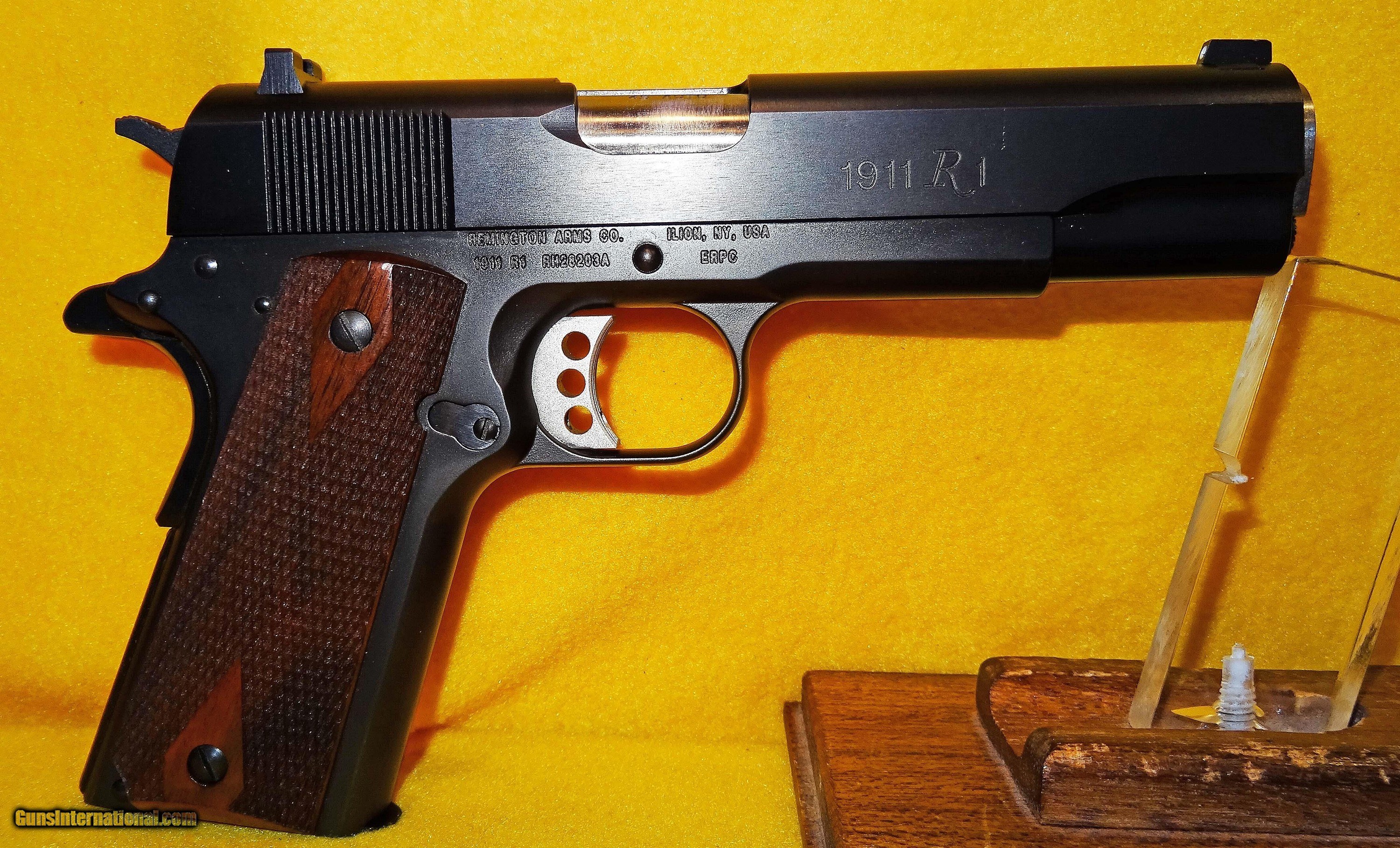 Description: REMINGTON 1911R1 IN .45 ACP CAL., WITH 5" BARREL. COLOR BLACK. CONDITION 98% LIKE NEW. SERIAL NUMBER AH28203A. REMINGTON MODEL 1911A1, MIRROR BORE, DIAMOND WALNUT GRIPS EXCELLENT, COMES WITH SPARE FACTORY MAGAZINE, HARD CASE, PAPERS, 98% LIKE NEW OVERALL CONDITION, OUR STOCK # D1263. SOLD |
