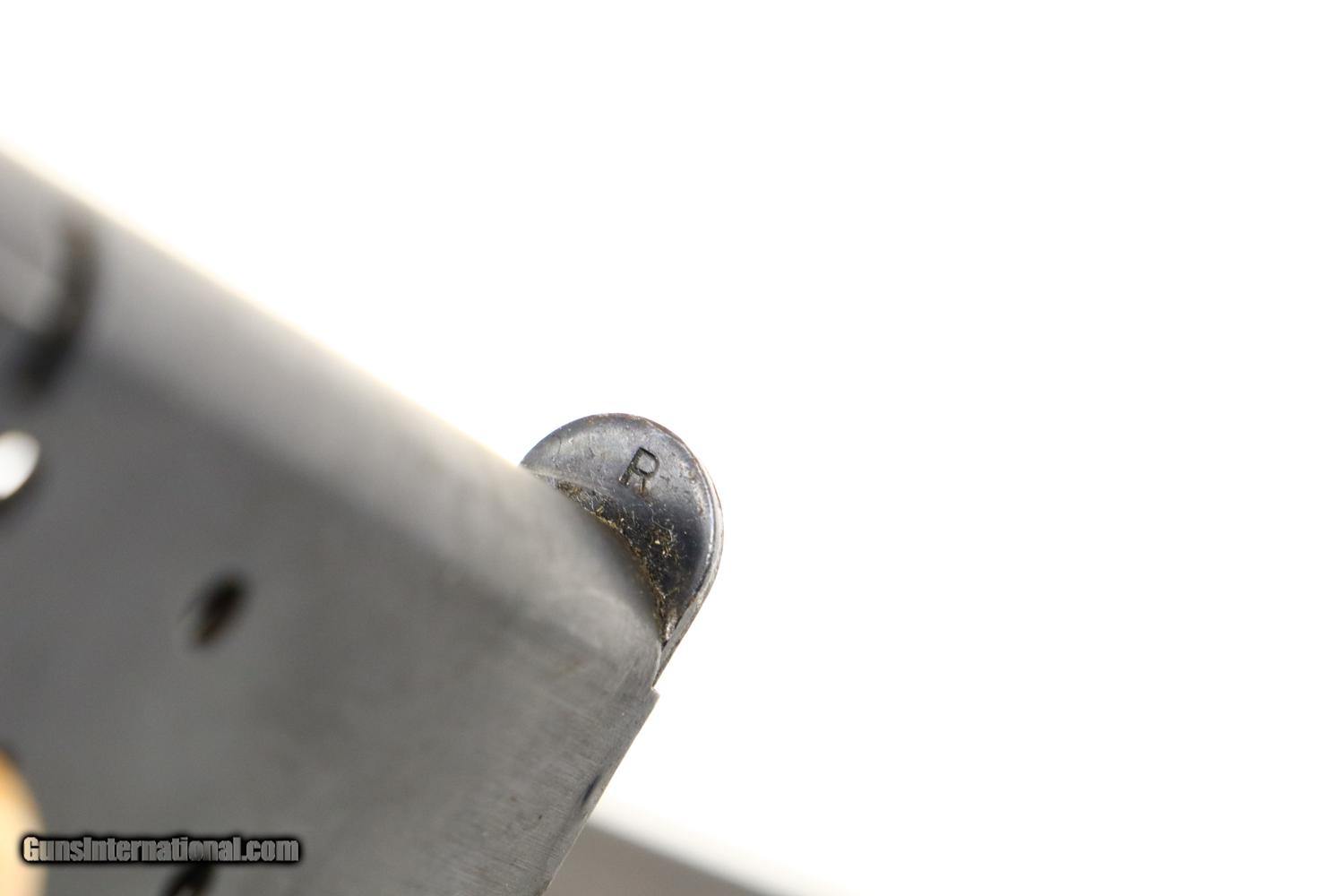 Description: Synopsis: Remington Rand 1911A1 in .45 ACP, a classic WWII sidearm! Description: Standard configuration Remington Rand M1911A1 with ramp front sight and drift adjustable rear sight having square notch. Left side of frame with usual two line Remington Rand address; 'P' in front of rear sight. Left frame with 'FJA' inspector initials. Right side of frame marked 'UNITED STATES PROPERTY', 'M1911A1 U.S.ARMY', 'NO 2045806'. All components parkerized. Barrel lug marked âFâ on right side by Flannery Bolt Co. and 'P' on the left. Keyes Fibre grips with escutcheon rings around screws. Late seven round magazine with "R" on inner toe. Condition: Excellent condition with just the most minimal wear as one might expect from a minimally carried service pistol. Usual wear over barrel hood from cylcing. Comparable condition grips and near excellent magazine. Near mirror bore. Perfect manual mechanics. A wonderful Remington Rand 1911A1, made 1944, well suited to any Military collection. ~~Insured shipping fee of $65; most packages shipped using FedEx 2nd Day.~~ SOLD Curio/Relic: Yes Manufacturer: Remington Rand Serial Number: 2045806 Caliber Info: .45 ACP |