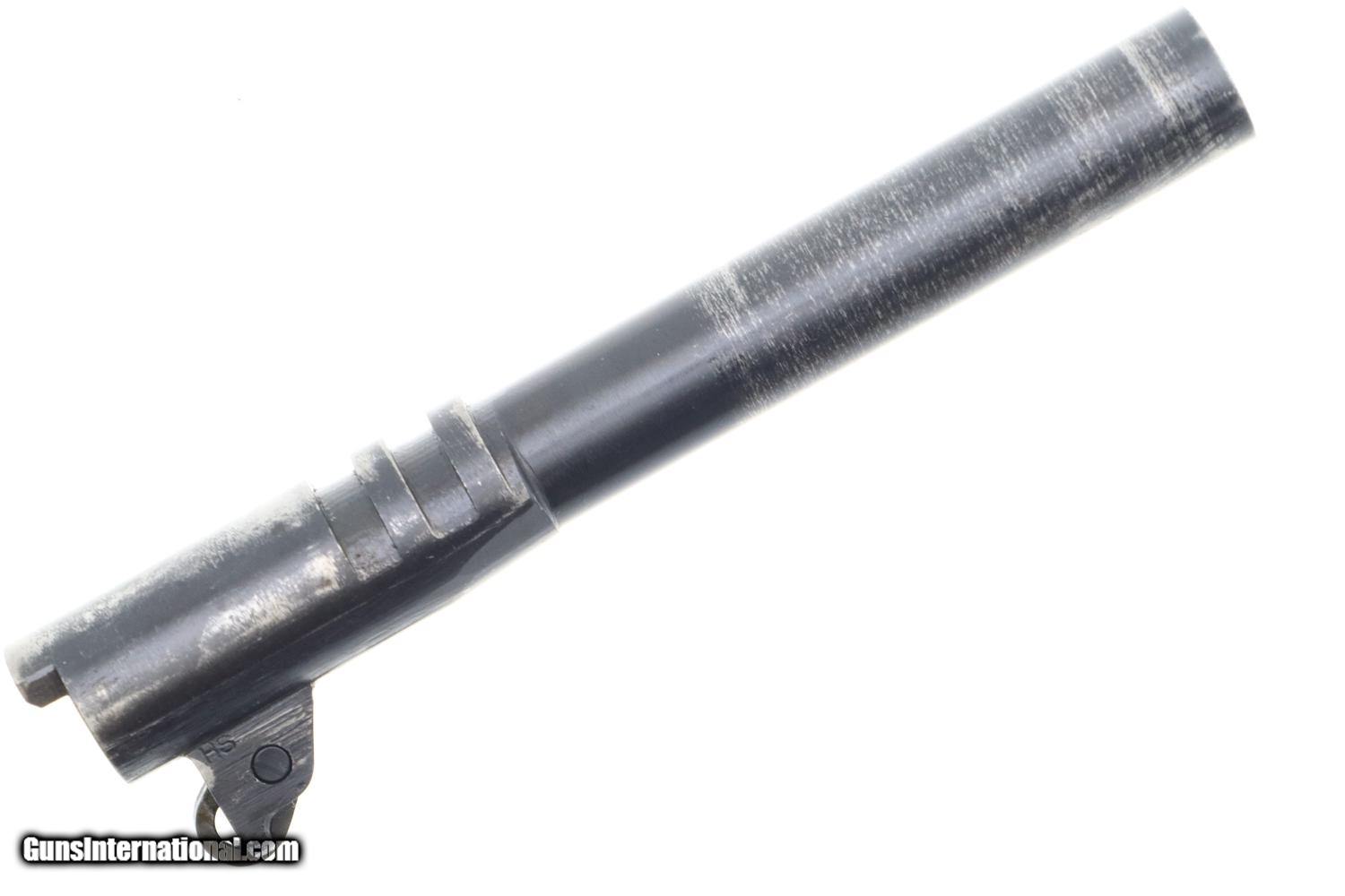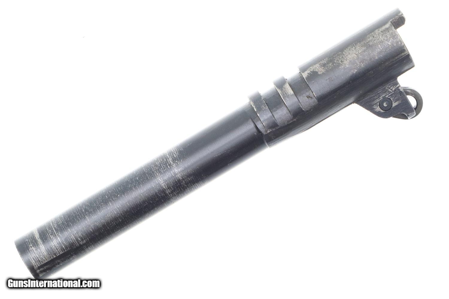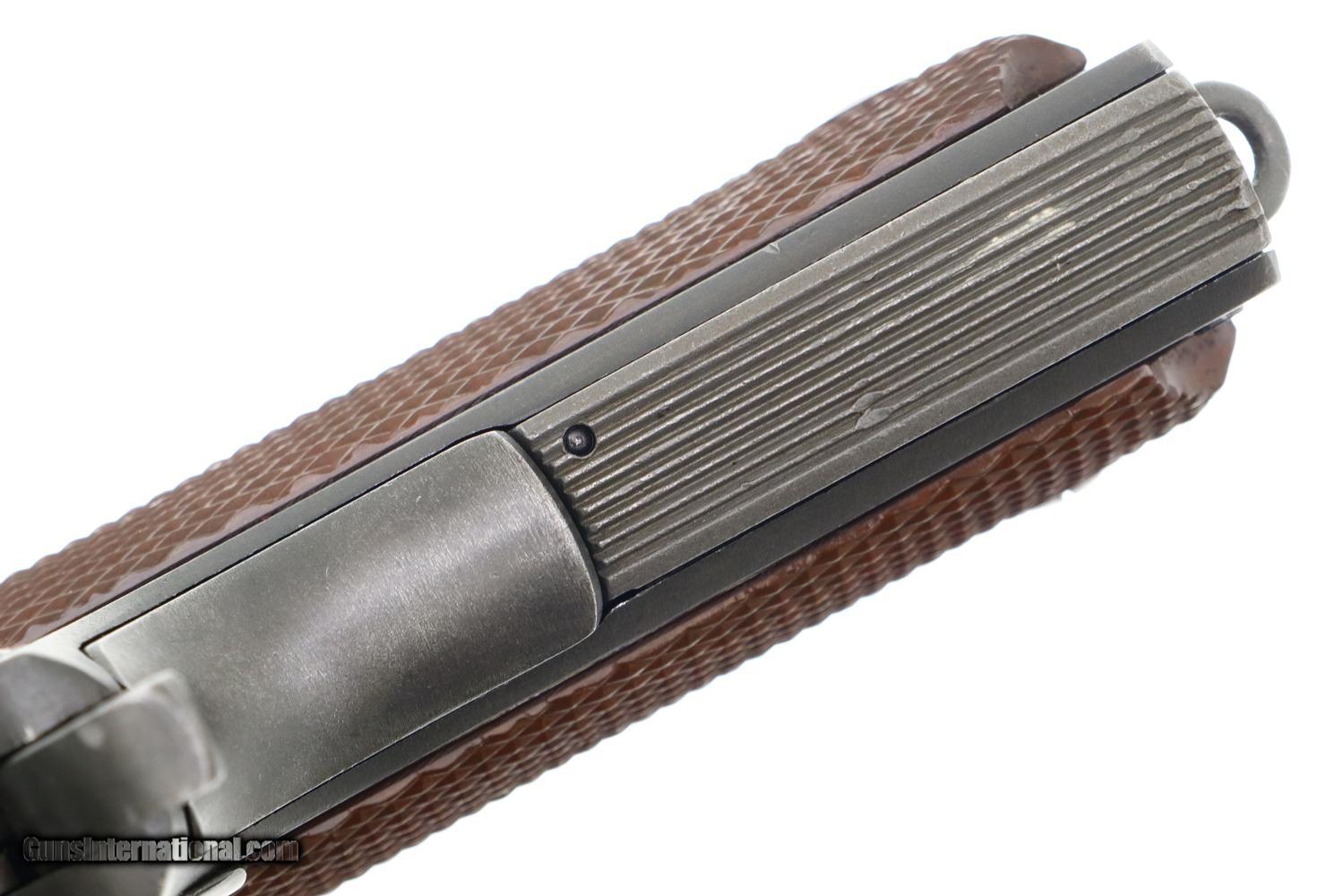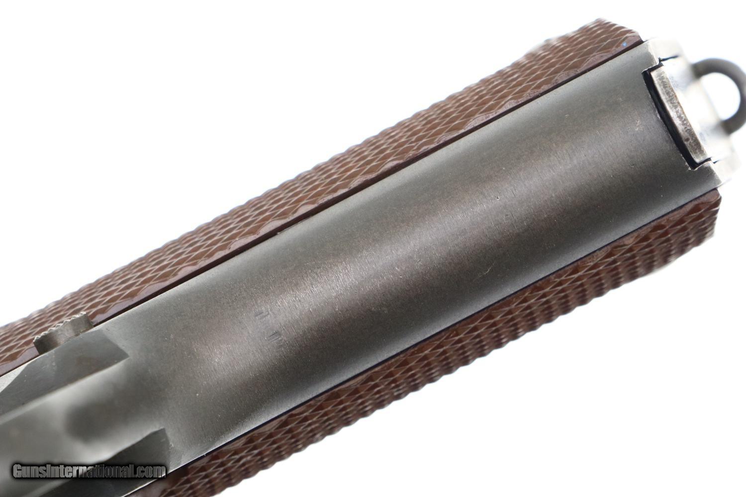 Description: Synopsis: Excellent Late War Remington Rand 1911A1 as issued to U.S. military in 1943. Description: Standard configuration Remington Rand M1911A1 with ramp front sight and drift adjustable rear sight having square notch. Left side of frame with usual two line Remington Rand address. “P” in front of rear sight. “FJA” Frank J Atwood inspector initials on left side & crossed cannons proofs on right side that do not break the parkerized finish. Right side of frame marked with SN, “UNITED STATES PROPERTY”, “M1911A1 U.S.ARMY”. All components parkerized except for salt blue trigger, slide release, thumb safety, hammer, and a few pins. Barrel lug marked “HS” on right side by High Standard, ‘P’ on opposing side. Keyes Fibre grips with escutcheon rings around screws. Late seven round magazine with “S” on inner toe. Condition: EXC condition, a questionable rework, as none of the inspector markings have broken the finish. Usual thinning over barrel hood from cycling. Comparable condition grips and magazine. Bright bore with minor etching. Perfect manual mechanics. An extremely attractive Remington Rand 1911A1, made 1943, with just enough wear to make the occasional appearance at the range! SOLD Manufacturer: Remington Model: M1911A1 Serial Number: 1417983 Caliber Info: .45 ACP Condition: EXC |