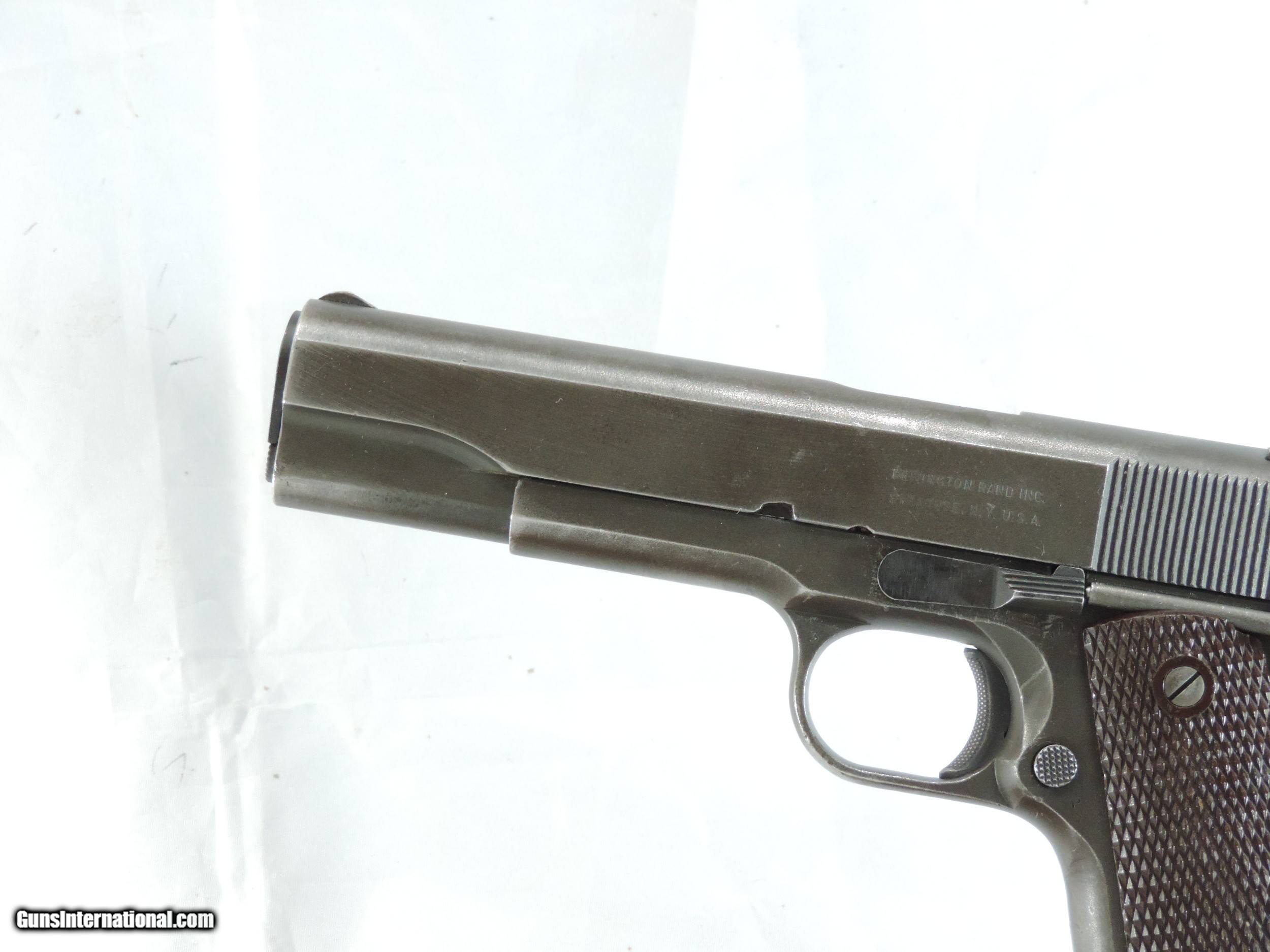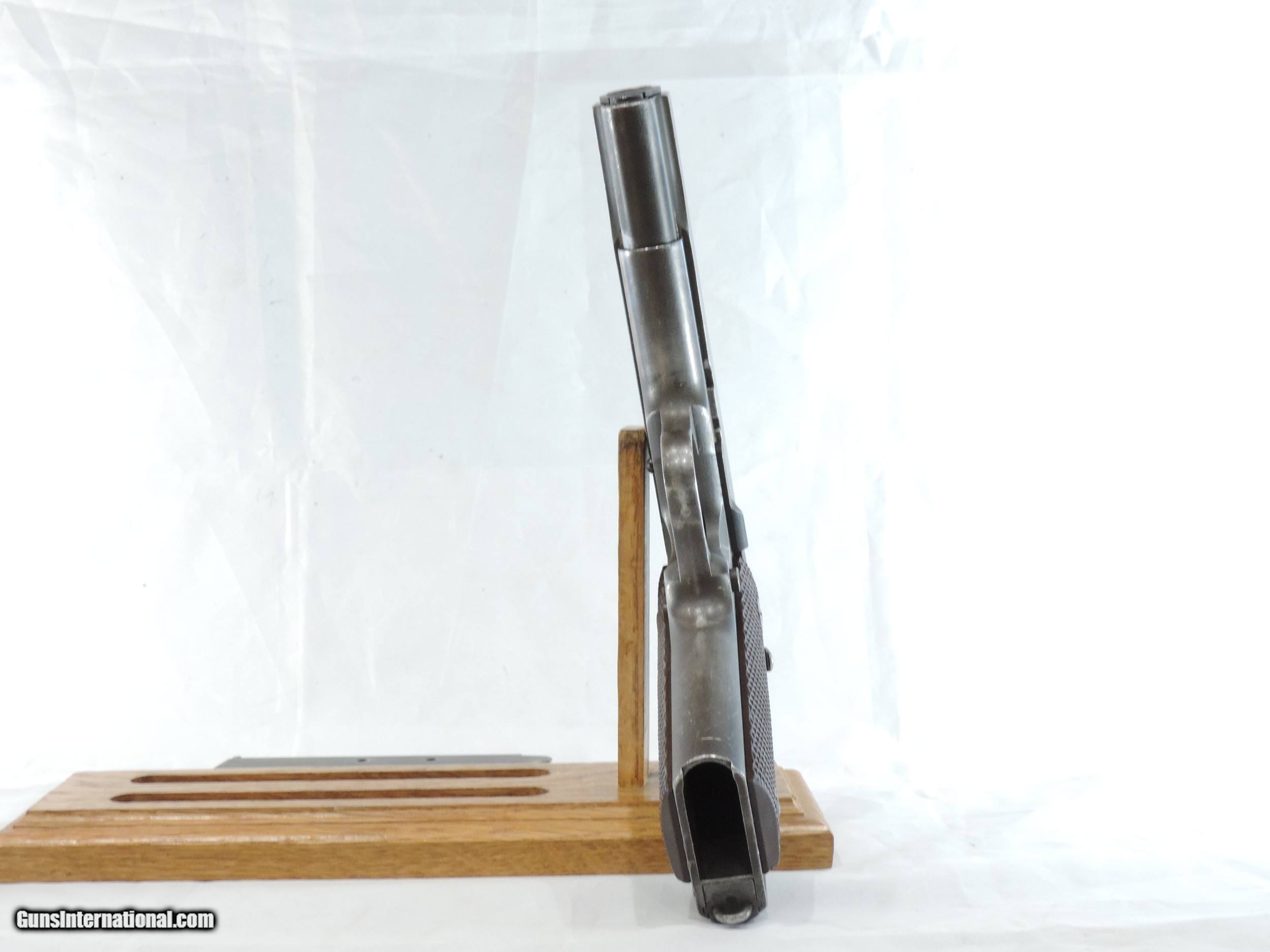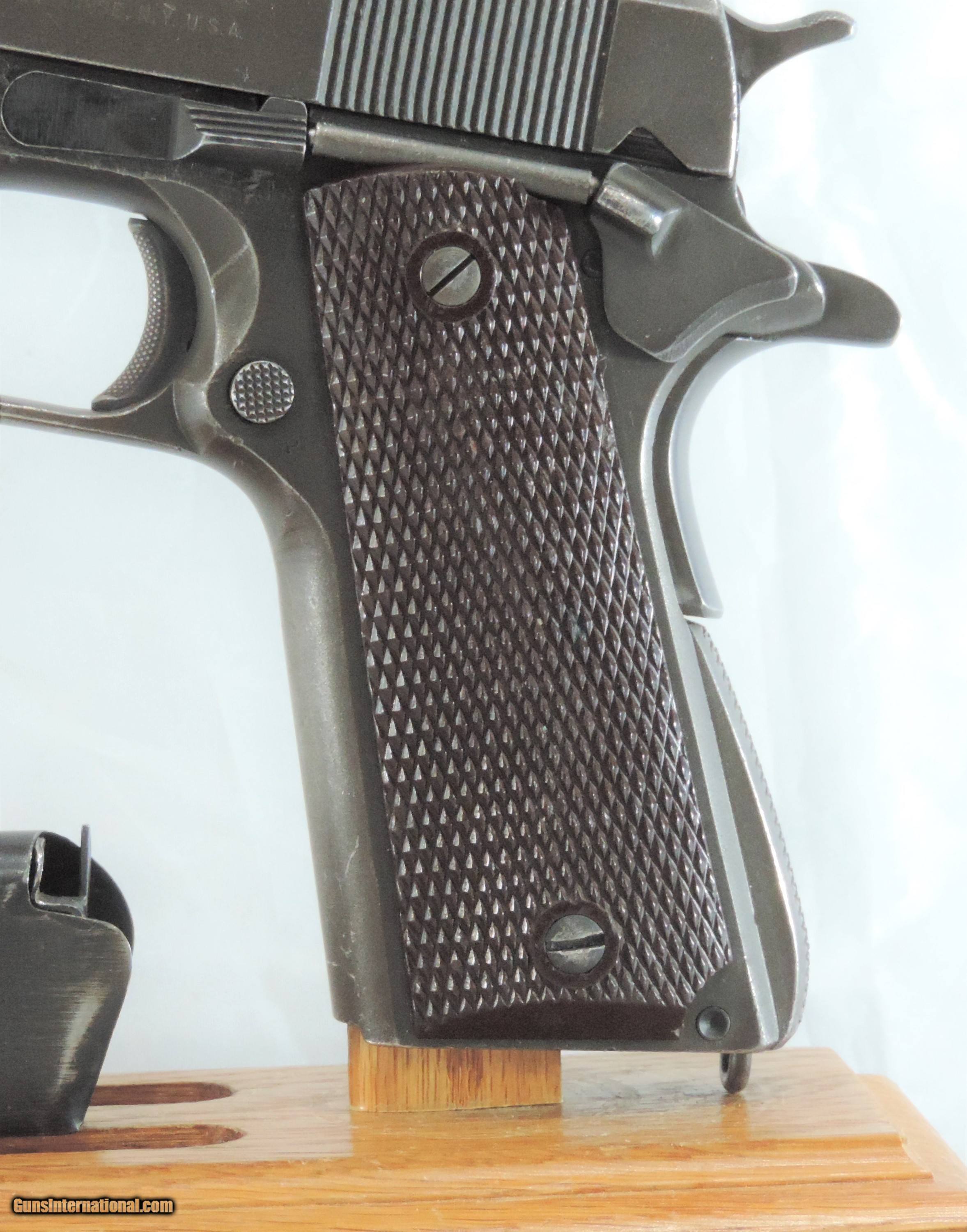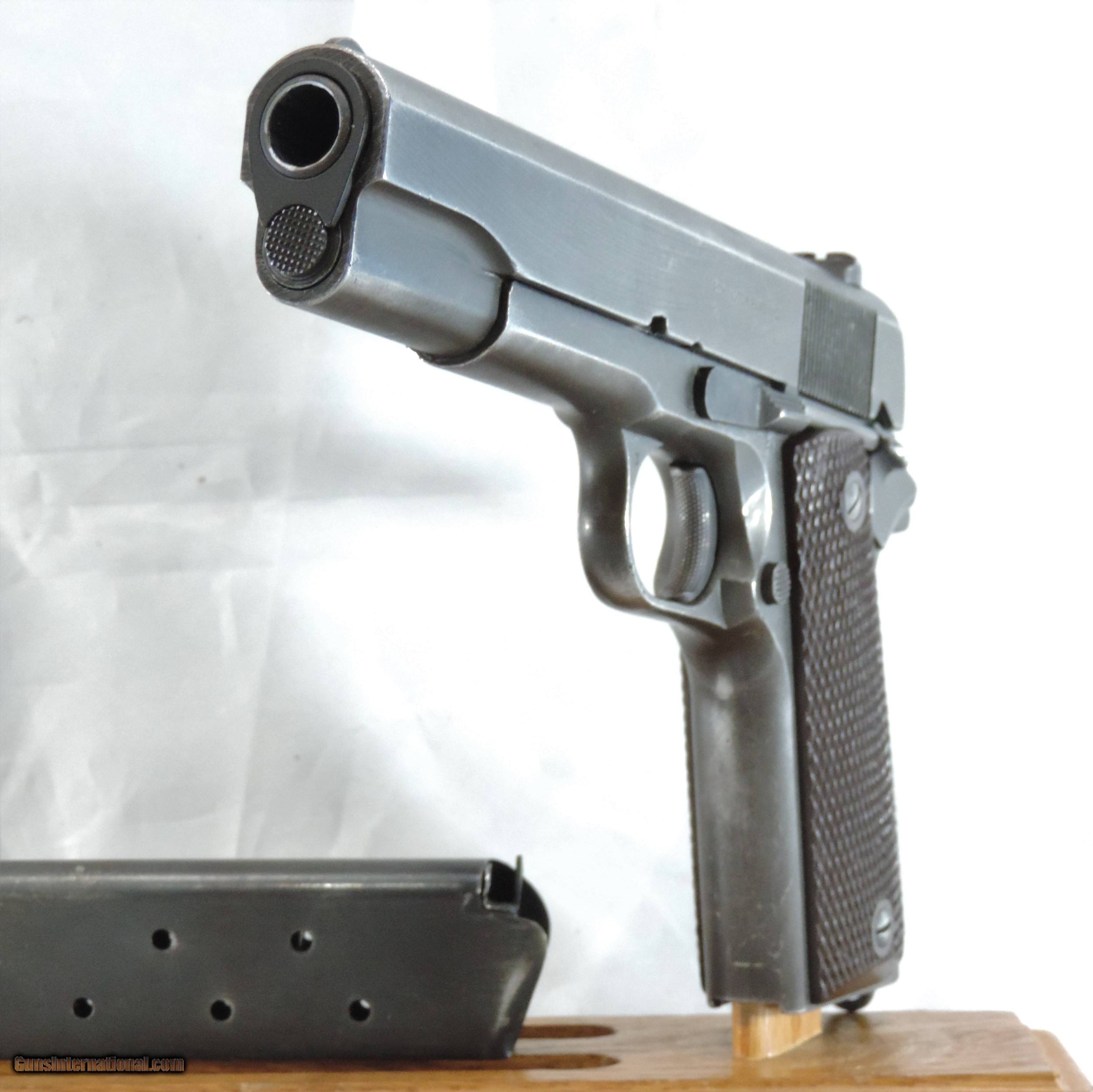 Description: INV. 8048 REMINGTON RAND U.S. 1911 A1, .45ACP. SER. 2002953. THIS AMERICAN ICON HAS REETAINED ABOUT 65-70%AND THAT IS DUE TO FADING, HOLSTER WEAR AND SOME MILD GRAYING OF THE GRIPSTRAPS. THERE IS NO RUST ANYWHERE. THE TOP OF THE SLIDE AND THE OF THE FRAME HAVE A "P" STAMP THE FRAME ALSO HAS THE INSPECTOR'S "FJA". THE RIGHT SIDE IS LIGHTLY STAMPED "SA". ALL PARTS ARE PROPER. THE LARGE RING GRIPS AND GRIP SCREWS ARE PERFECT. THE SLIDE RAILS, BOLT FACE AND FEED RAMP SHOW LITTLE USE. THE SPRINGFIELD BARREL IS MIRROR BRIGHT WITH RAZOR SHARP RIFLING AND JUST A TOUCH OF FROST. IT COMES WITH A CORRECT MAG. IF YOU EVER WANTED ONE THESE MILITARY ICONS AND DIDN'T WANT TO SELL THE FARM HERE'S A GREAT DEAL FOR YOU. ONLY....SHIPPED.....$1945*** .***WITH A "PURCHASE SATISFACTION GUARANTEE". To purchase this firearm or if you want to request more information contact us at: Email ckguns[at]ymail[dot]com Phone 201-512-0002 Cell 201-575-6838 FAX 201-215-4759 We accept most major credit cards. Prices shown are Discounted 3% for Cash or Check. The buyer must be familiar with all the laws governing the purchase and the ownership of firearms in their own city and state. The Yankee Armorer, Inc is not responsible for any failure to comply with or observe these laws. The Yankee Armorer, Inc will only ship after full payment and receipt of all required documents. Shipping: Add $35.00 for handguns, $45.00 for long guns. New Jersey buyers are subject to a 7% sales tax. The Yankee Armorer, Inc offers a 3 day inspection period with full refund upon return of intact firearm and in the original condition. The Yankee Armorer, Inc offers a no interest lay away program - 25% down; 25% in 30 days; 25% in 60 days; and full payment in 90 days. Any violation of this policy is subject to restocking and forfeiture of all payments. Any variation from this policy must be agreed to in advance. Unshipped Cancelled sales are subject to a 20% restocking fee. Be advised that all firearms sold by The Yankee Armorer, Inc. or the Gun Exchange, LLC (SELLER) are sold as collector’s items. They have not been fired or tested for safety and must be examined by a license gunsmith prior to use. By purchasing any item from the (SELLER), you are agreeing to hold the (SELLER) free from any damages or lawsuits of any nature. Any item left for transfer or storage will be charged to $25.00 per month, per item from the day of its receipt. Any variation from this policy must be agreed to in advance. Store hours 10:00 am to 5:00 pm Tuesday -Saturday. It's always best to call for appointment. Store 201-512-0002, cell 201-575-6838. SOLD Handgun Caliber: .45 ACP (.45 Auto) |