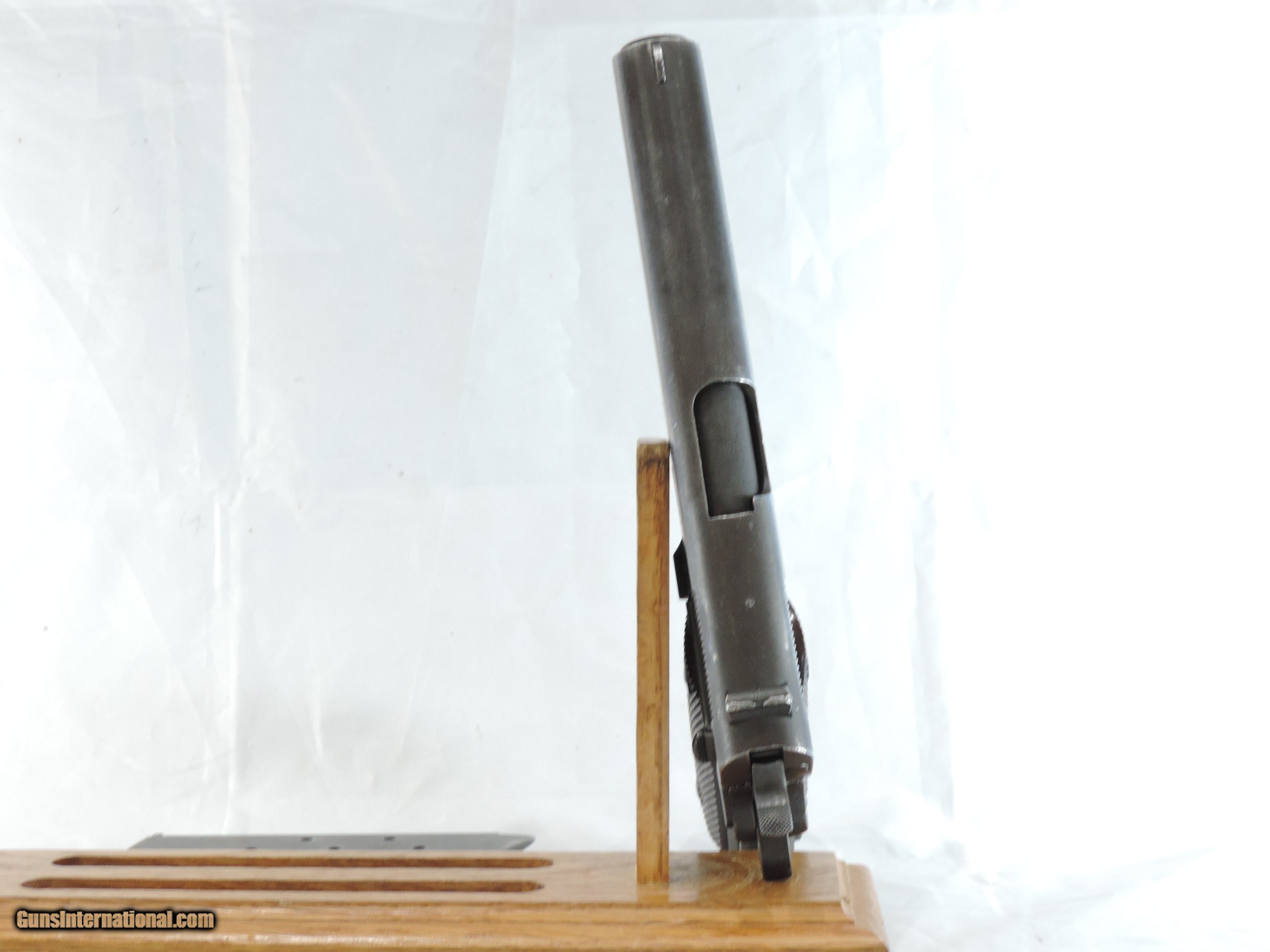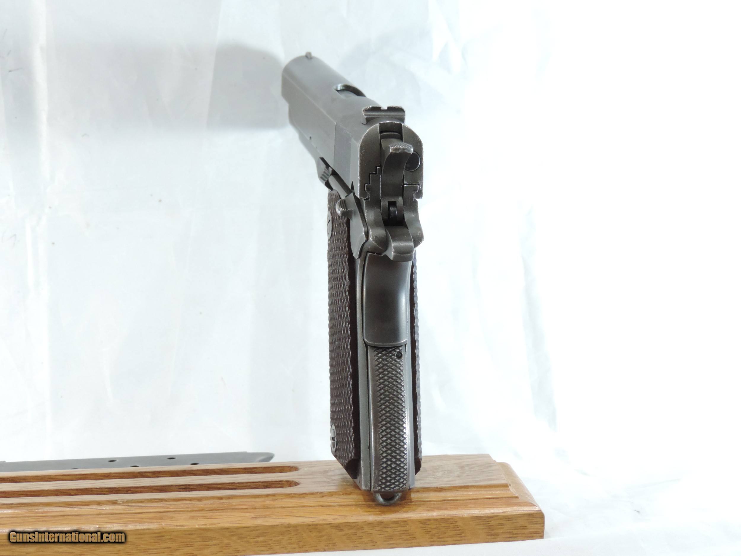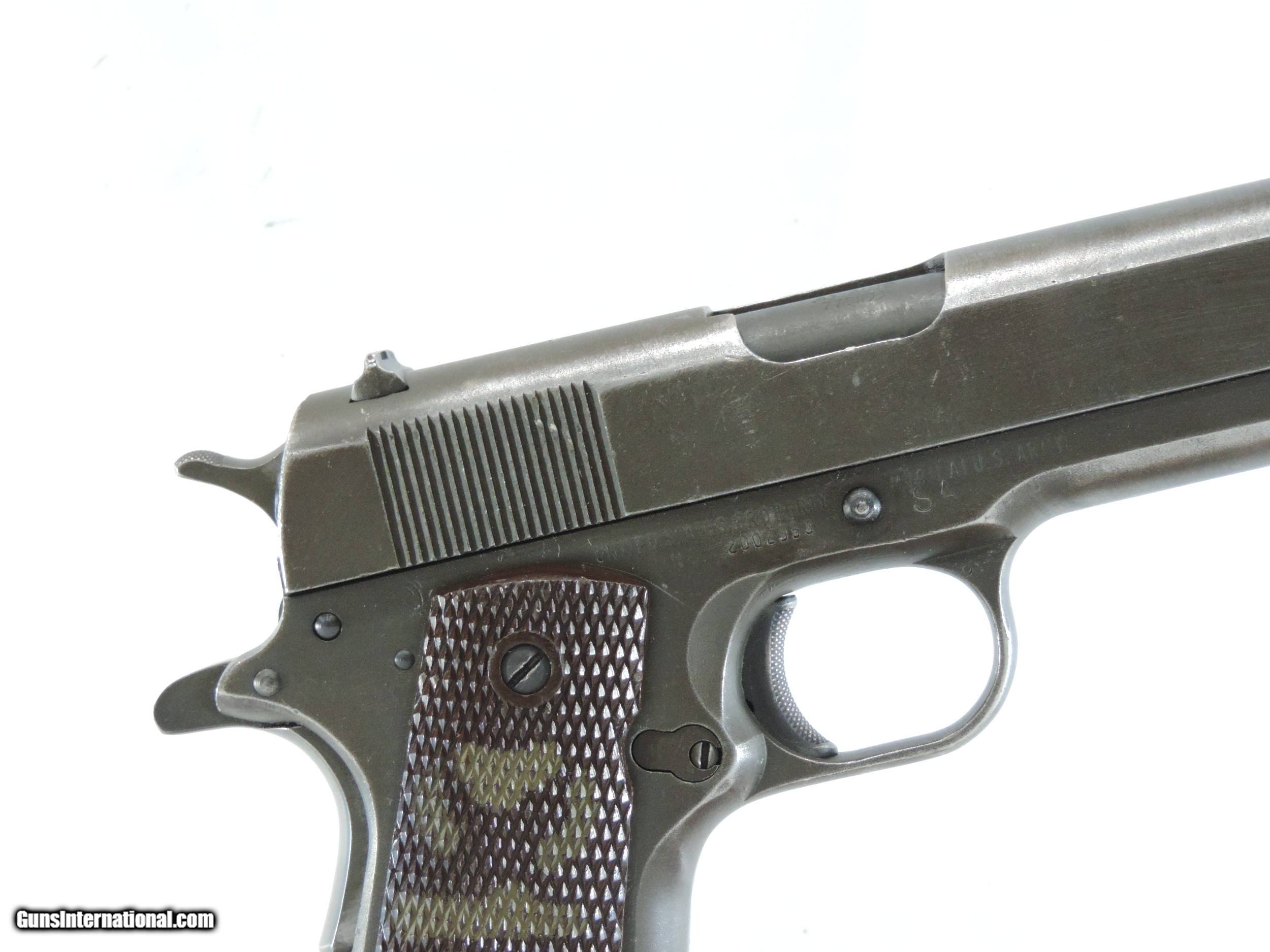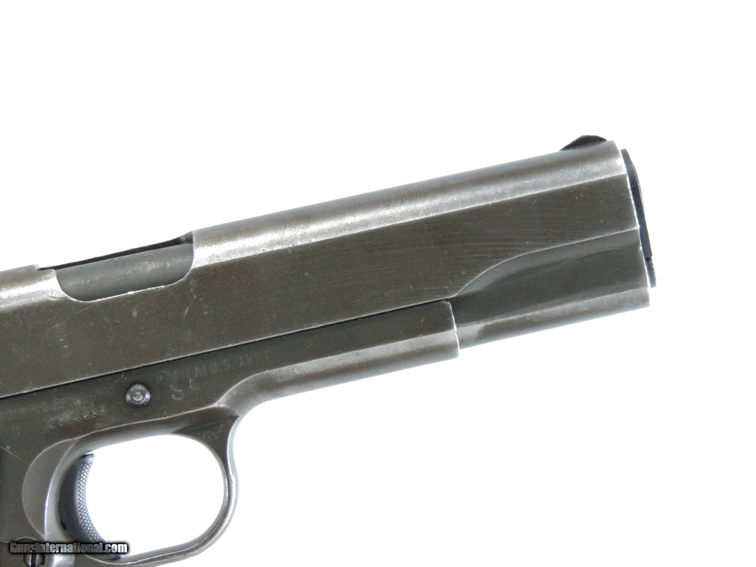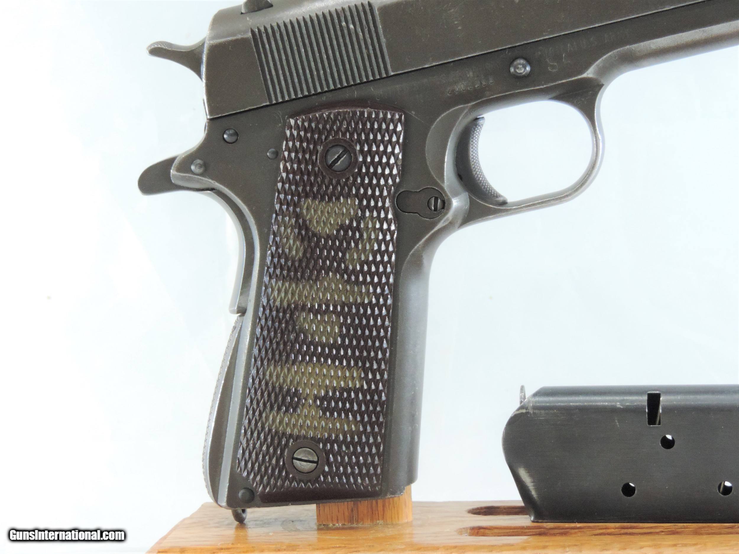 Description: INV. 8048 REMINGTON RAND U.S. 1911 A1, .45ACP. SER. 2002953. THIS AMERICAN ICON HAS REETAINED ABOUT 65-70%AND THAT IS DUE TO FADING, HOLSTER WEAR AND SOME MILD GRAYING OF THE GRIPSTRAPS. THERE IS NO RUST ANYWHERE. THE TOP OF THE SLIDE AND THE OF THE FRAME HAVE A "P" STAMP THE FRAME ALSO HAS THE INSPECTOR'S "FJA". THE RIGHT SIDE IS LIGHTLY STAMPED "SA". ALL PARTS ARE PROPER. THE LARGE RING GRIPS AND GRIP SCREWS ARE PERFECT. THE SLIDE RAILS, BOLT FACE AND FEED RAMP SHOW LITTLE USE. THE SPRINGFIELD BARREL IS MIRROR BRIGHT WITH RAZOR SHARP RIFLING AND JUST A TOUCH OF FROST. IT COMES WITH A CORRECT MAG. IF YOU EVER WANTED ONE THESE MILITARY ICONS AND DIDN'T WANT TO SELL THE FARM HERE'S A GREAT DEAL FOR YOU. ONLY....SHIPPED.....$1945*** .***WITH A "PURCHASE SATISFACTION GUARANTEE". To purchase this firearm or if you want to request more information contact us at: Email ckguns[at]ymail[dot]com Phone 201-512-0002 Cell 201-575-6838 FAX 201-215-4759 We accept most major credit cards. Prices shown are Discounted 3% for Cash or Check. The buyer must be familiar with all the laws governing the purchase and the ownership of firearms in their own city and state. The Yankee Armorer, Inc is not responsible for any failure to comply with or observe these laws. The Yankee Armorer, Inc will only ship after full payment and receipt of all required documents. Shipping: Add $35.00 for handguns, $45.00 for long guns. New Jersey buyers are subject to a 7% sales tax. The Yankee Armorer, Inc offers a 3 day inspection period with full refund upon return of intact firearm and in the original condition. The Yankee Armorer, Inc offers a no interest lay away program - 25% down; 25% in 30 days; 25% in 60 days; and full payment in 90 days. Any violation of this policy is subject to restocking and forfeiture of all payments. Any variation from this policy must be agreed to in advance. Unshipped Cancelled sales are subject to a 20% restocking fee. Be advised that all firearms sold by The Yankee Armorer, Inc. or the Gun Exchange, LLC (SELLER) are sold as collector’s items. They have not been fired or tested for safety and must be examined by a license gunsmith prior to use. By purchasing any item from the (SELLER), you are agreeing to hold the (SELLER) free from any damages or lawsuits of any nature. Any item left for transfer or storage will be charged to $25.00 per month, per item from the day of its receipt. Any variation from this policy must be agreed to in advance. Store hours 10:00 am to 5:00 pm Tuesday -Saturday. It's always best to call for appointment. Store 201-512-0002, cell 201-575-6838. SOLD Handgun Caliber: .45 ACP (.45 Auto) |