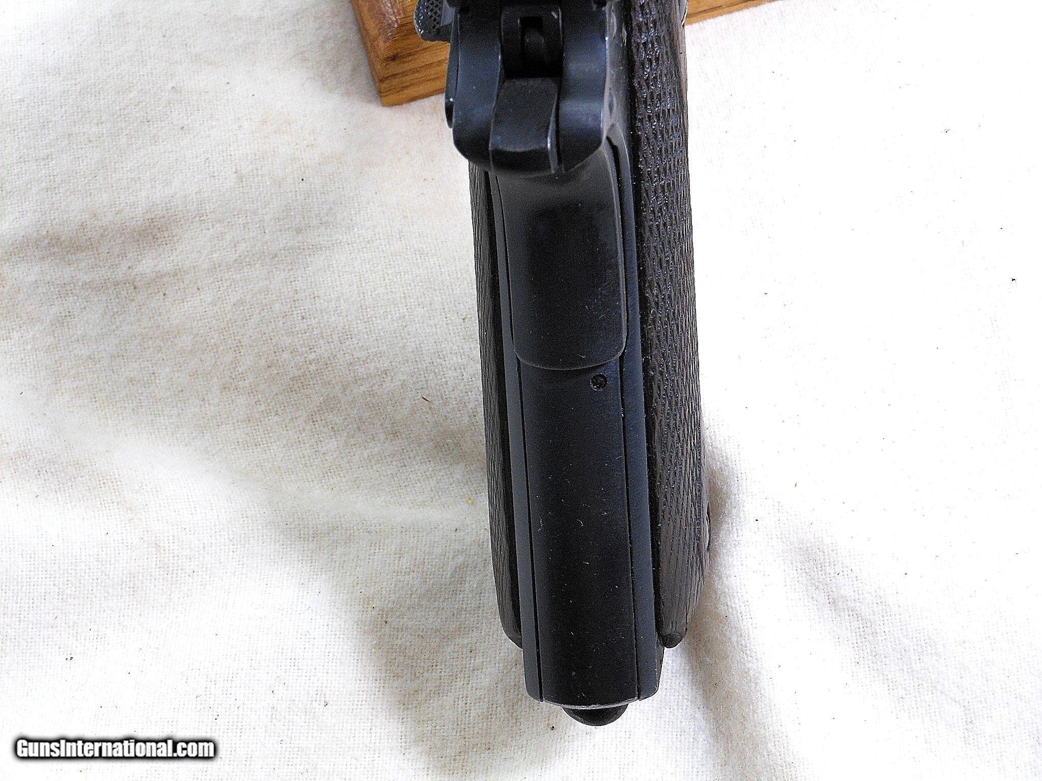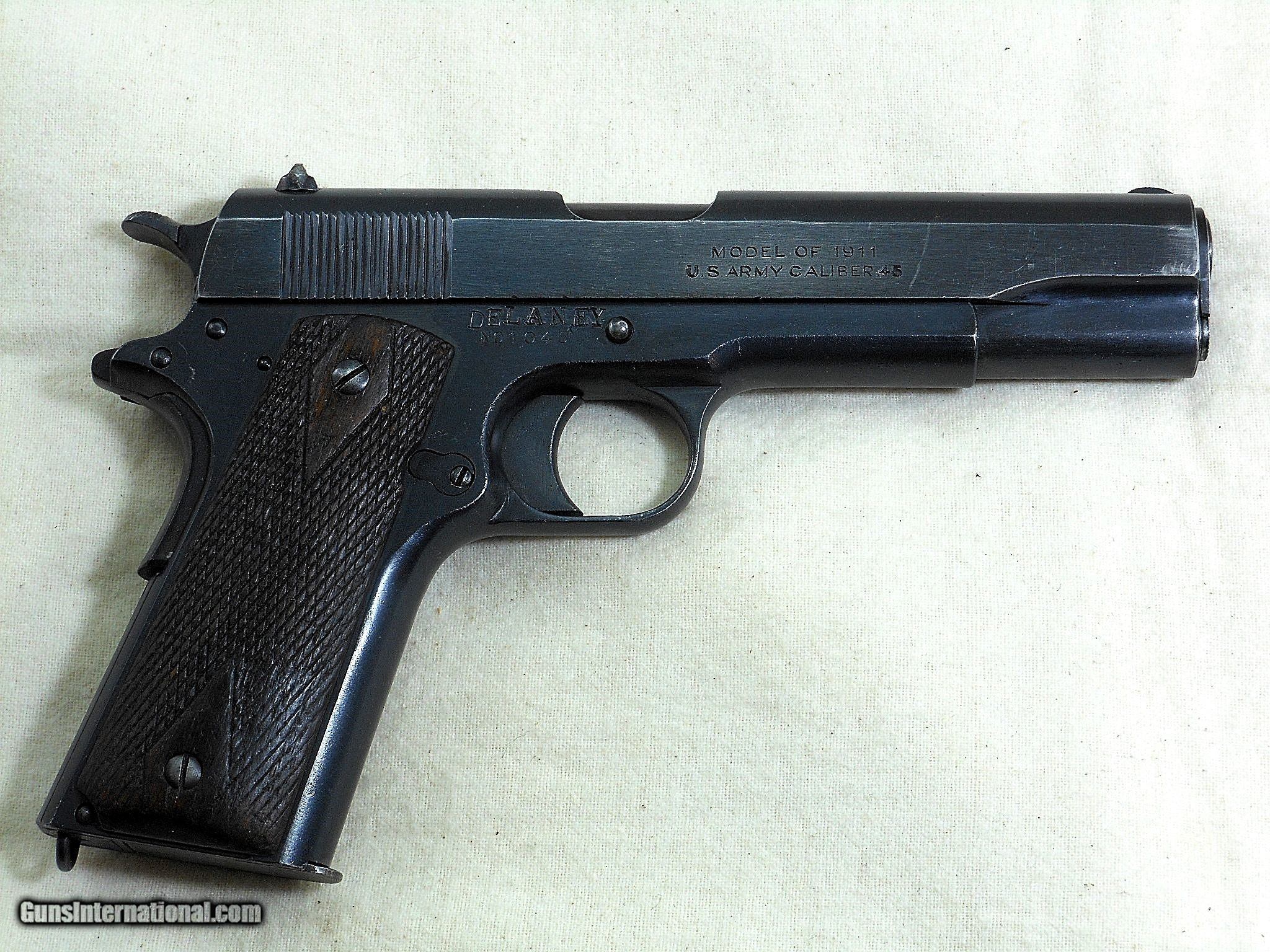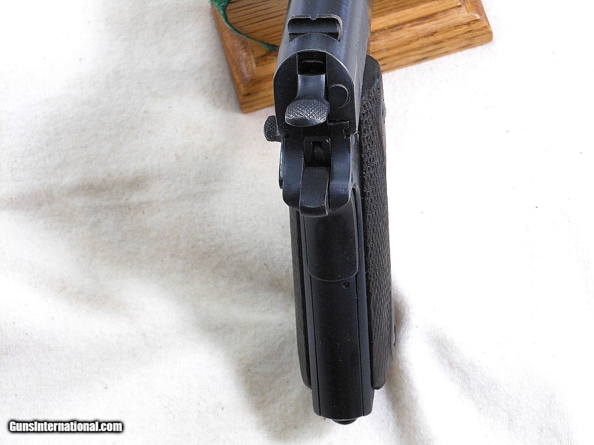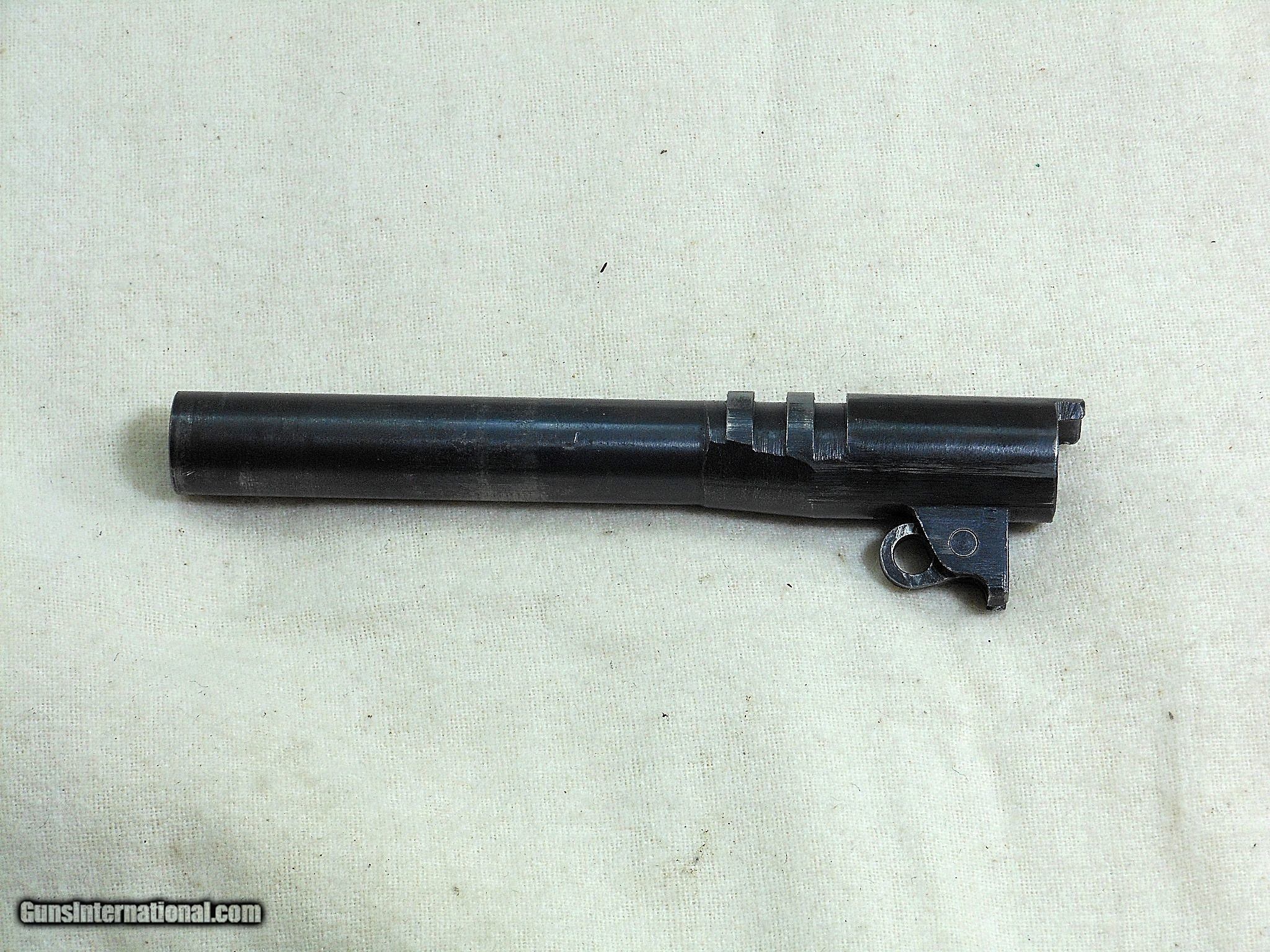 Description: This Remington UMC was produced in 1918. The pistol's serial number is 1045. This pistol is all Remington UMC in parts and condition. The frame has the correct inspectors initials of Major Edmond E. Chapman. The barrel is original to this pistol. The barrel is in good condition with sharp lands. There is frosting by the chamber throat that would not affect the pistol's accuracy. The slide has holster wear by the muzzle end. The weak bluing on the slide is about 96% overall. The barrel blue would rate a 92% overall condition due to the gun's cycling of the action. The frame bluing would rate a 95% overall condition. The area above the pistol's serial number has the veteran's name stamped on. The name is [Delaney]. The original grips are in lightly worn condition. This is a very nice condition early Remington UMC pistol! It has the right two tone magazine with this pistol. These Remington's are very difficult to find with the original parts intact today. Remington did not produce many of these model 1911's The total production of the model of 1911 was 21,676 pistols. They started production in April of 1918 and ended in 1919. The early production models are more difficult to find today. Search for hlvfineguns on google for more details. Curio&Relic AKKE (6) F. No. 500 -20 SOLD Curio/Relic: Yes Manufacturer: Remington - U.M.C. Co. Model: 1911 Serial Number: 1045 Barrel Length: 5 inches Caliber Info: 45 A.C.P. Condition: 93% Overall Metal Condition: Very Good Wood Condition: Good Condition Bore Condition: Good Condition Barrels: Rem-UMC Barrel Type: Military Action: Self Loading Finish: Blued Sights: Standard Manufacture Date: 1918 |