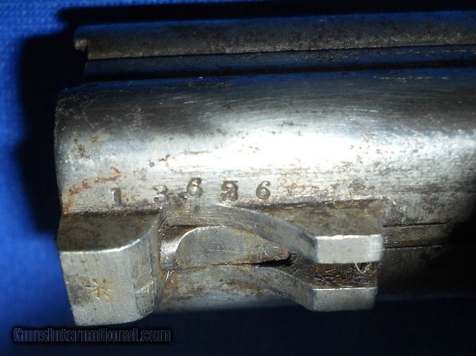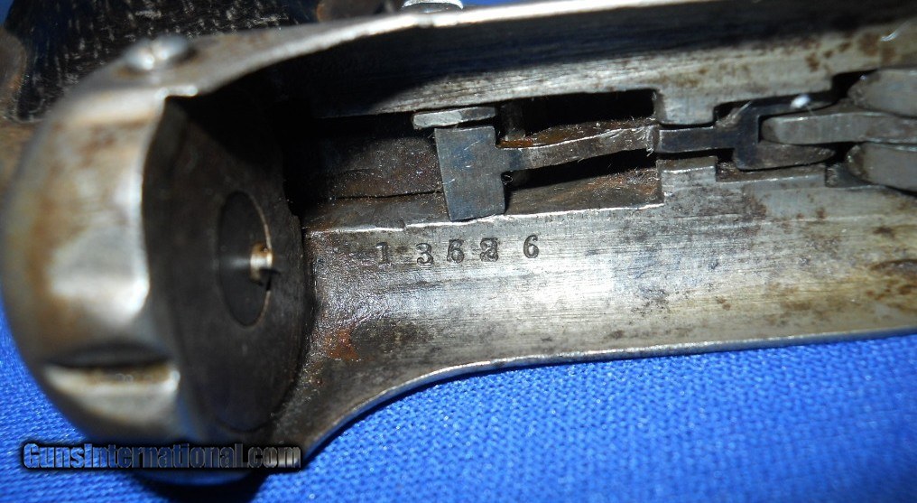 Description: ORIGINAL REMINGTON ELLIOT 4 SHOT .32 RF CALIBER PEPPERBOX DERRINGER. 3 3/8" BARREL CLUSTER, LIGHTLY FROSTED BORES WITH DISTINCT RIFLING. ORIGINAL WORN NICKLE FINISH BLENDING WITH PEWTER GRAY PATINA. VERY GOOD WORKING ORDER WITH PROPERLY ROTATING FIRING PIN. VERY GOOD EXAMPLE OVERALL, AS PICTURED. ALL MY LISTINGS ARE STILL AVAILABLE IF NOT PENDING SALE. CLICK ON "SEE ALL LISTINGS" SHIPS DIRECT TO BUYER ANYWHERE THAT'S OK ! $12.00 S&H PRIORITY INSURED. SOLD Antique: Yes Manufacturer: REMINGTON Model: REMINGTON - ELLIOT Serial Number: 13526 MATCHING NUMBERS Caliber Info: .32 RF Bore: GOOD Condition: ORIGINAL Metal Condition: AGED Wood Condition: VERY GOOD Bore Condition: VISIBLE RIFLING Barrels: 3 3/8 Action: CRISP |