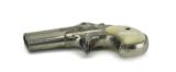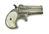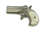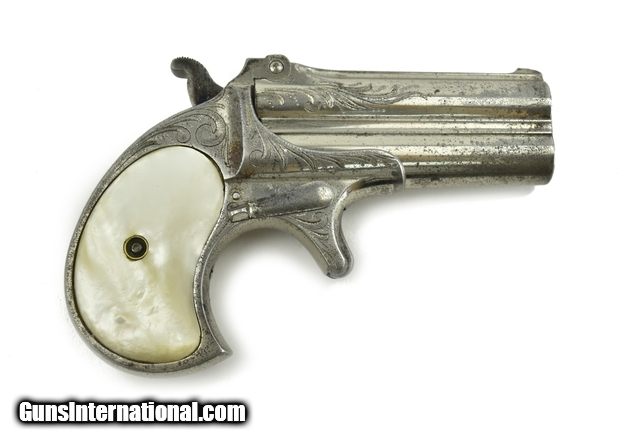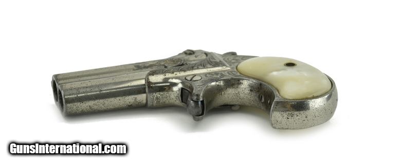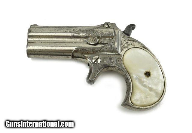 Cased Factory Engraved Remington Over/Under Derringer. Remington over/under excellent cased factory engraved derringer pistol. Beautiful factory engraved 3rd model derringer. Gun has 80% of original nickel finish. Excellent pearl grips. Fire blue still remains on the hammer in protected areas. Hinge is intact. Gun comes in a beautiful dealer case. The case is covered in leather has some light, nicely done embossing. There is one repair to the top part of the case near the muzzle done during the period of use. Absolutely gorgeous cased Derringer!
