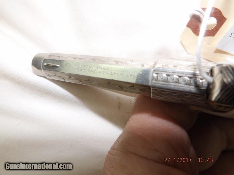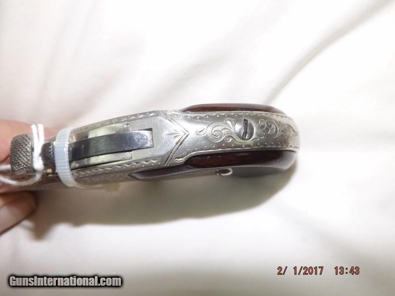 Description: This is a beautiful and unusual pistol. It is beautifully engraved and retains 98% of it's original nickel finish. It has a tube magazine under the barrel that holds the ammo. It feeds, chambers and ejects cartridges when you cock the hammer. The grips are a rosewood. The action works fine. Barrel is marked; "Remington & Sons llion NY Riders Pat Aug 15th 1871. SOLD Antique: Yes |