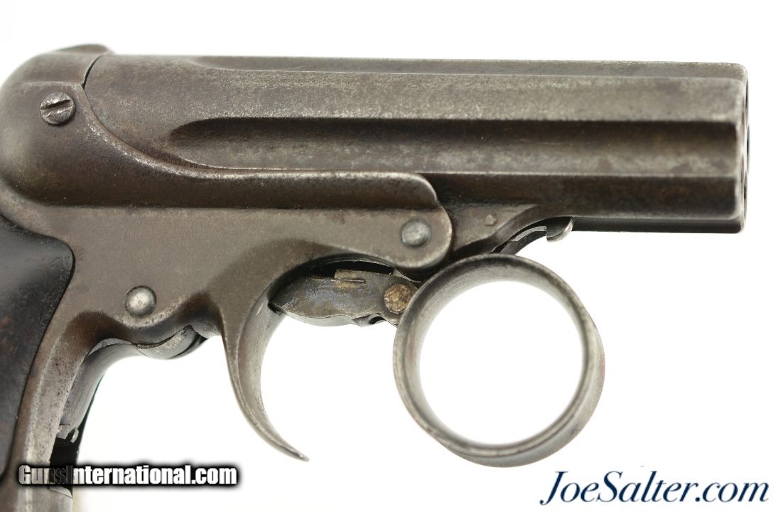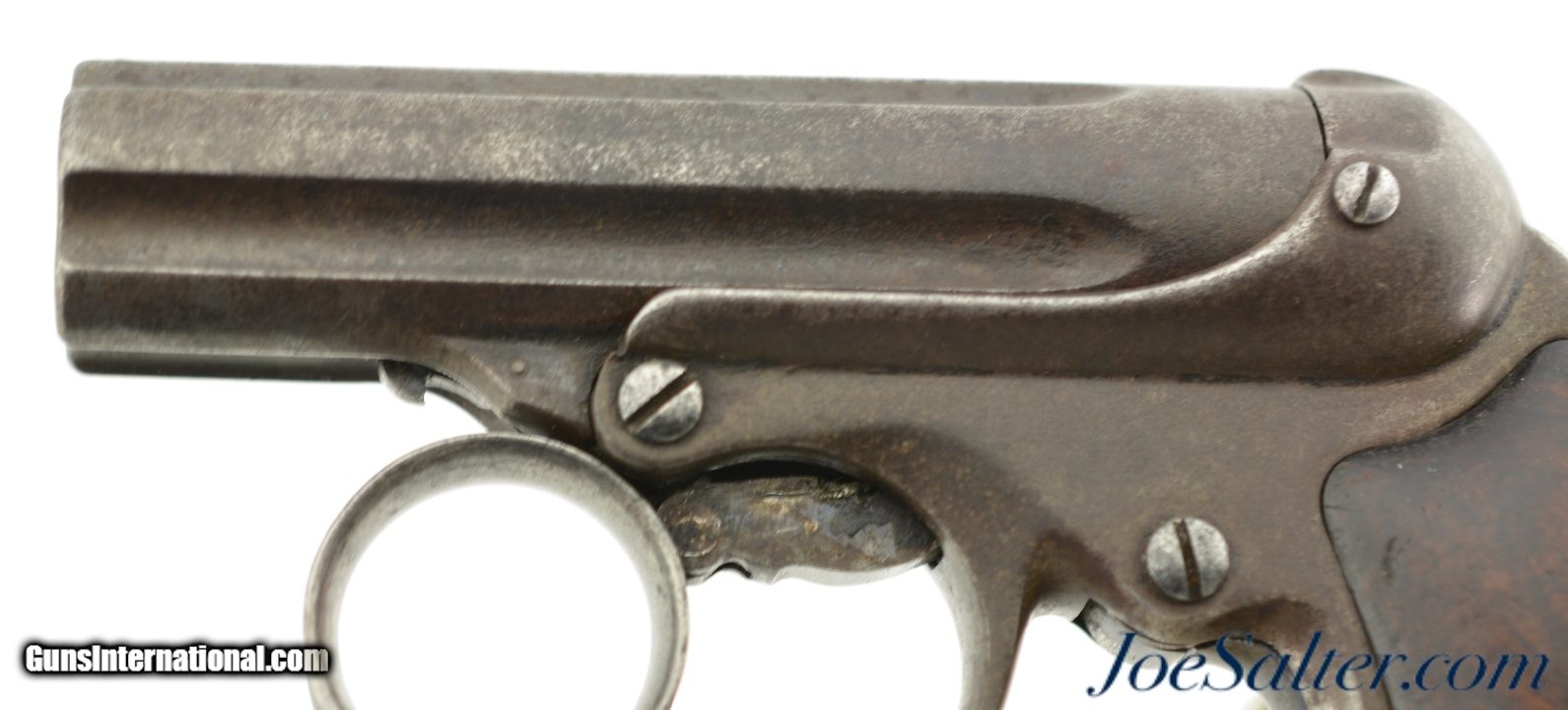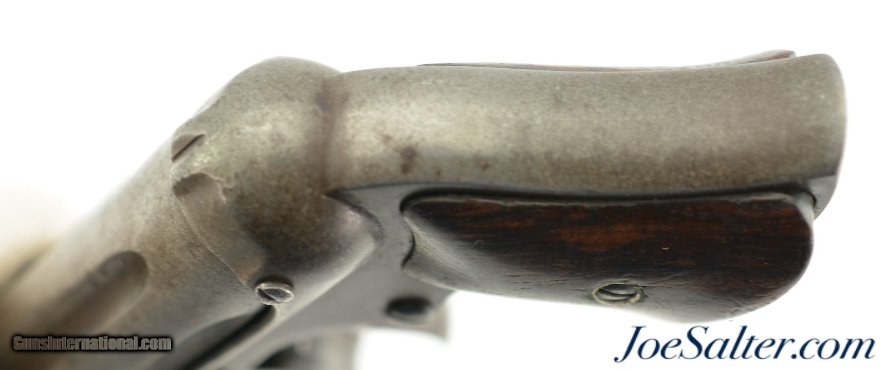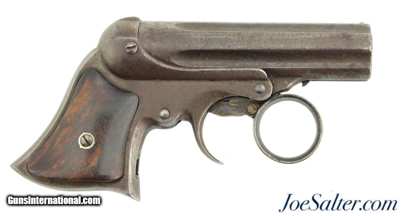Description: Serial #6746, .22 RF, 3 inch barrels with very fine to near excellent barrels with strong rifling and some light pitting spots. This is the Remington-Elliot Deringer manufactured from 1863-1870 and know as the "New Repeating Pistol (Elliot's Pat.) No.1" and was an improved version of the Zig-Zag Deringer. The ring trigger pocket pistol has fixed barrels with a rotating firing pin. In very good to fine overall condition the metal surfaces have toned to pewter-gray with traces of the original blue in the barrel facets and protected areas. The two line name and address on the barrel top is legible but slightly weak. The rose wood grips are solid with light use marks having most of the original finish now worn smooth. Mechanically it functions properly with the firing pin advancing properly on each trigger pull. A very nice example of this neat Remington pocket pistol. Antique SOLD Antique: Yes |