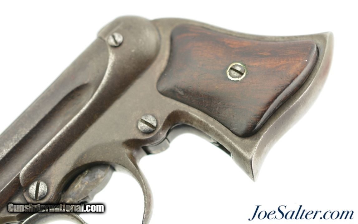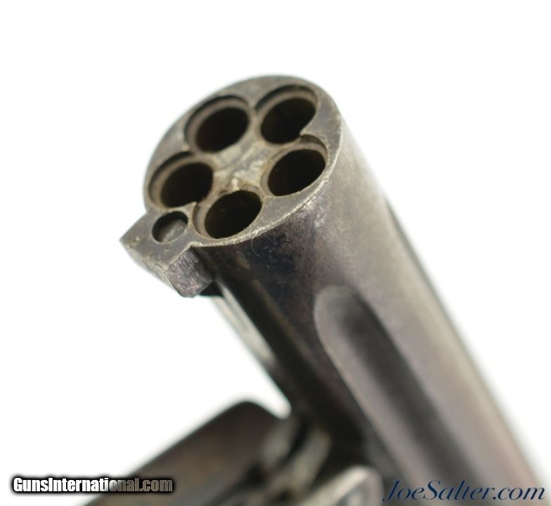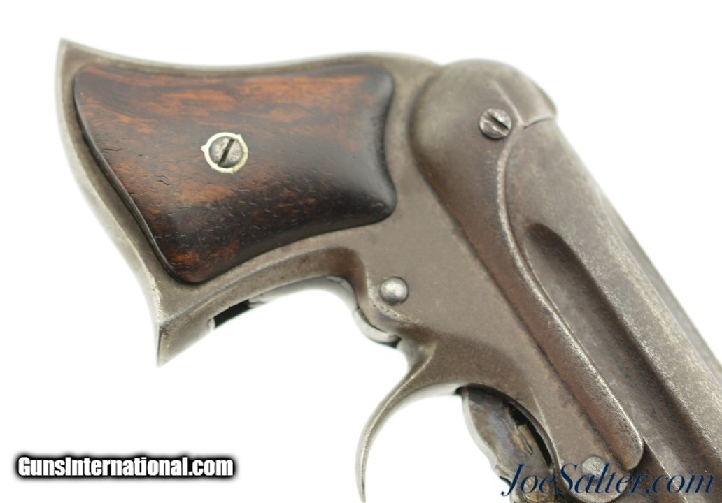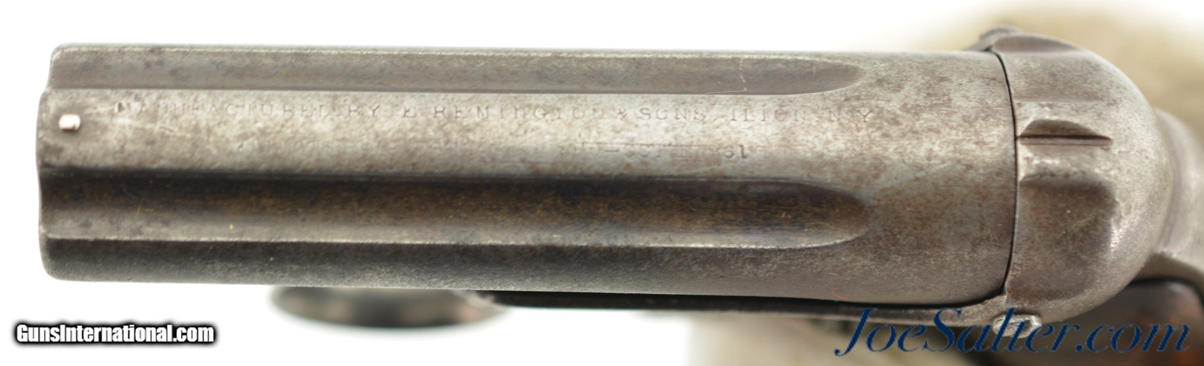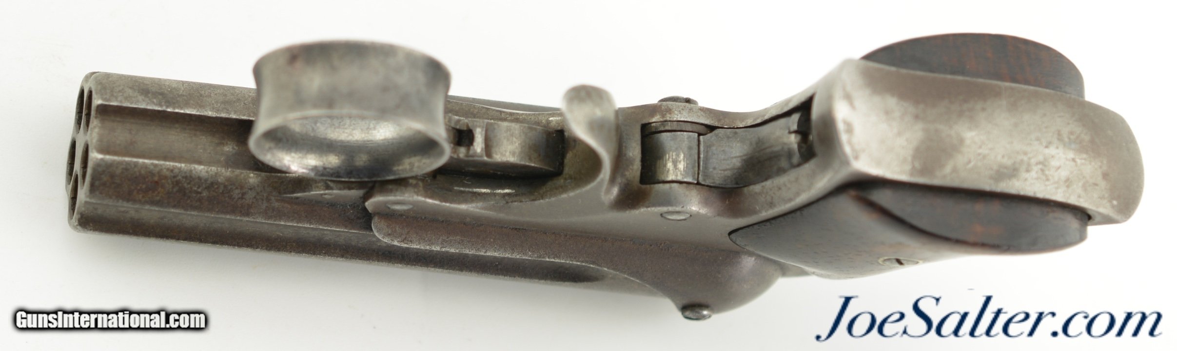 Description: Serial #6746, .22 RF, 3 inch barrels with very fine to near excellent barrels with strong rifling and some light pitting spots. This is the Remington-Elliot Deringer manufactured from 1863-1870 and know as the "New Repeating Pistol (Elliot's Pat.) No.1" and was an improved version of the Zig-Zag Deringer. The ring trigger pocket pistol has fixed barrels with a rotating firing pin. In very good to fine overall condition the metal surfaces have toned to pewter-gray with traces of the original blue in the barrel facets and protected areas. The two line name and address on the barrel top is legible but slightly weak. The rose wood grips are solid with light use marks having most of the original finish now worn smooth. Mechanically it functions properly with the firing pin advancing properly on each trigger pull. A very nice example of this neat Remington pocket pistol. Antique SOLD Antique: Yes |