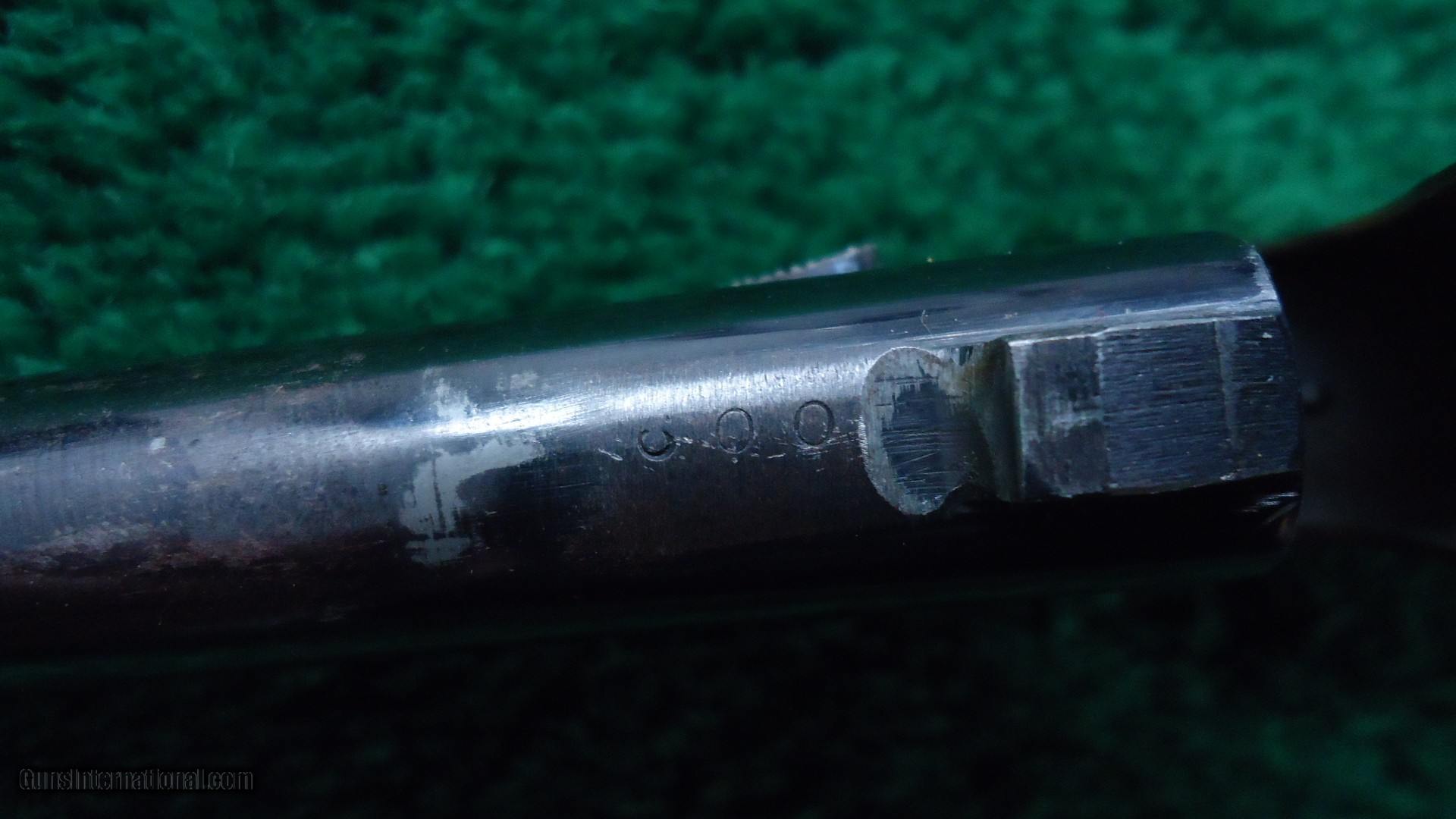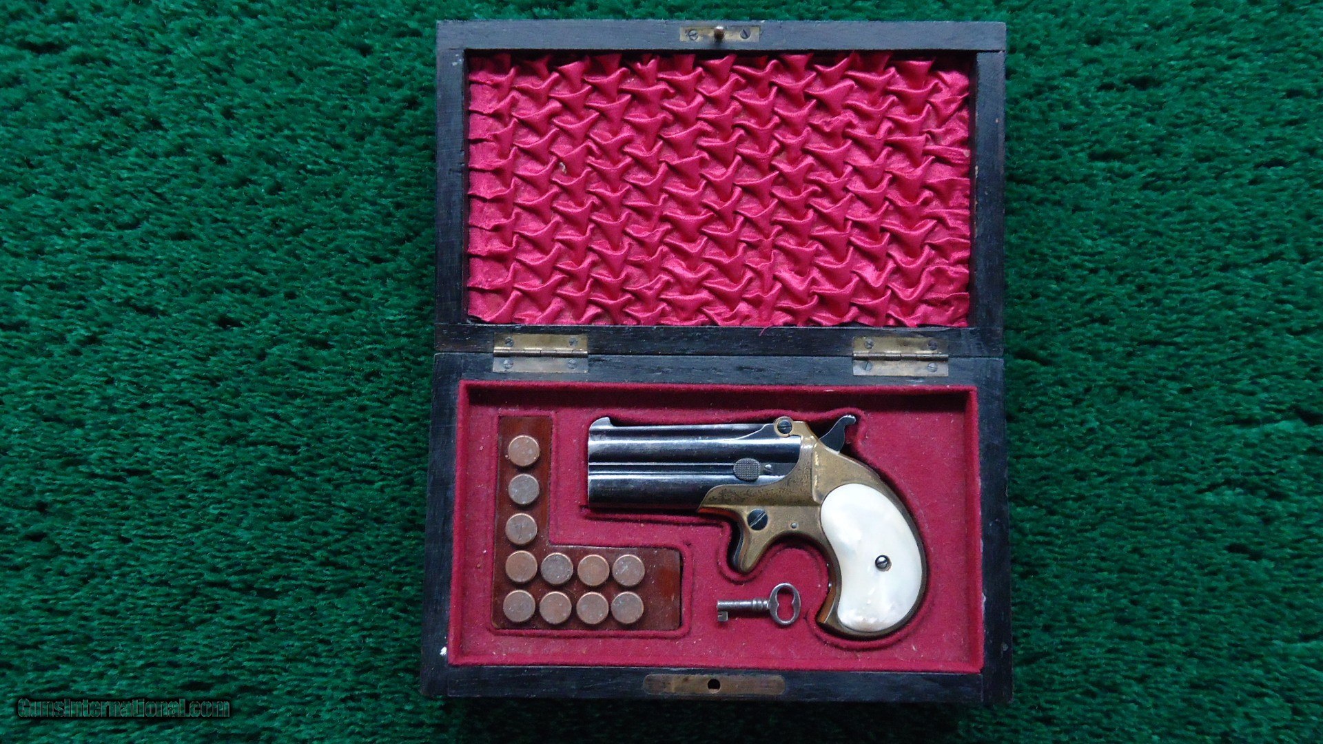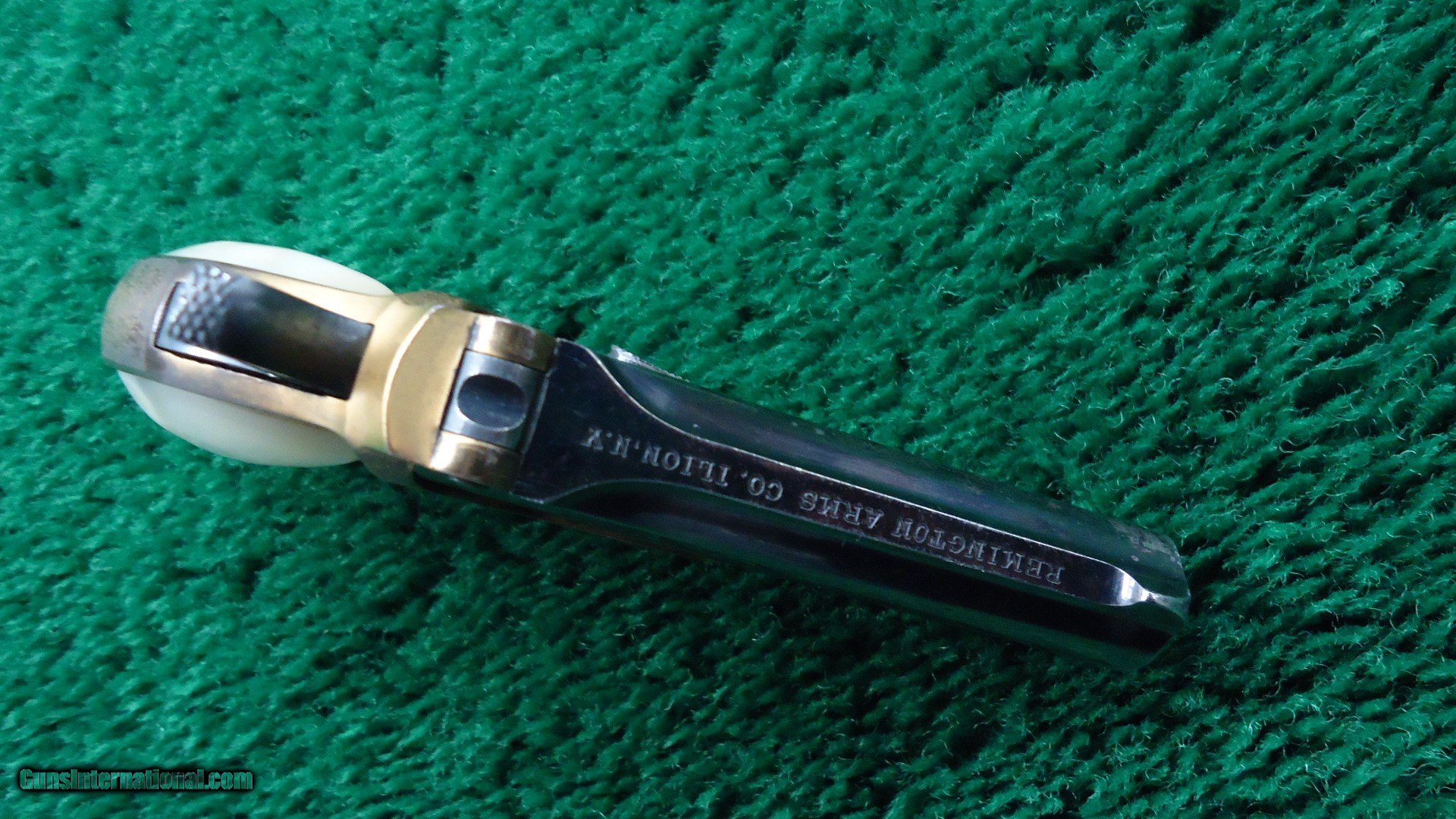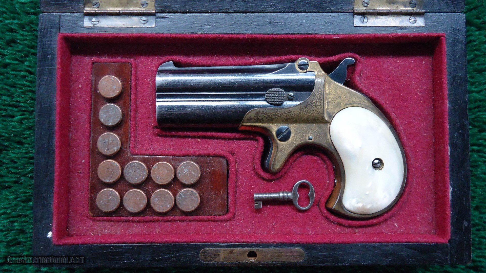 Description: 41 caliber. Elaborately engraved with a leaf pattern on the entire gold finish frame and backstrap. Barrels are a high polish blue with just some wear at the muzzle edge. Trigger and hammer retain most of their blue. Mother of Pearl grips are in very good condition. Nice action and bright shiny bores. Gun is fitted in a nice walnut case that may have been relined. Cartridge block included holds 11 cartridges. Original key is present. A very nice little Remington! Leroy Merz Antique Firearms specializes in antique and vintage Winchesters and other fine American firearms. Since 1965 Mr. Merz has taken part in the world of firearms and has been a contributor to many well known reference books. We have hundreds of additional guns in every price range at our home online. Search for Merz Antiques in google. SOLD Antique: Yes Handgun Caliber: .41 Rimfire |